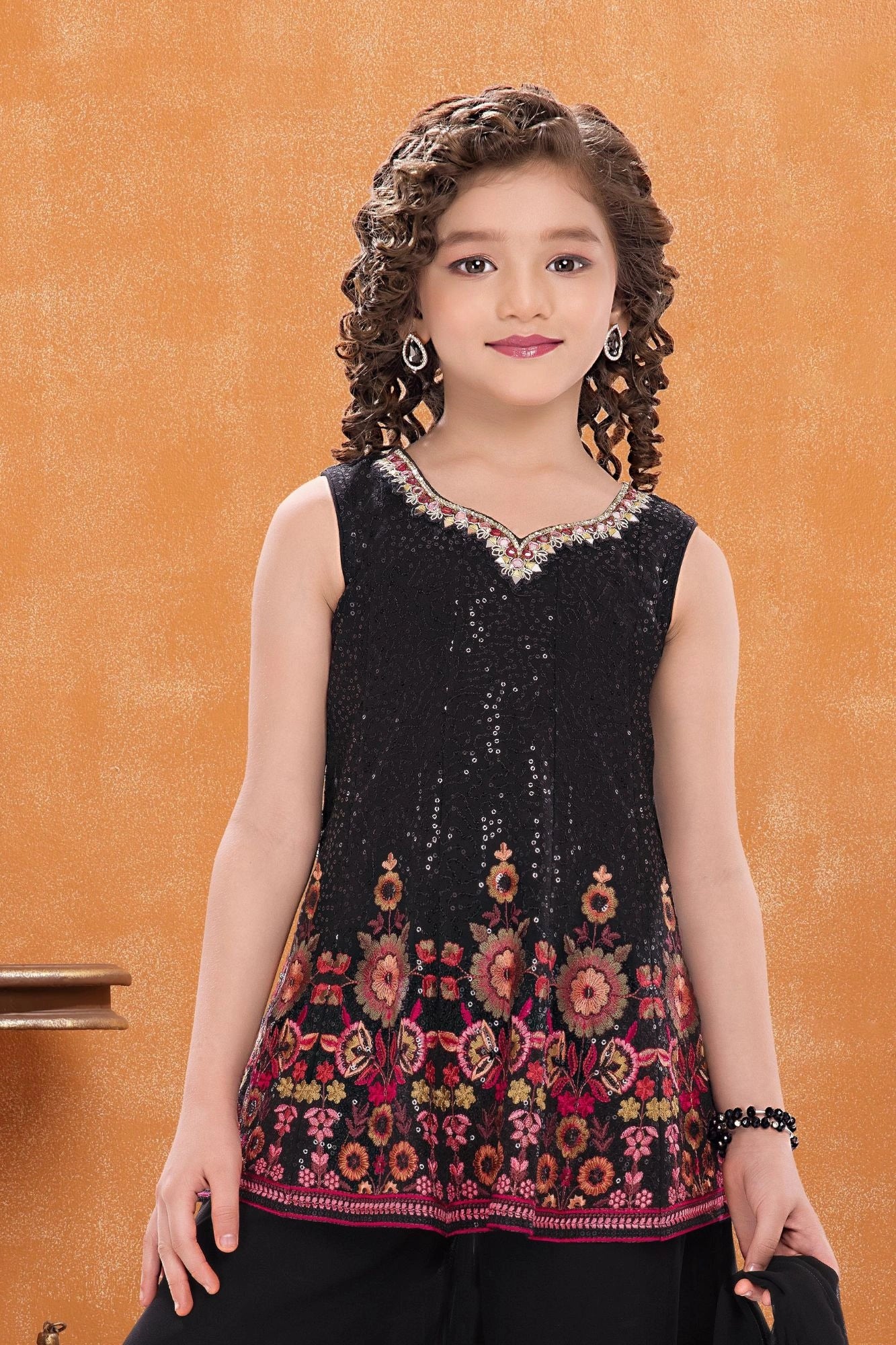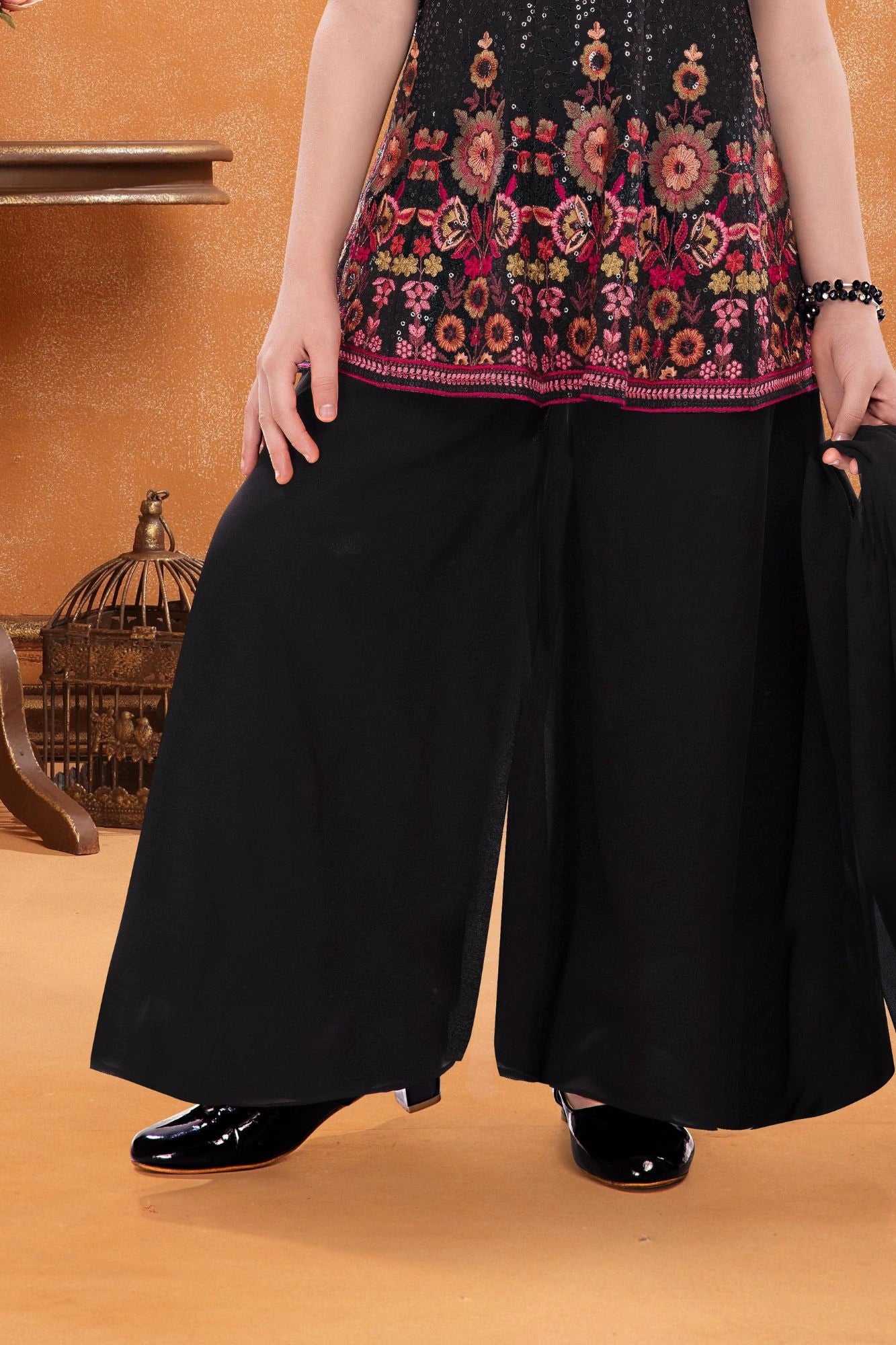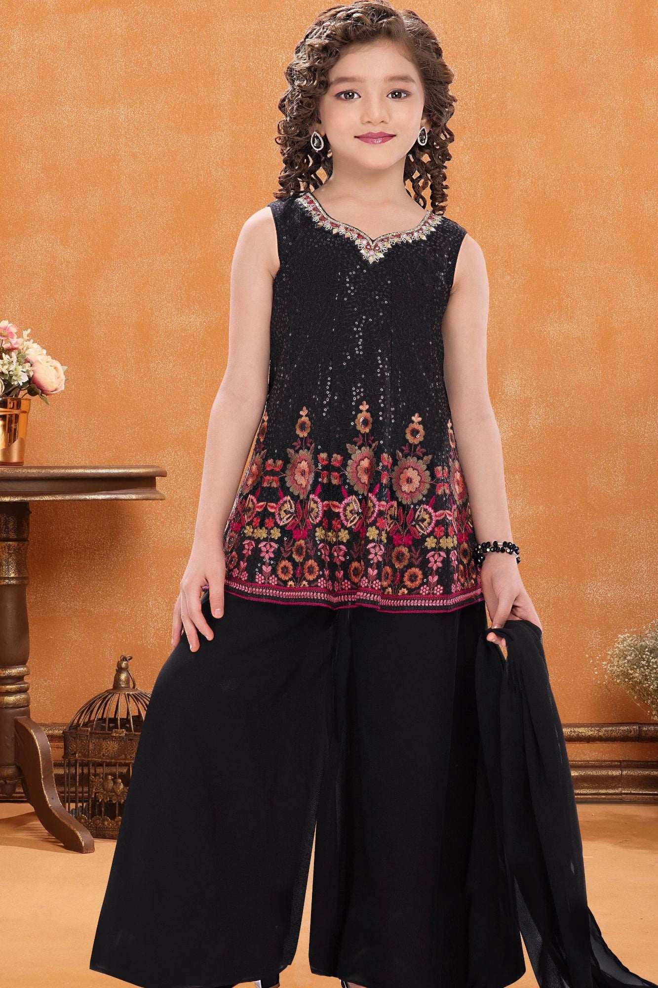 Black Sequin Embroidered Palazzo Set with Dupatta For Girls