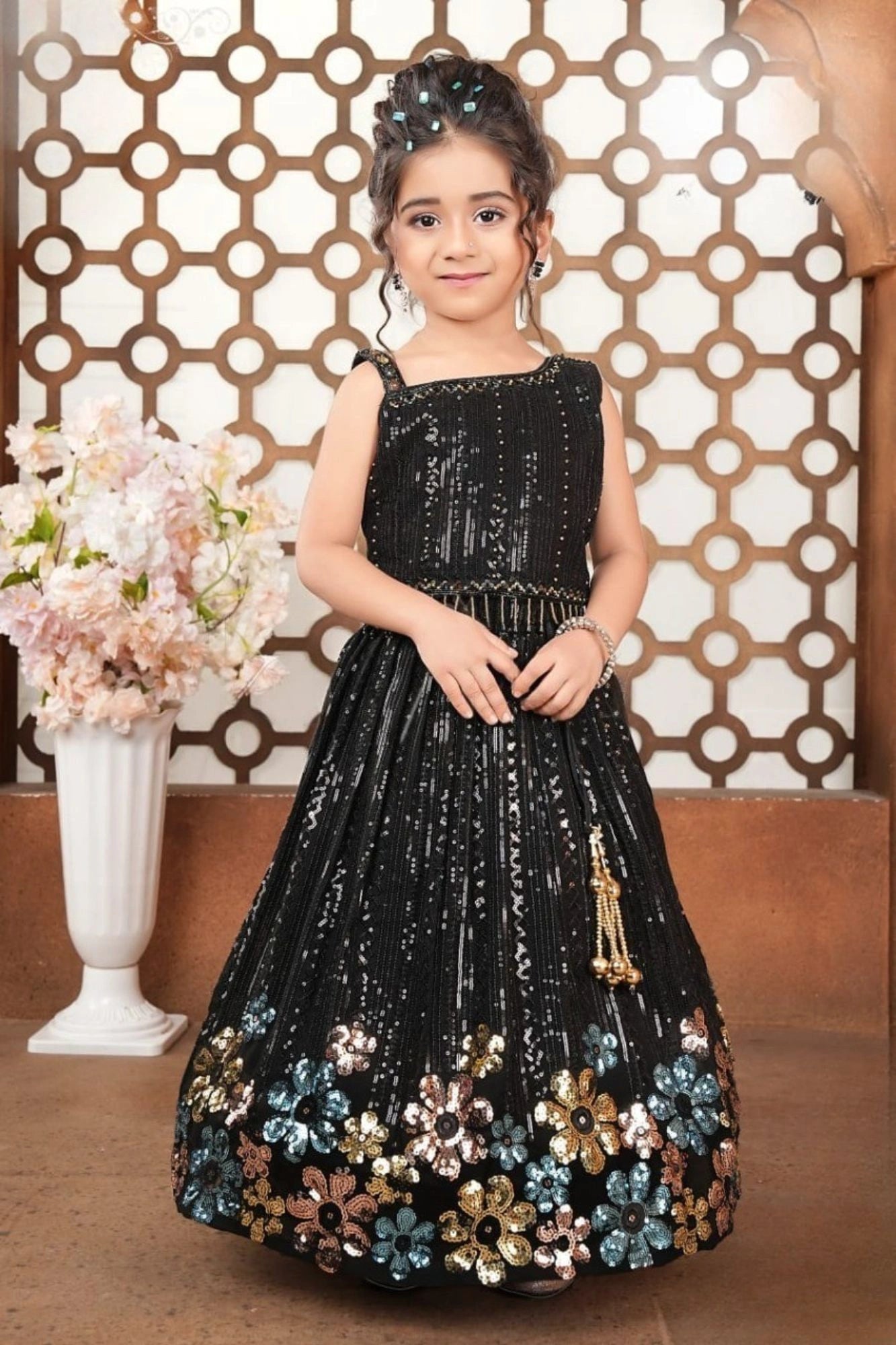 Black Sequin Floral Lehenga Choli with Beaded Tassel For Girls