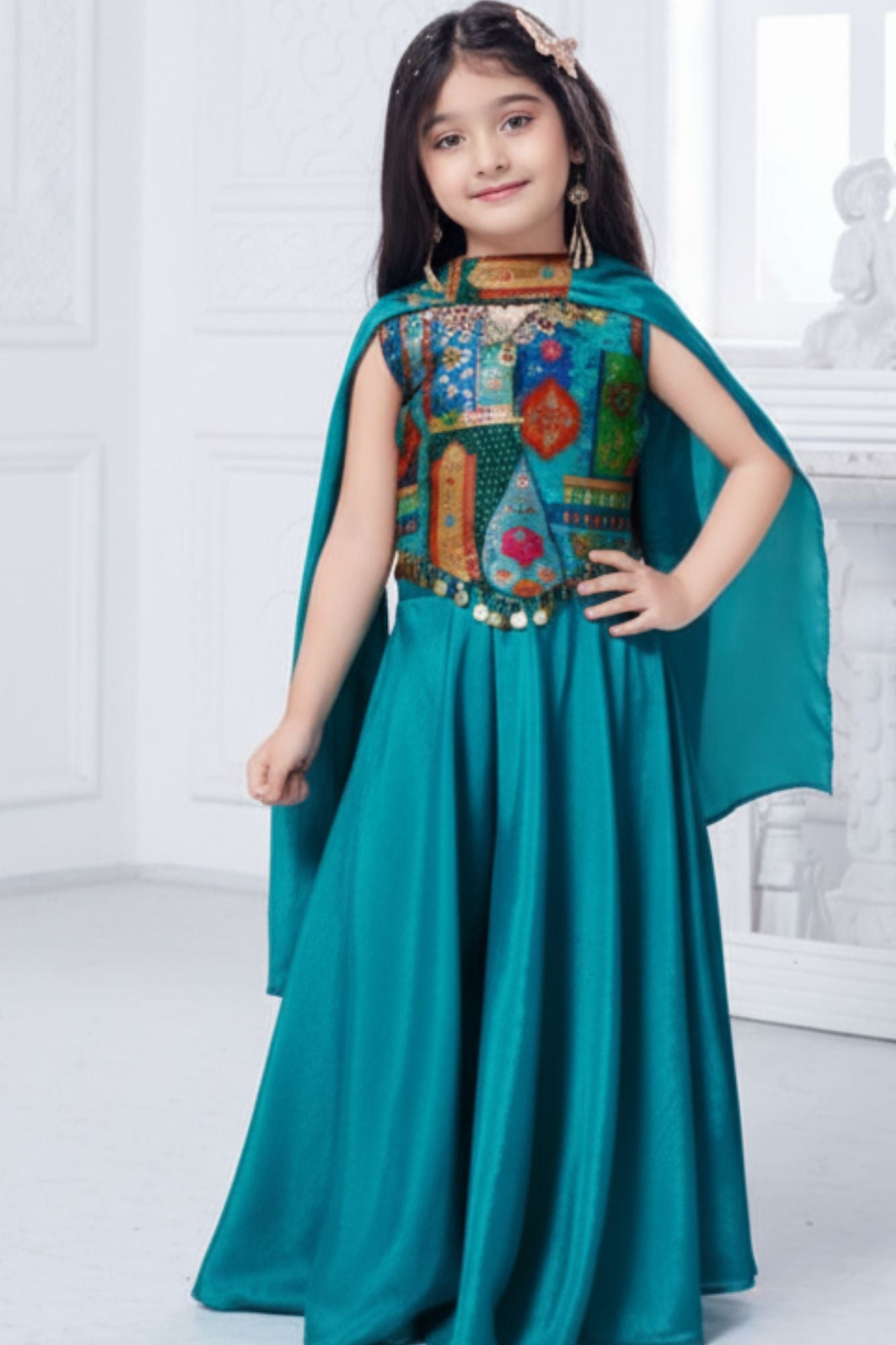 Blue Embellished Palazzo Set with Coin Lace Detailing For Girls