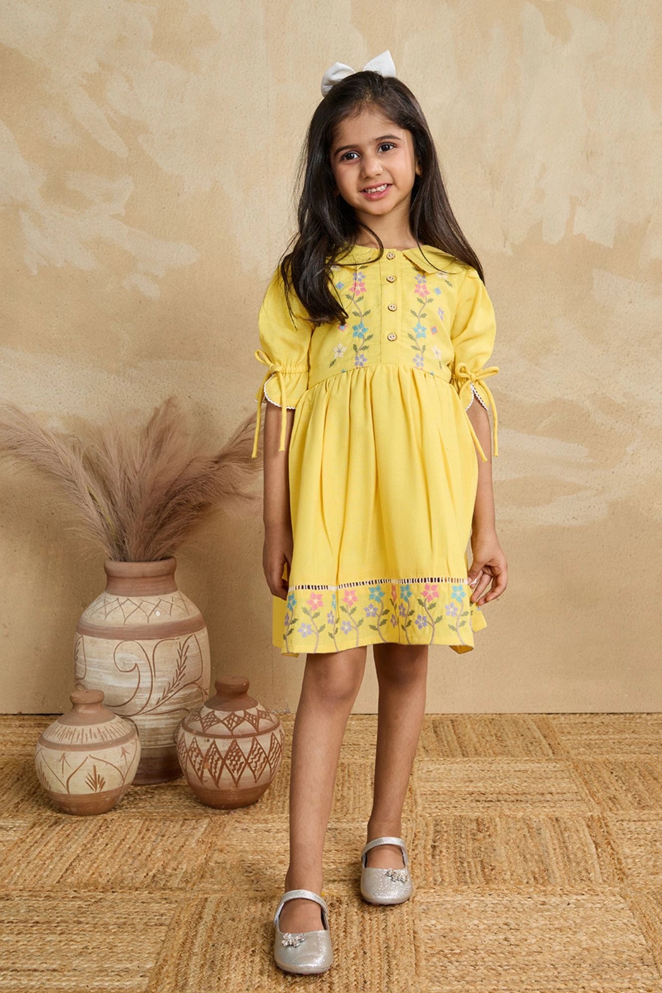 Bright Yellow Floral Embroidered Cotton Dress with Puff Sleeves For Girls