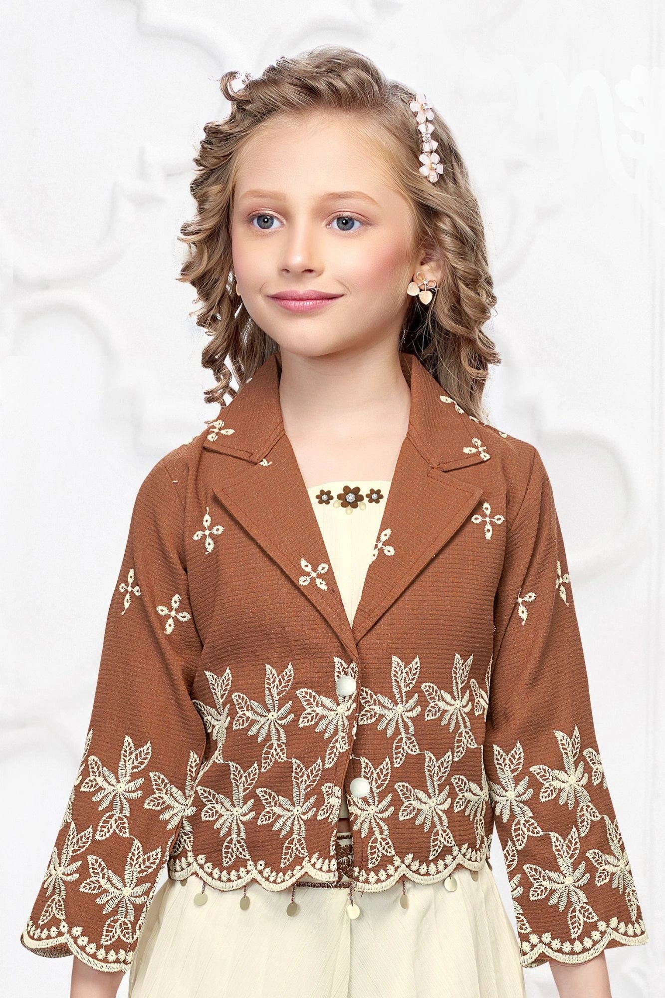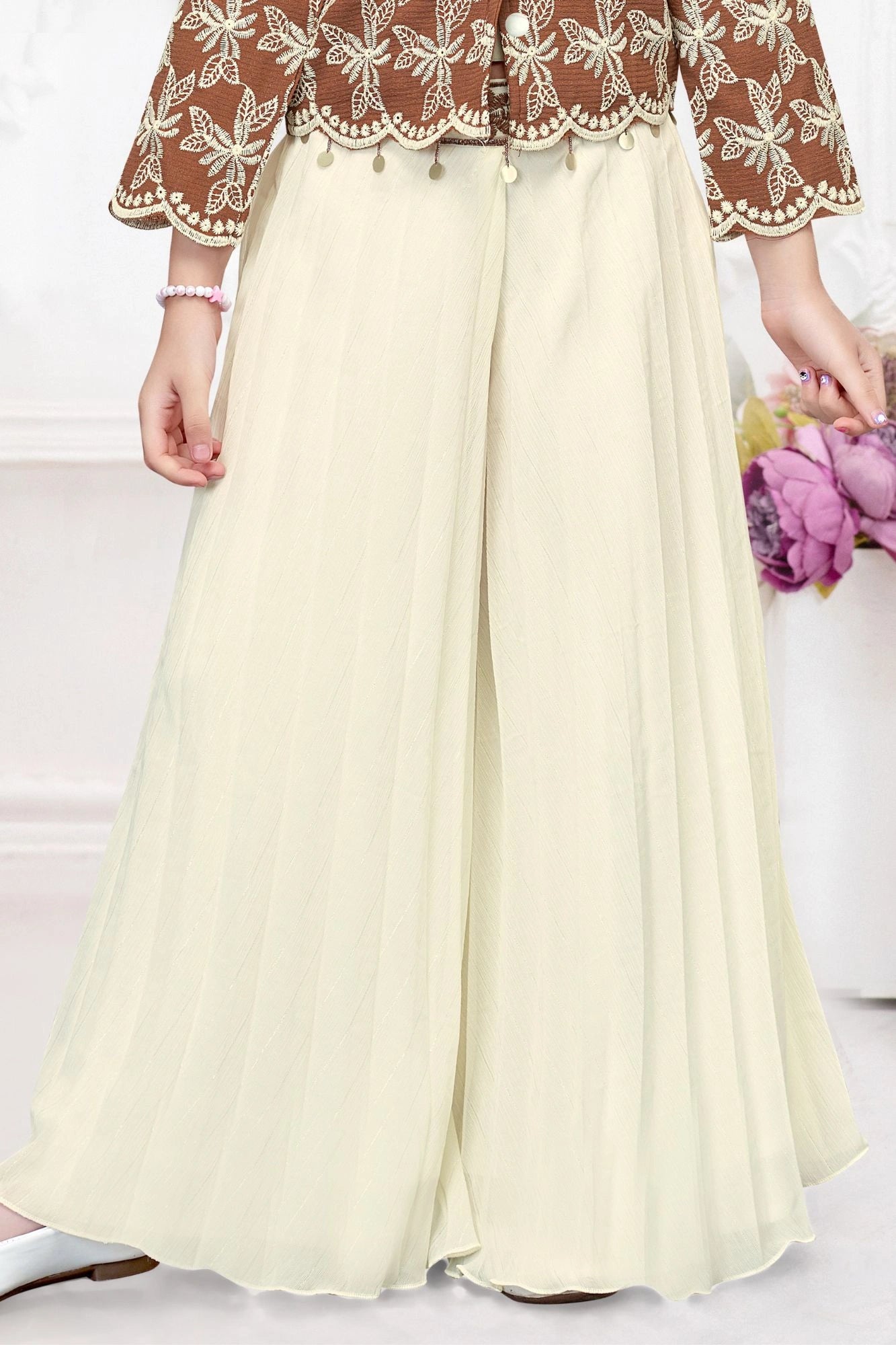 Brown and Cream Embroidered Wide Legged Pant Set With Jacket For Girls