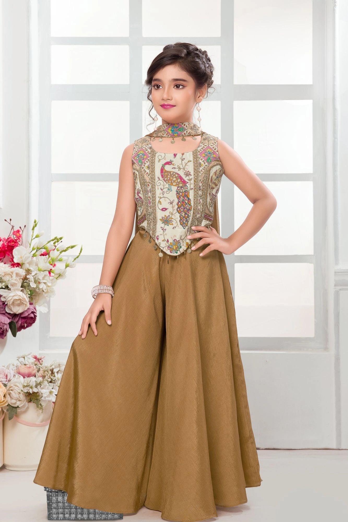 Brown & Gold Peacock Embroidered Palazzo Set with Dupatta For Girls