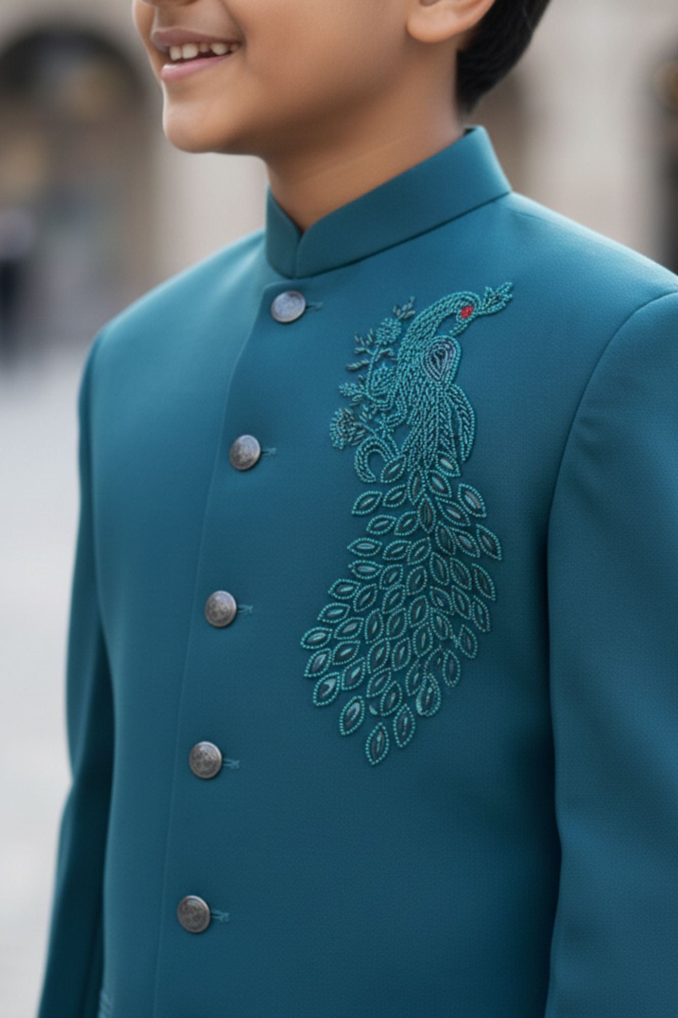 Classic Teal Green Jhodhpuri Suit Set For Boys