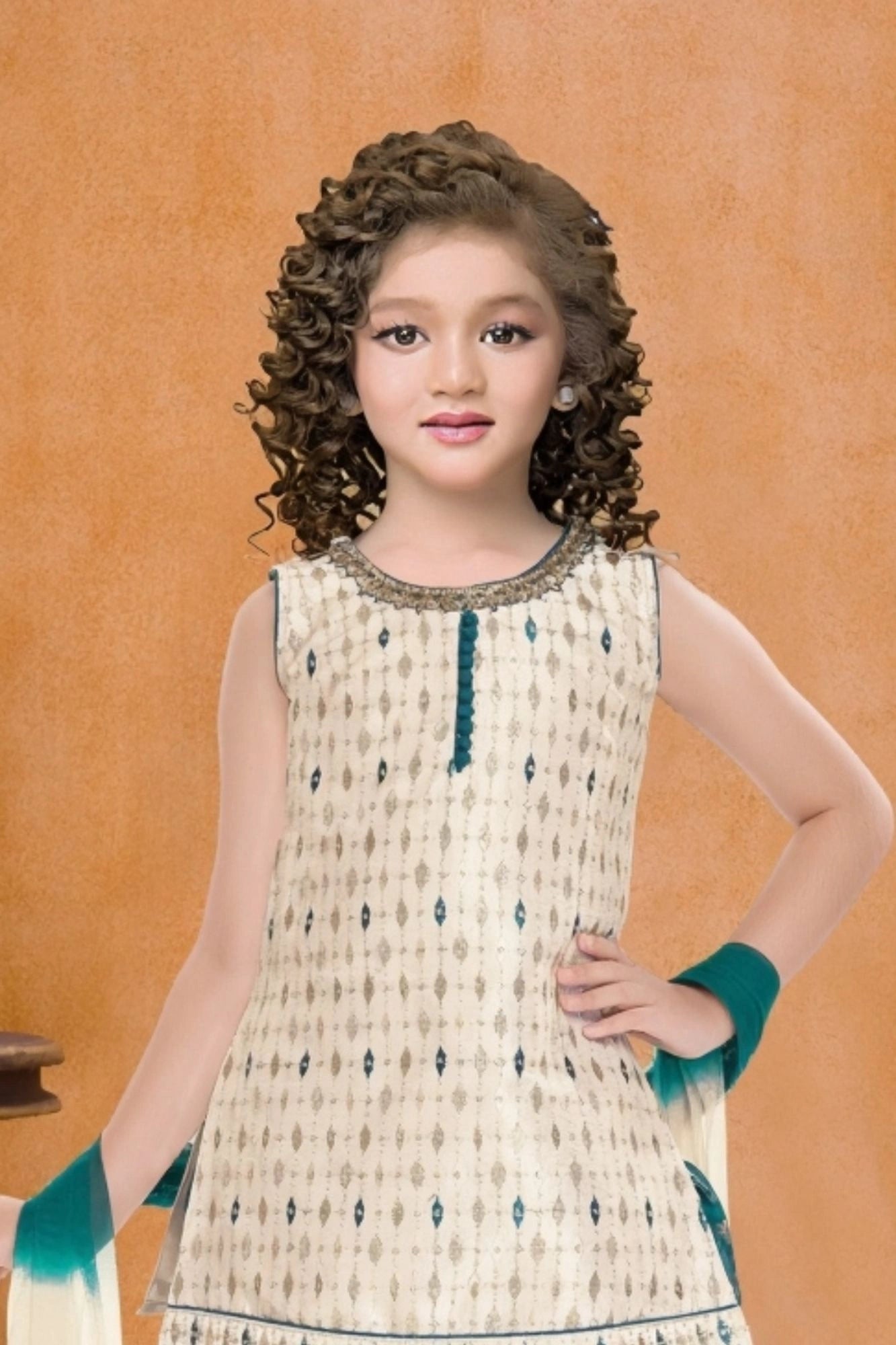 Cream and Firozi Patiala Set With Embroidered Kurti And Dupatta For Girls