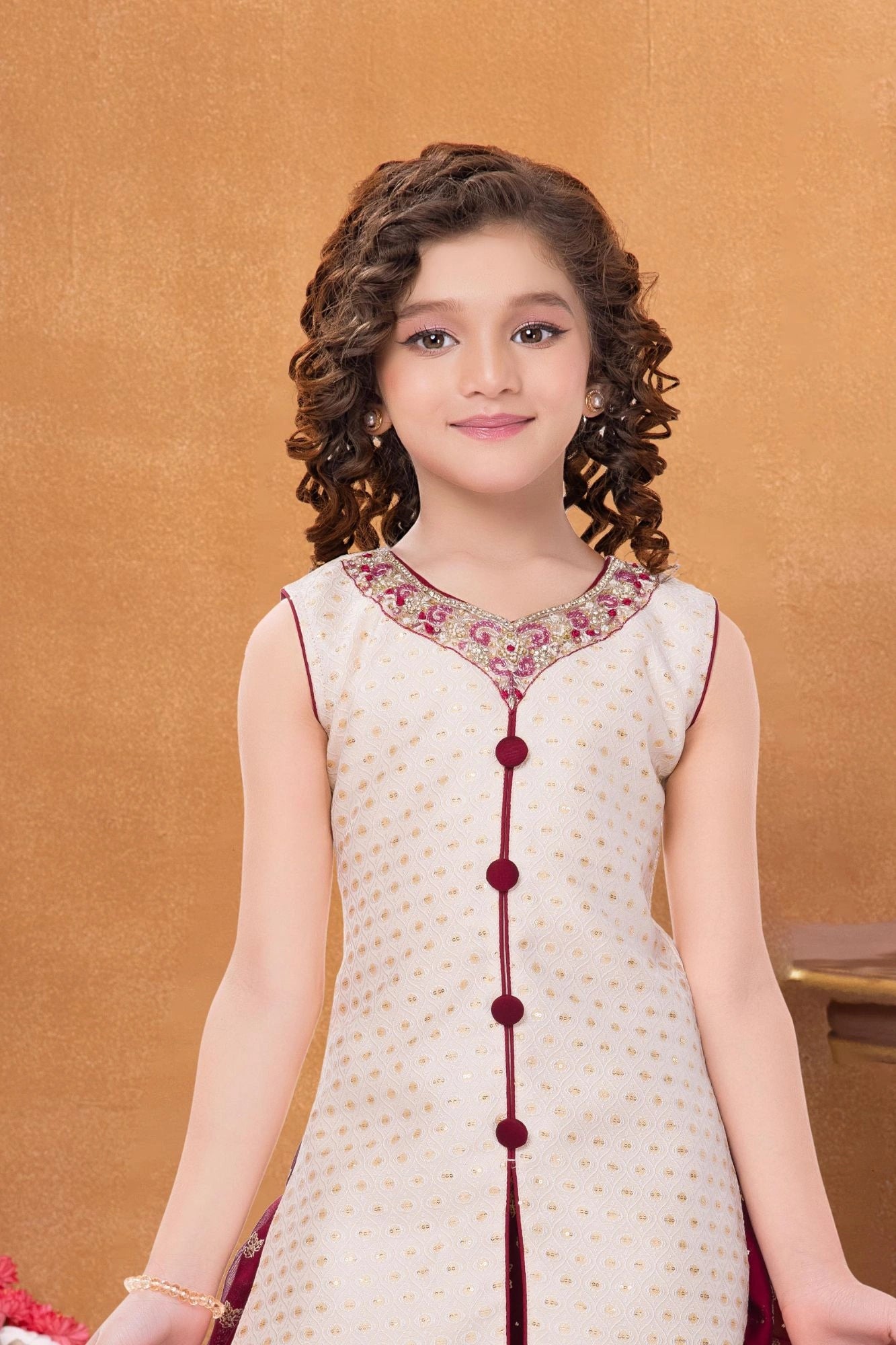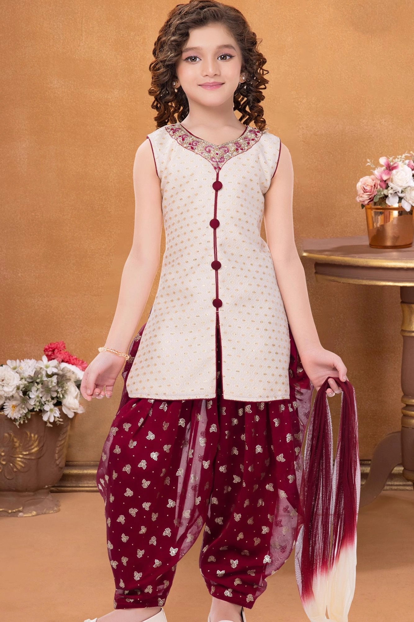Cream and Maroon Embroidered Patiala Set with Dupatta For Girls
