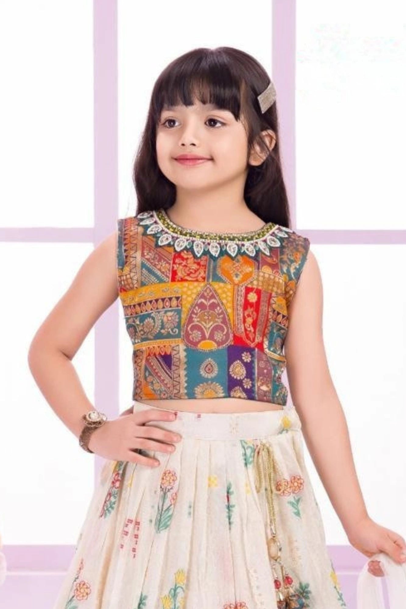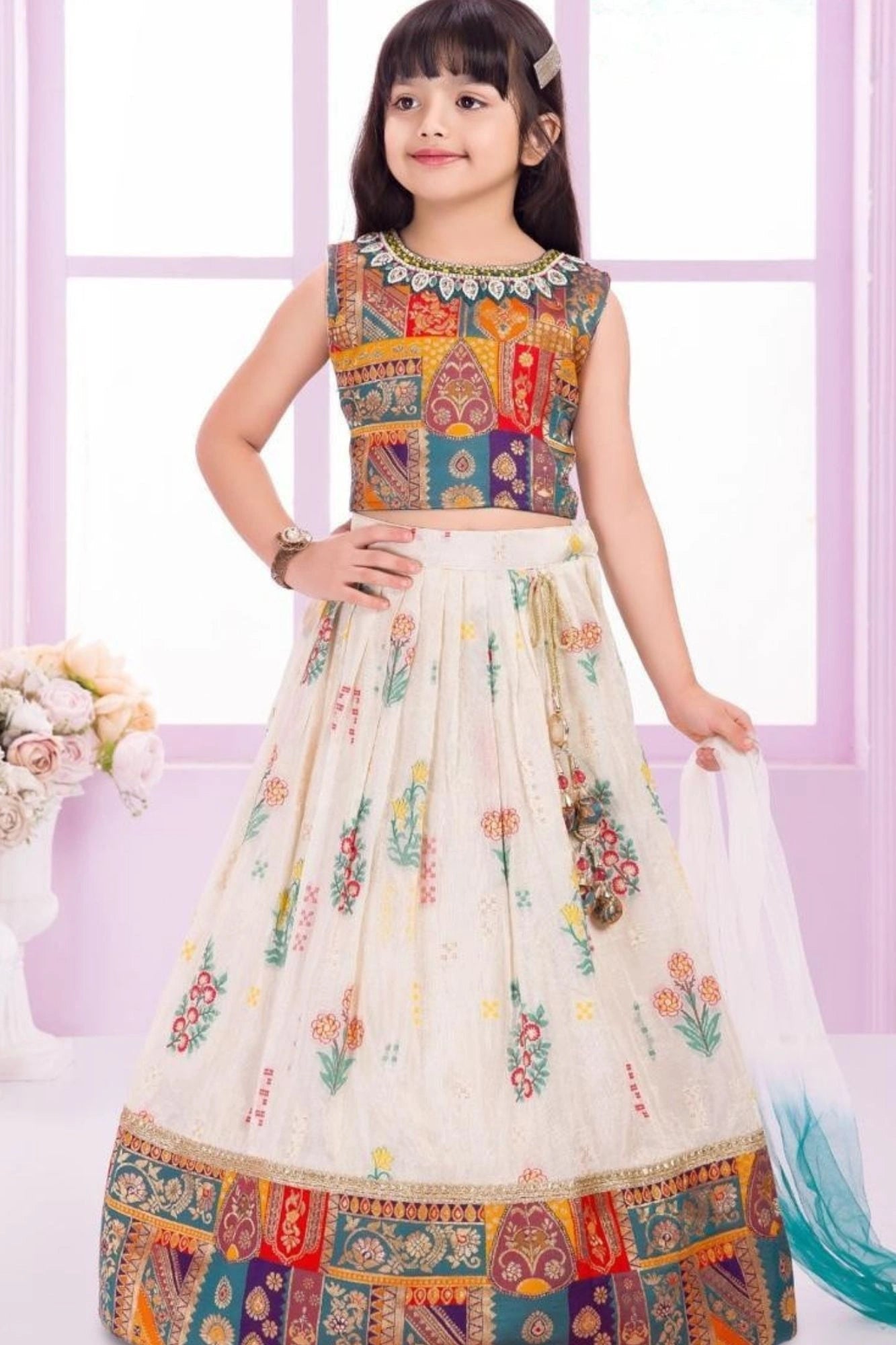 Cream And Multicolor Floral Print And Traditional Patchwork Lehenga Choli For Girls