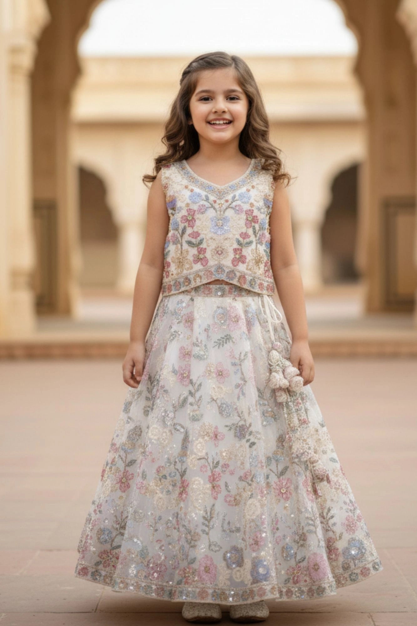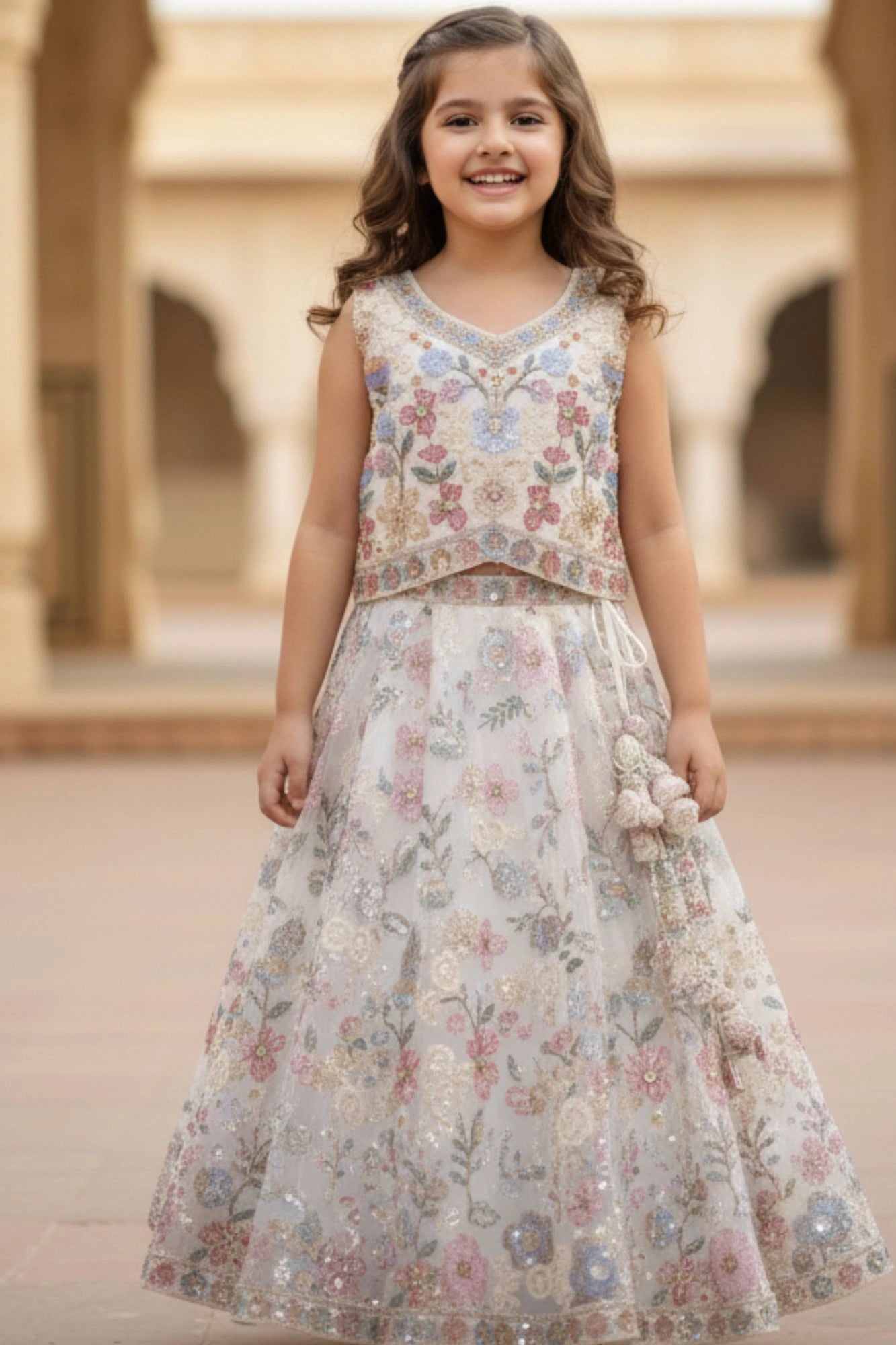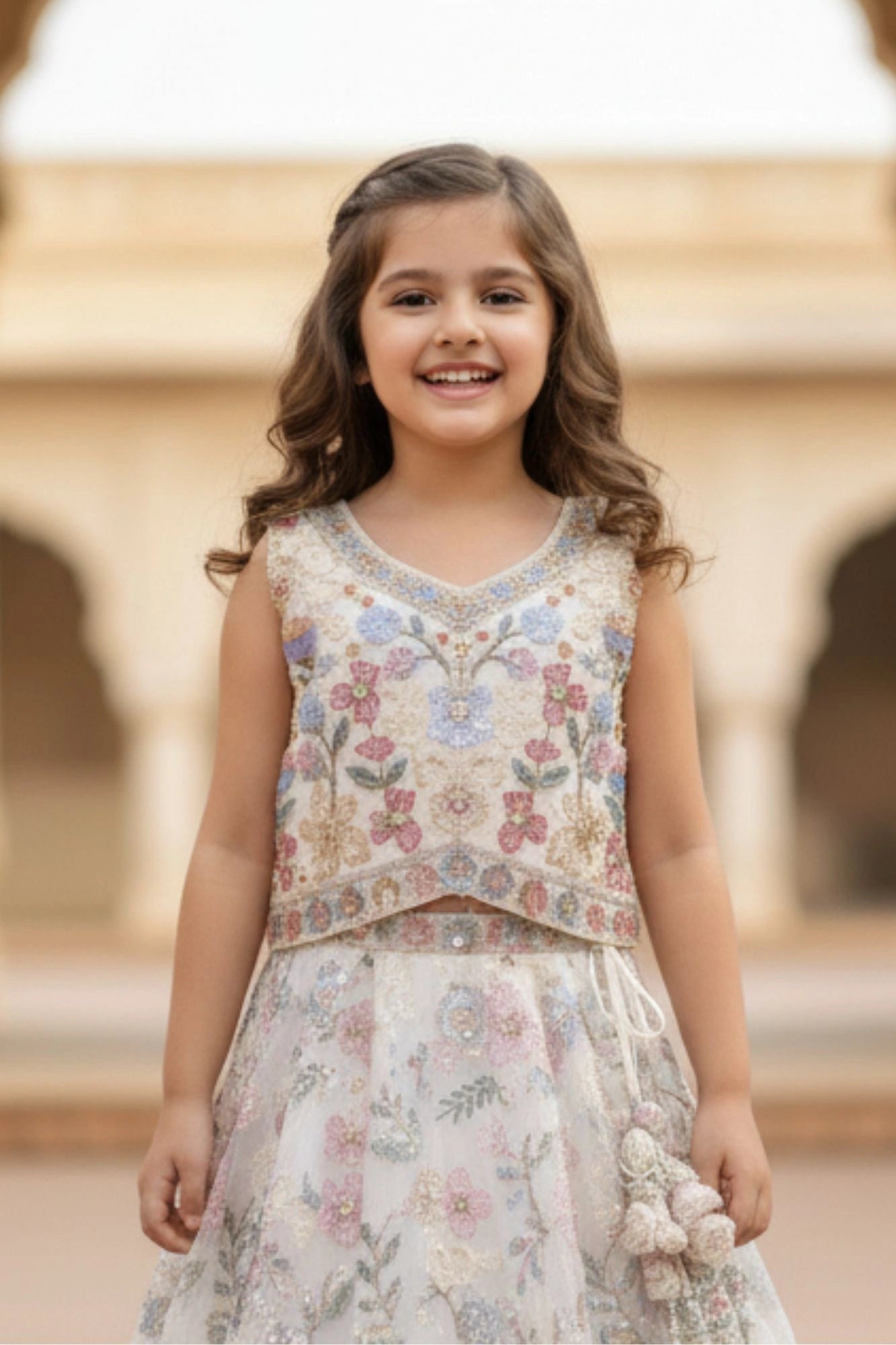 Cream And Pastel Embroidered Lehenga Choli for Girls