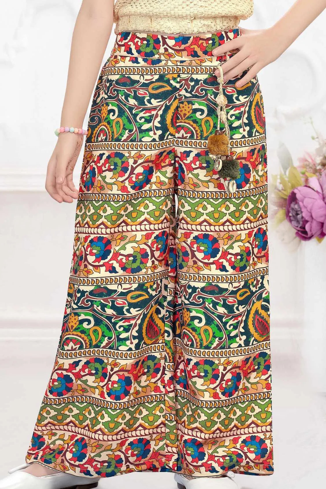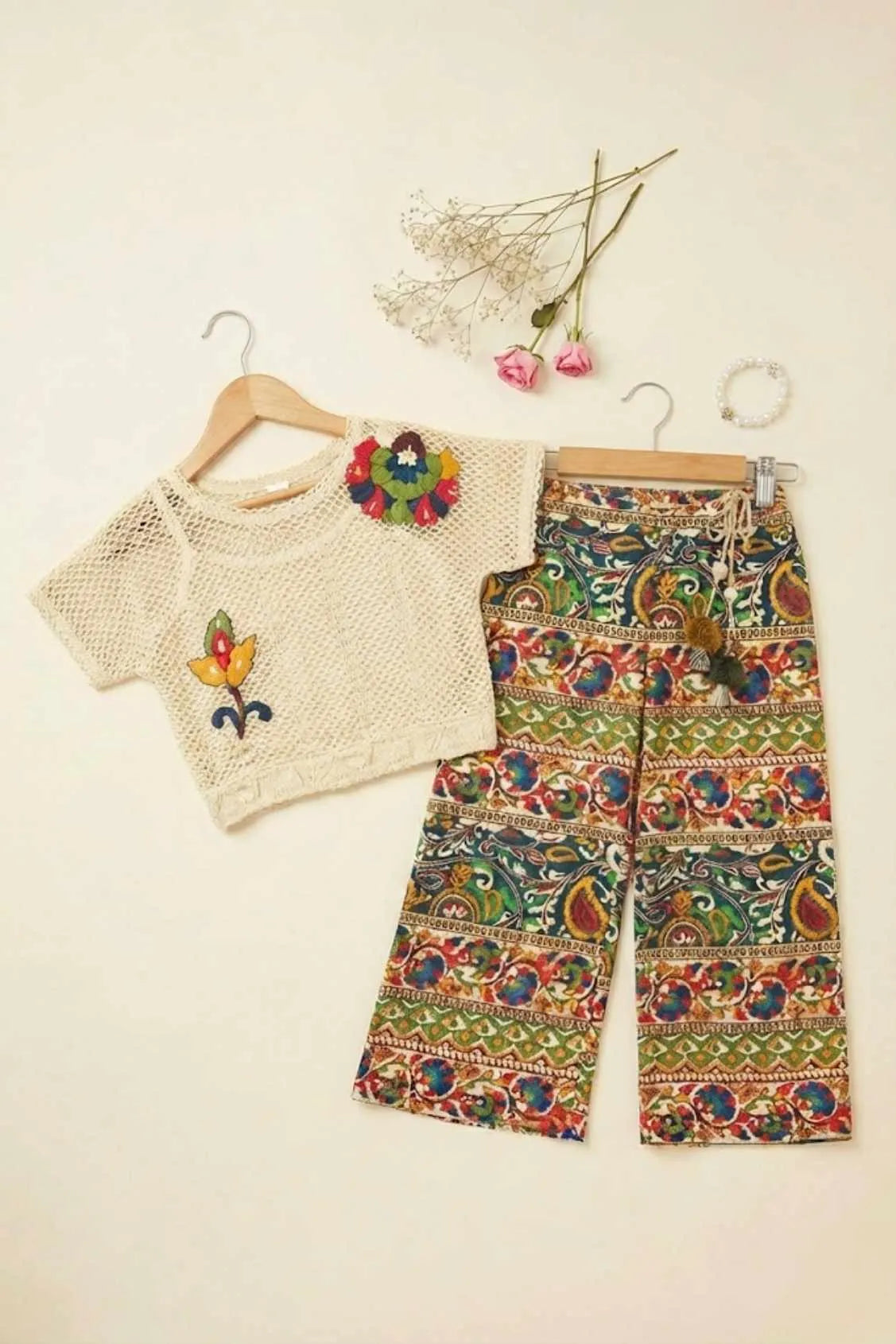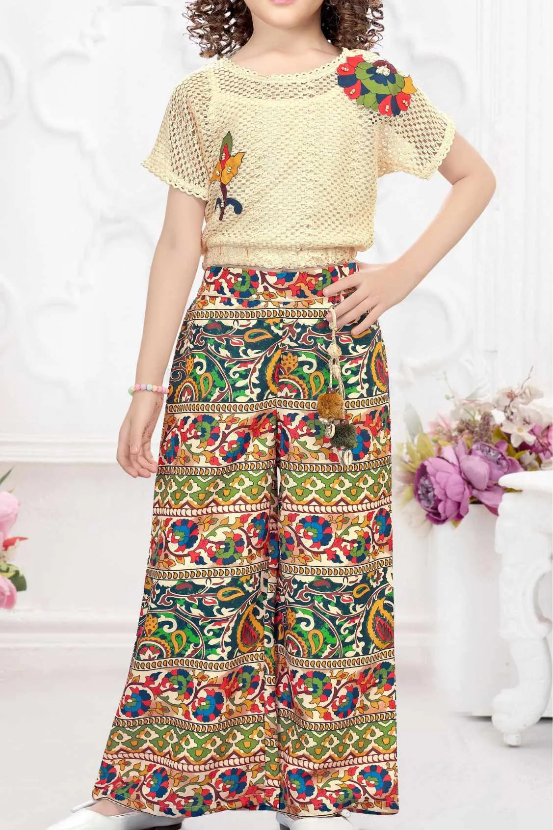 Cream Crochet Top With Multicolor Pants Set For Girls