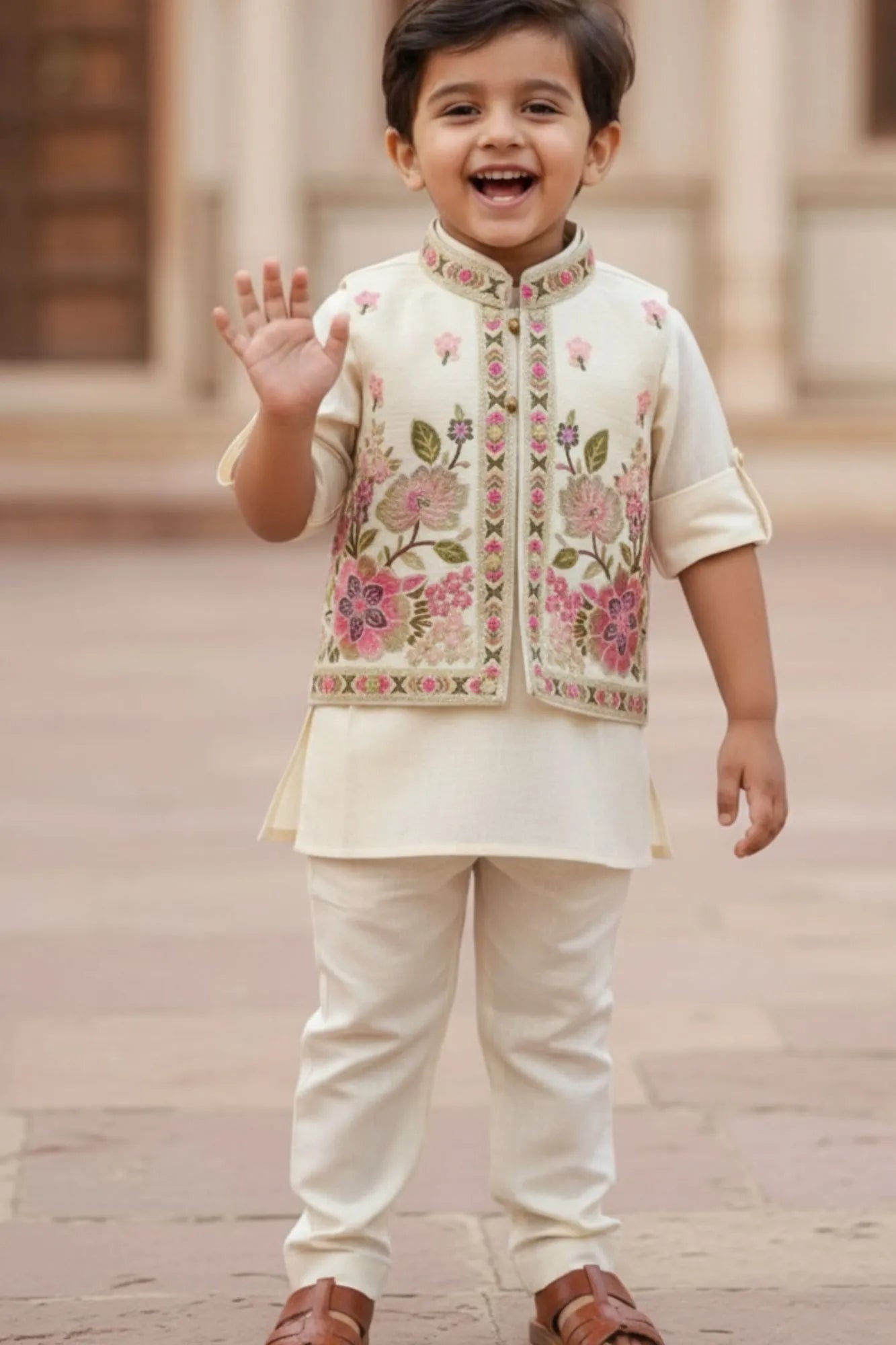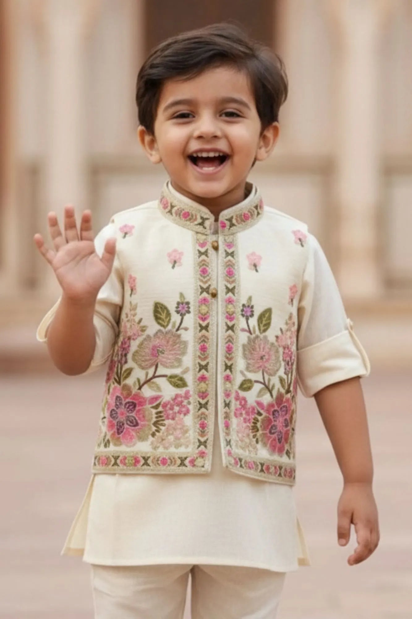 Cream Embroidered Kurta Set with Nehru Jacket For Boys