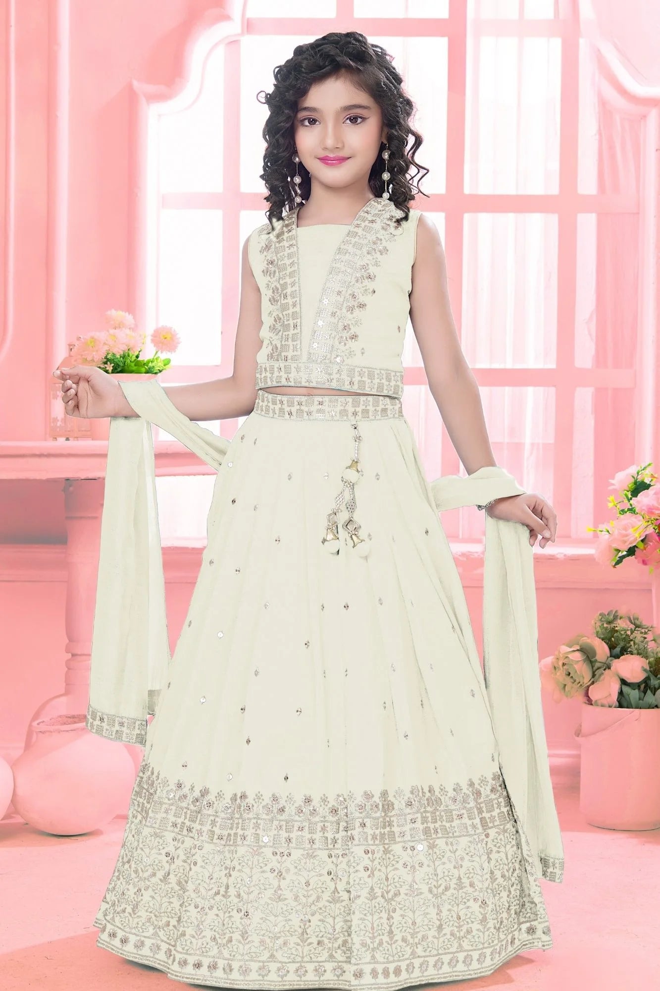 Cream Embroidered Lehenga Choli Set with Dupatta For Girls
