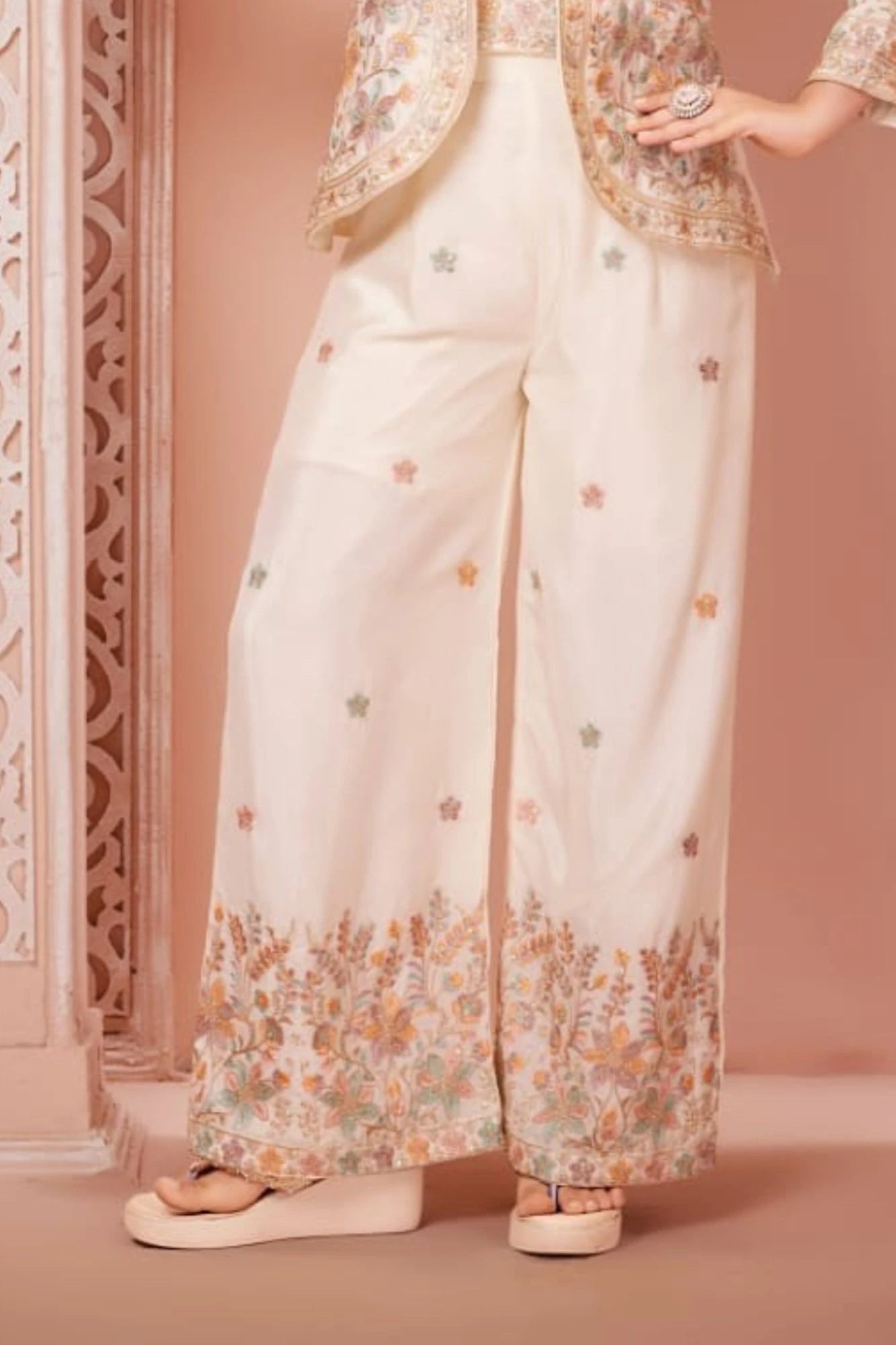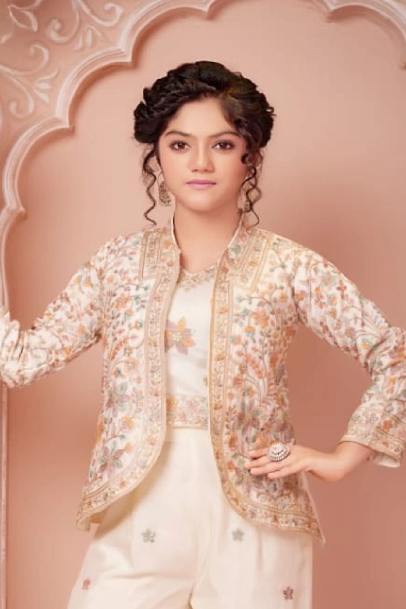 Cream Floral Embroidered Ethnic Co-Ord Set with Jacket for Girls