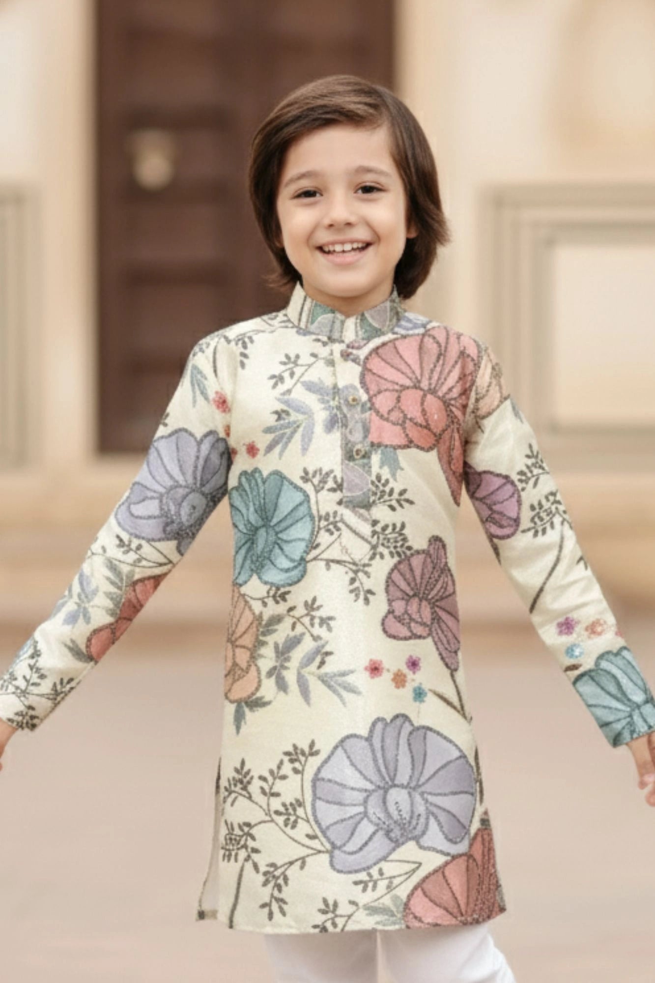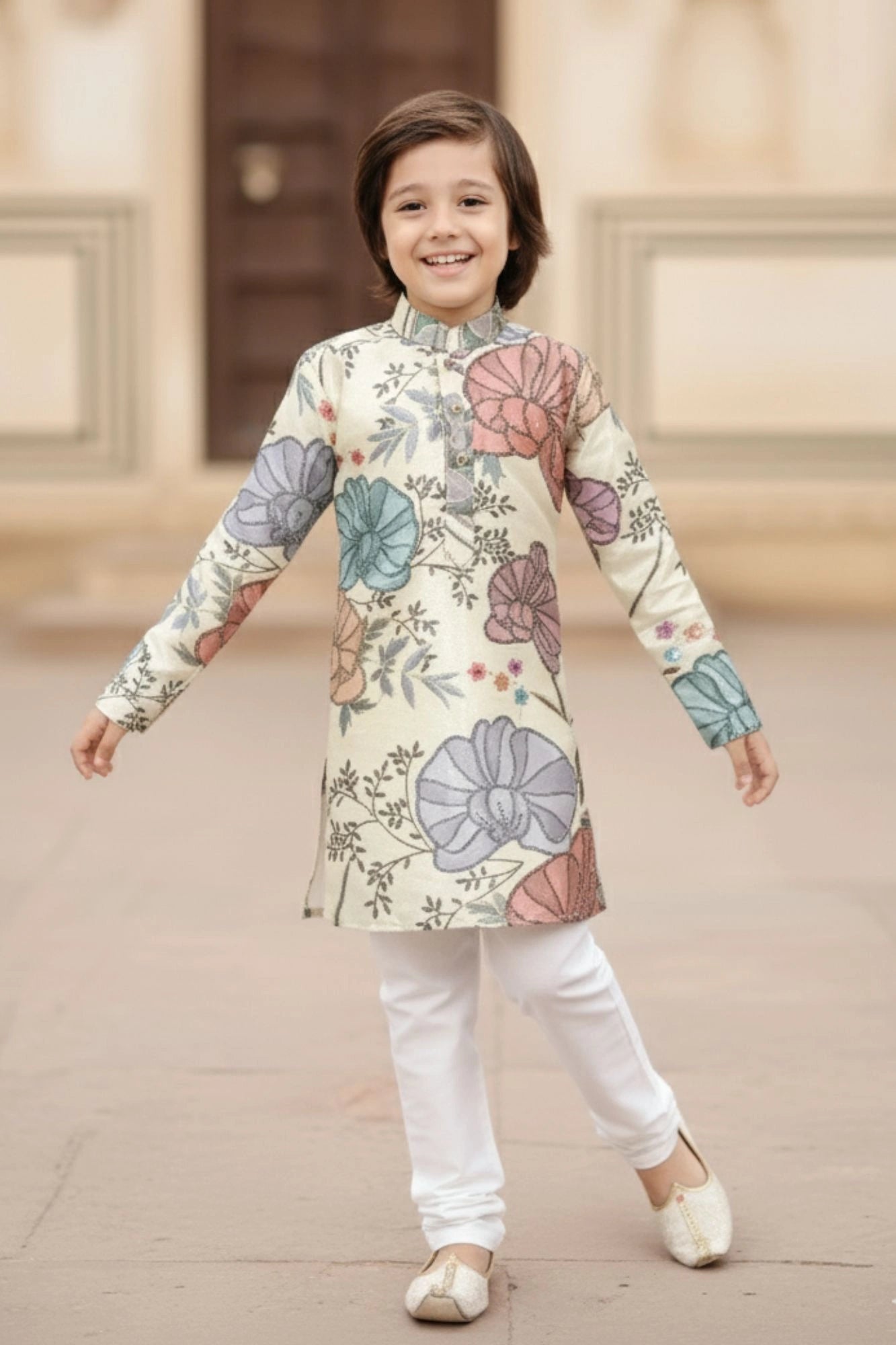 Cream Multicolor Floral Printed Kurta with White Pajama For Boys