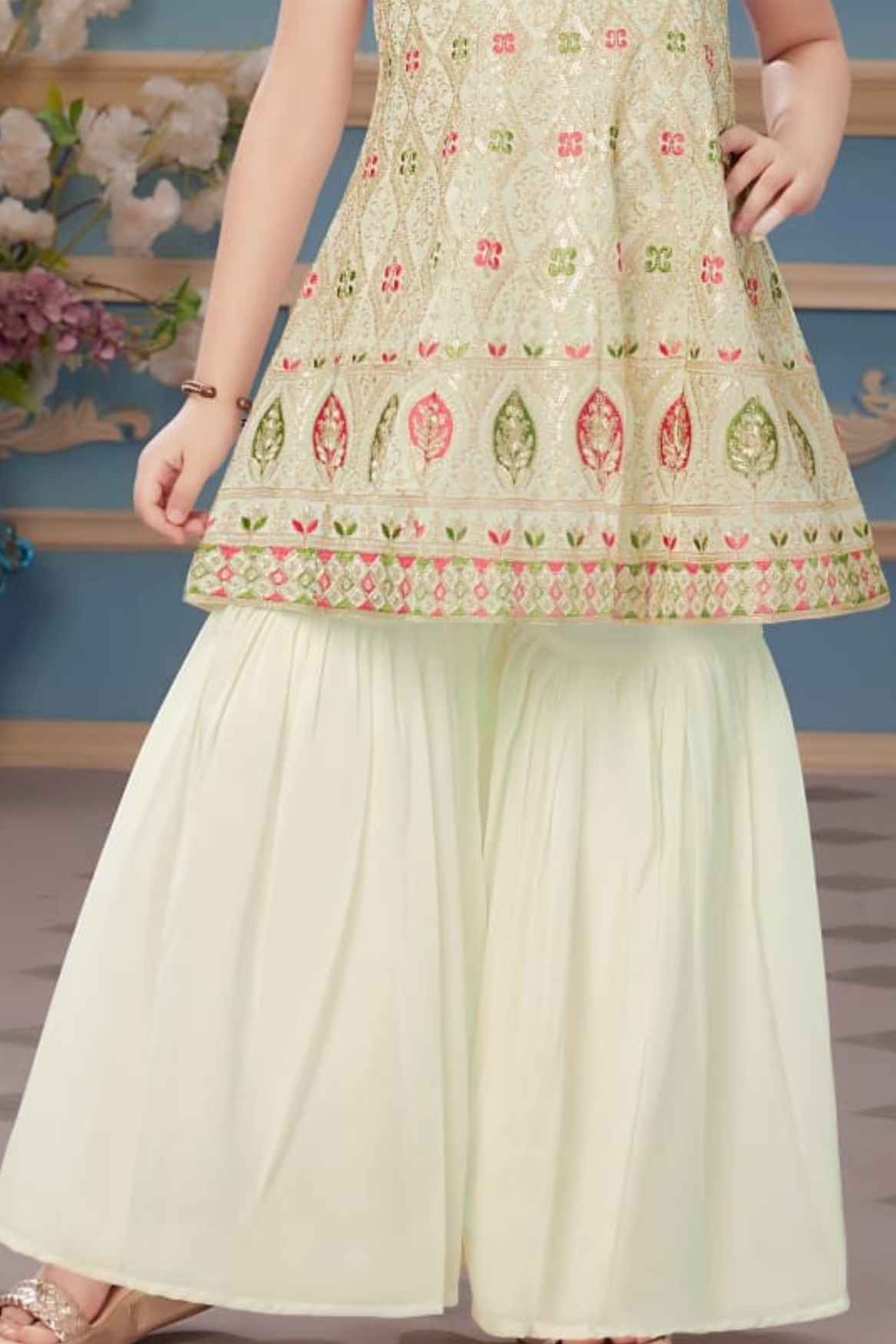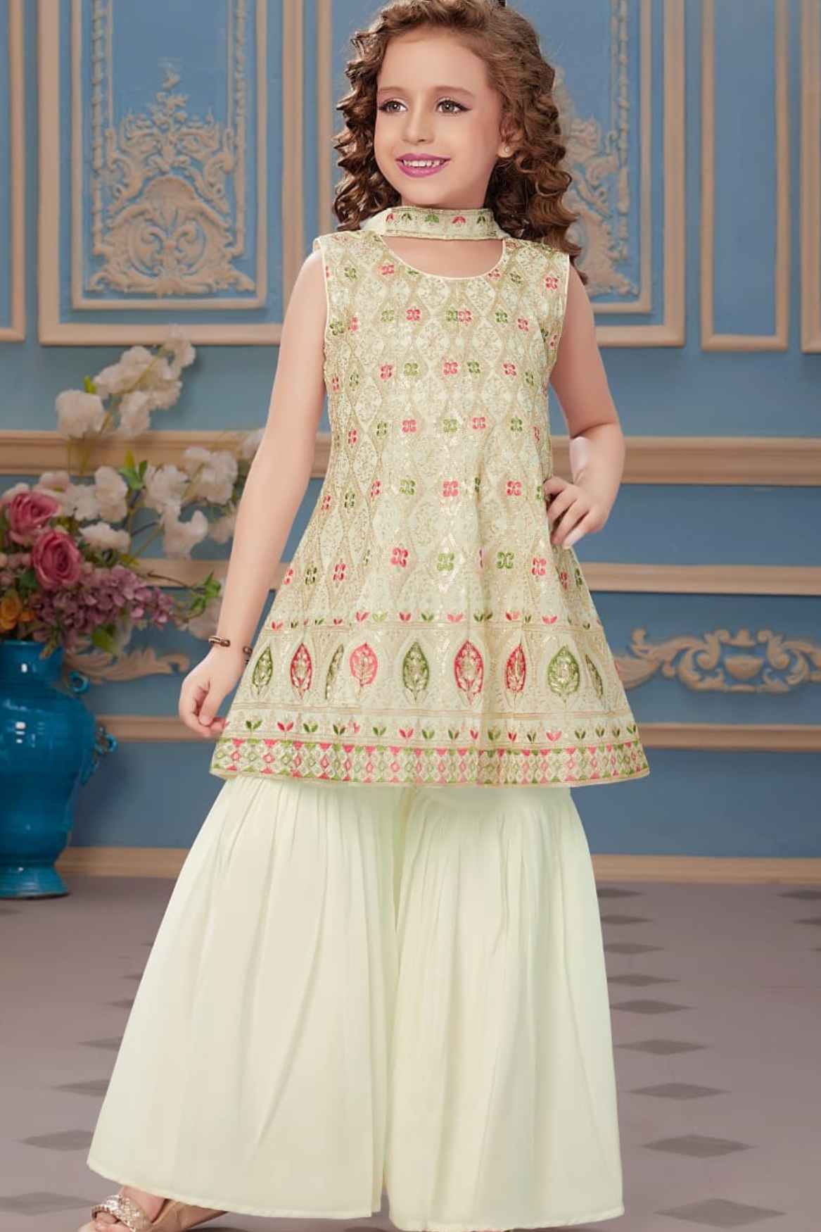 Cream Sequins And Embroidery Sharara Set For Girls