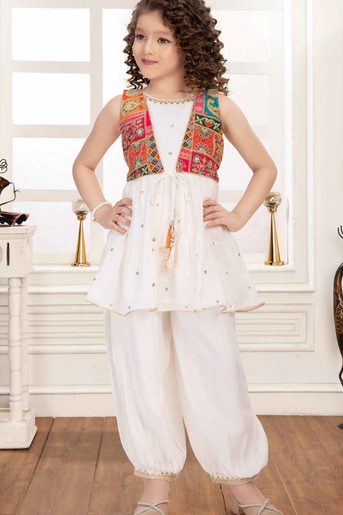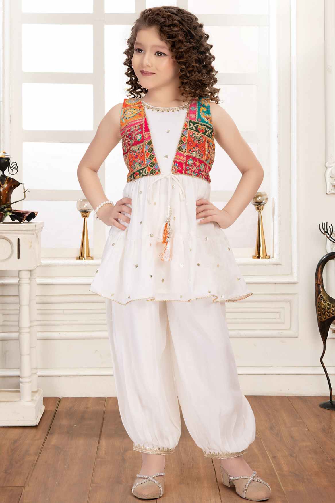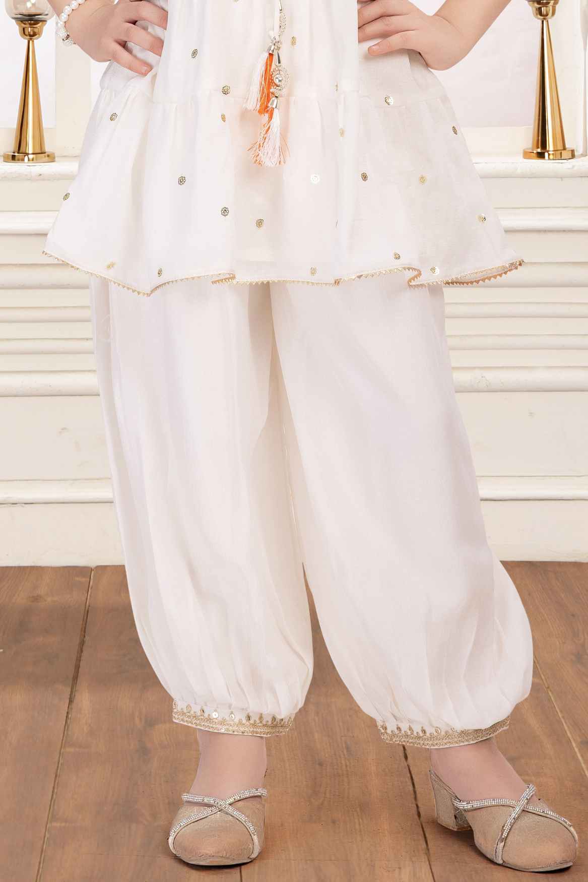 Elevate your little girl's style with this Cream Sequins Work Dhoti Set. The intricate zari work on the overcoat adds a touch of elegance while the sequin detailing on the dhoti set brings a playful element. Perfect for any occasion, this set will make your little one stand out and feel confident.