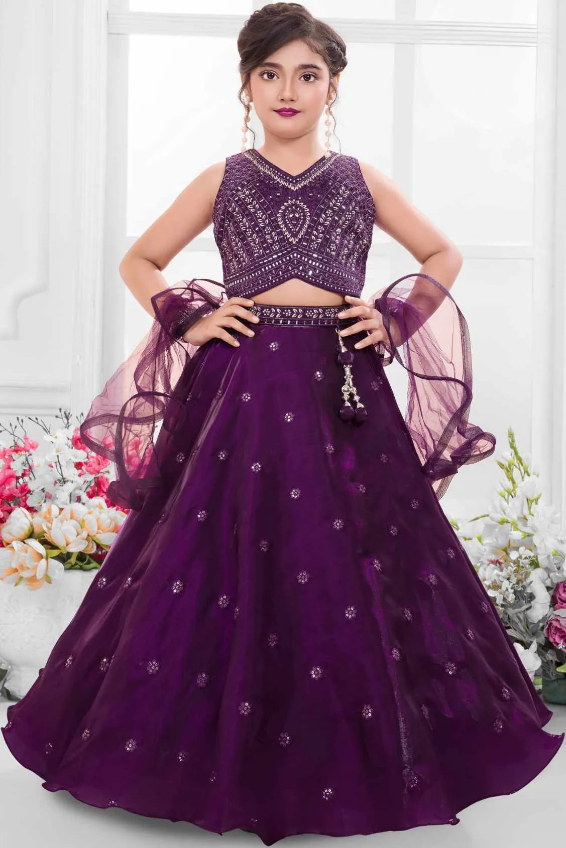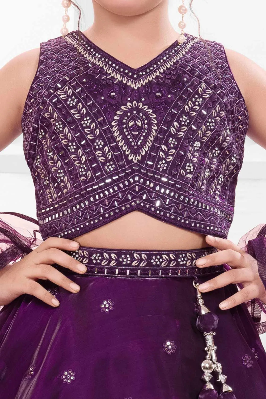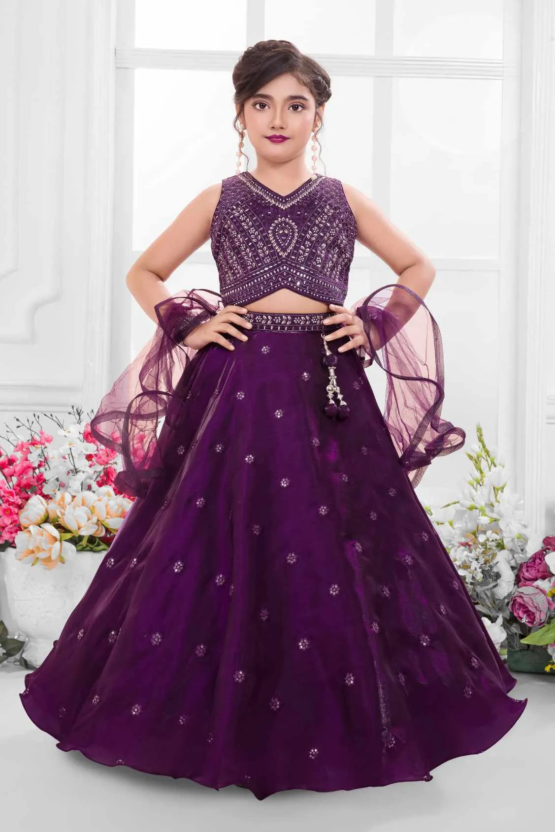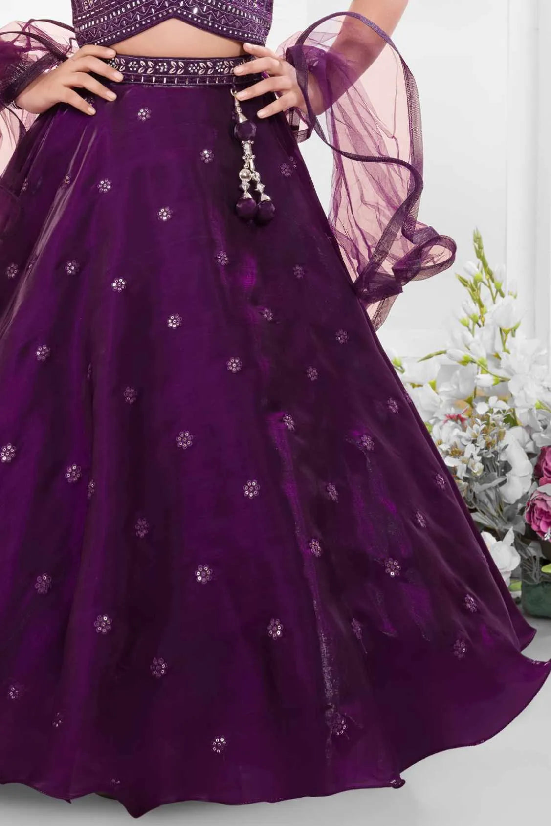 Deep Purple Embroidered Lehenga Choli Set for Girls