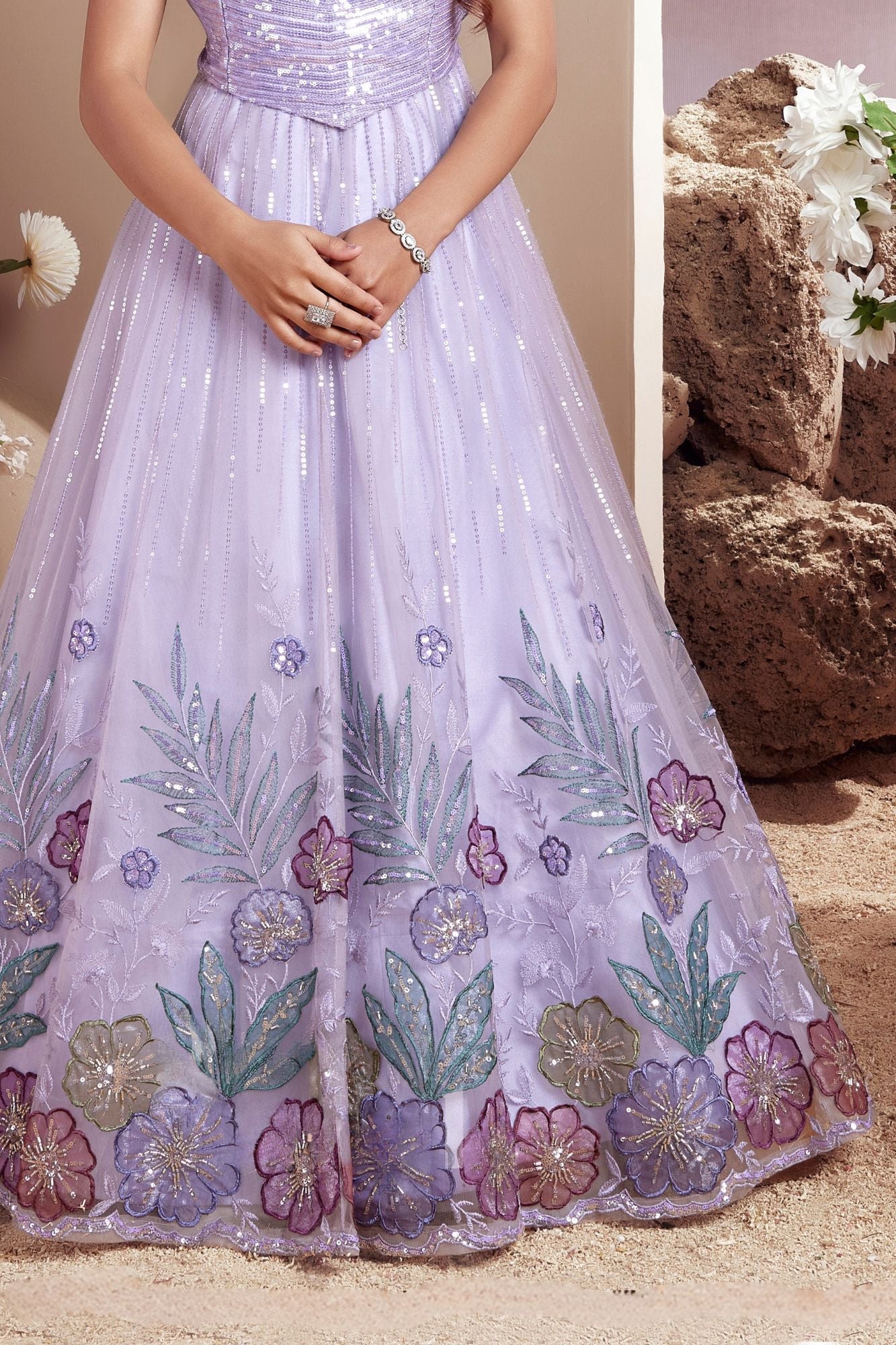Lavender Embroidered Long Ethnic Gown with Dupatta For Girls