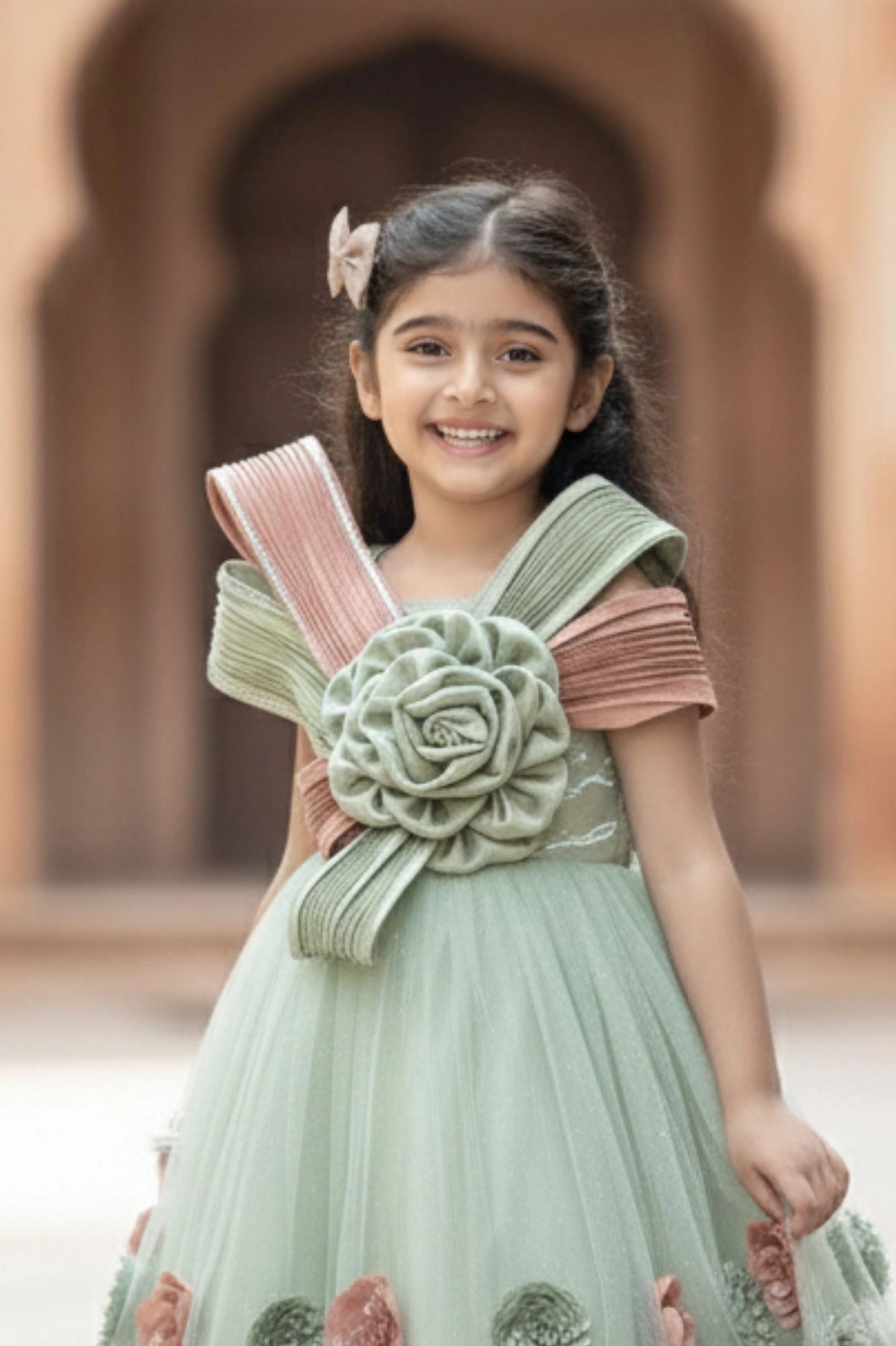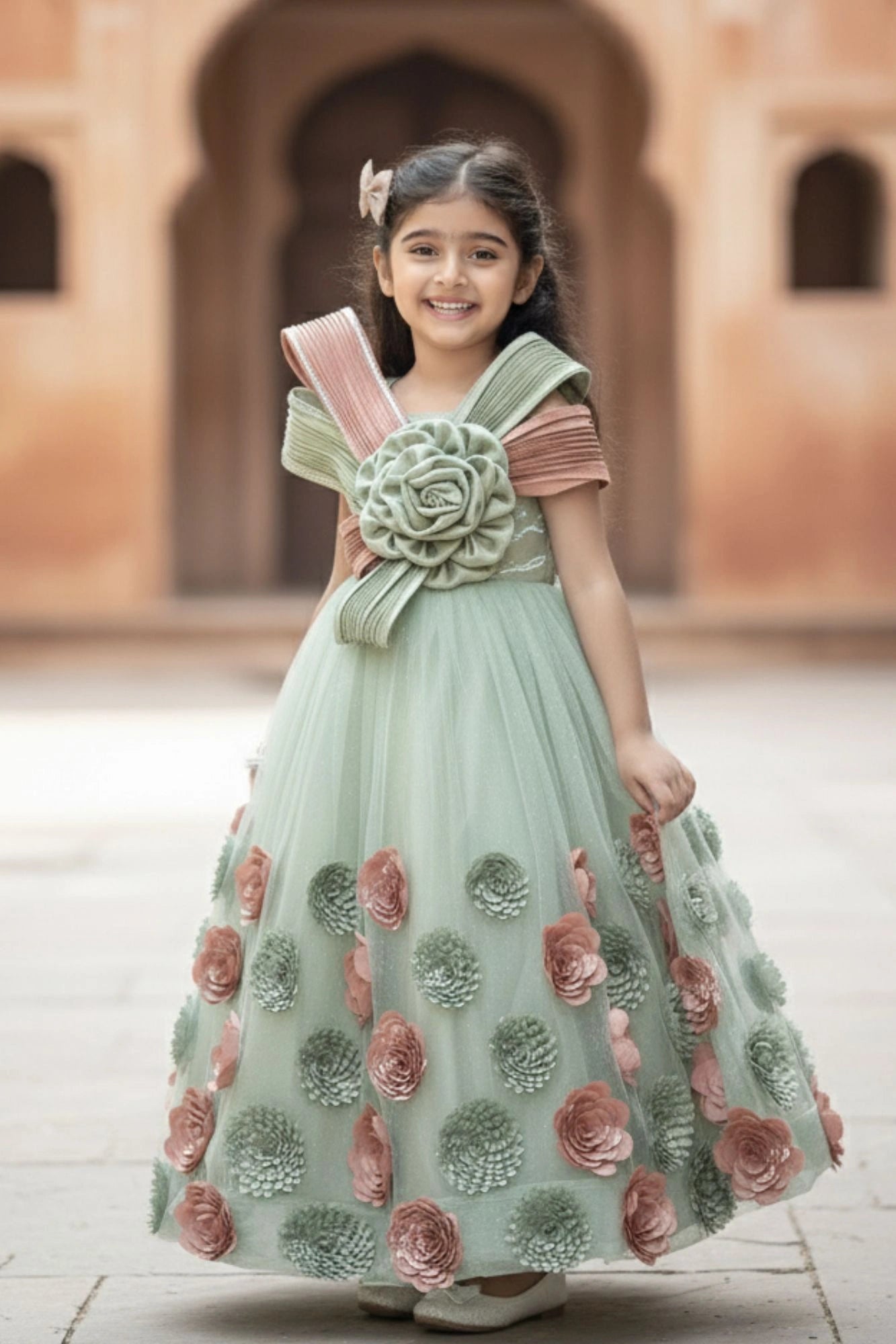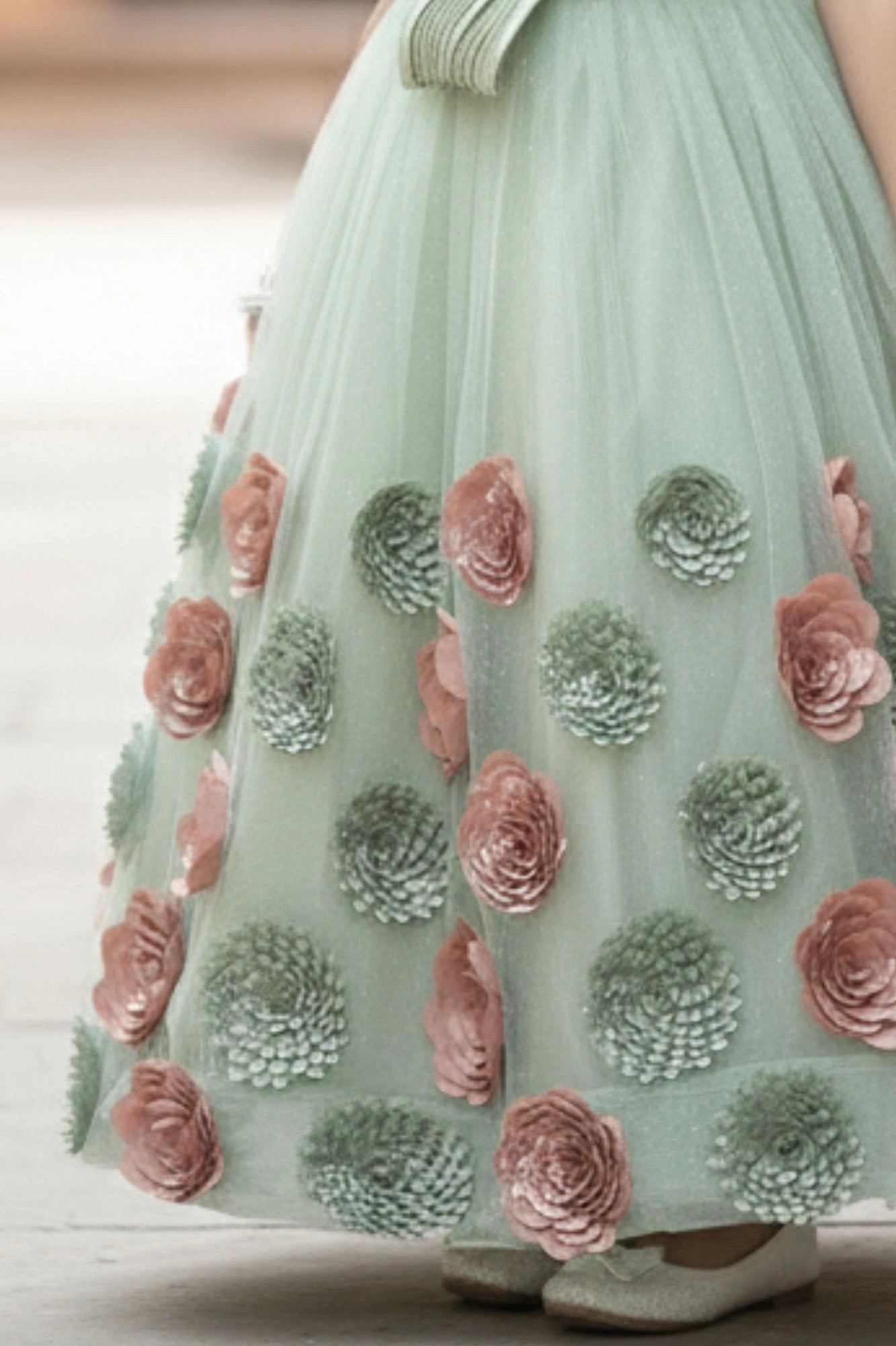 Dreamy Pastel Green & Dusty Pink 3D Floral Embellished Party Gown For Girls