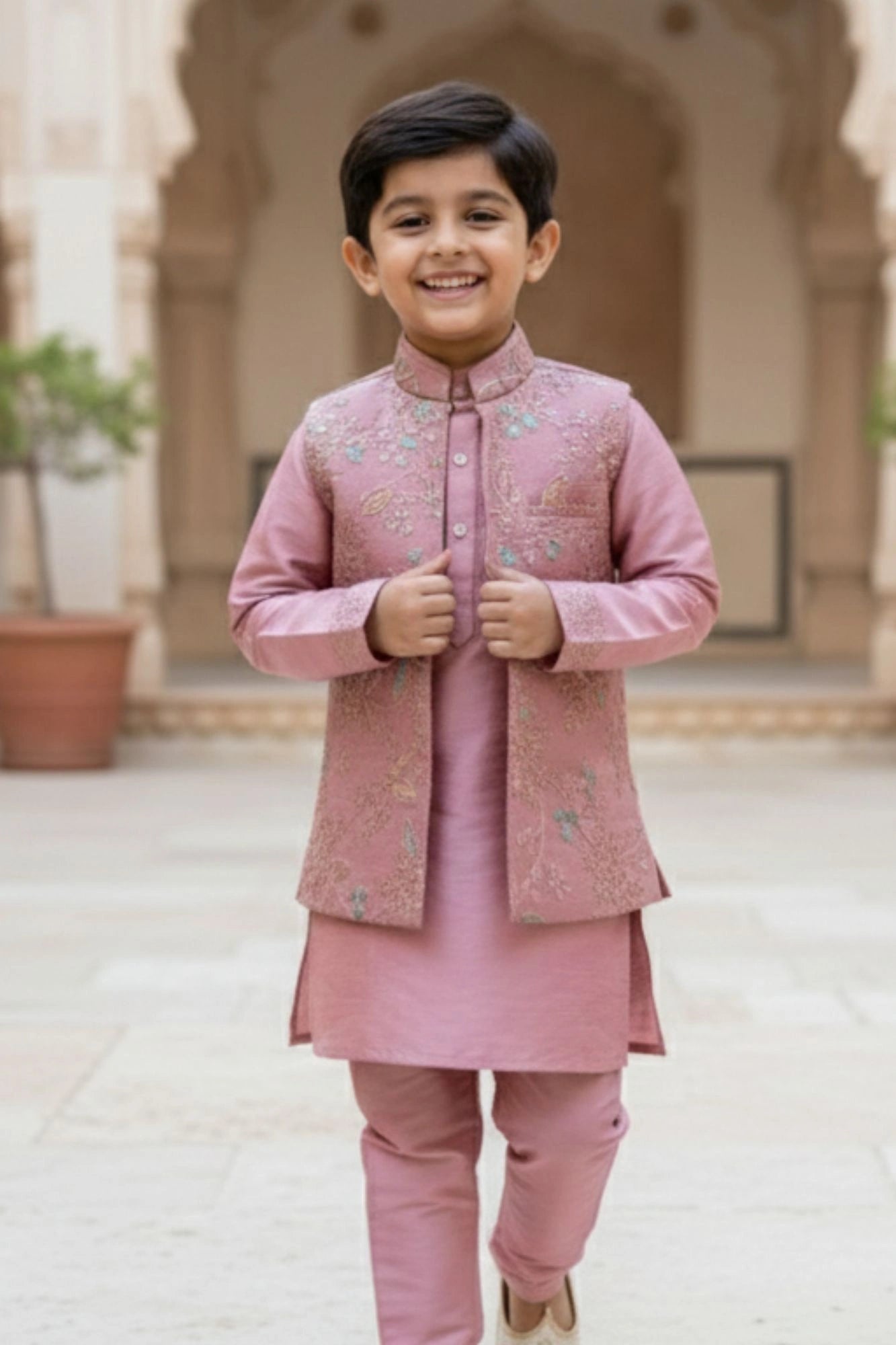 Dusty Mauve Embroidered Kurta Jacket Set for Boys