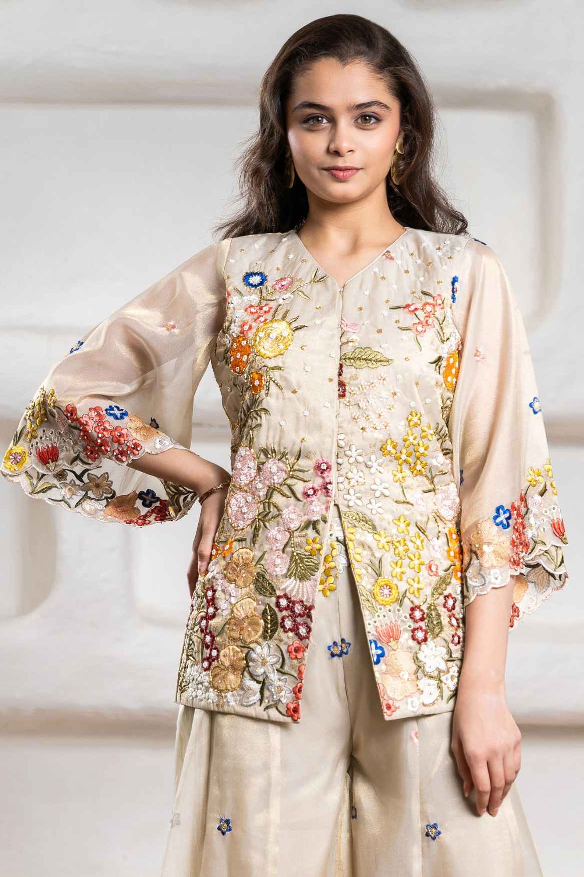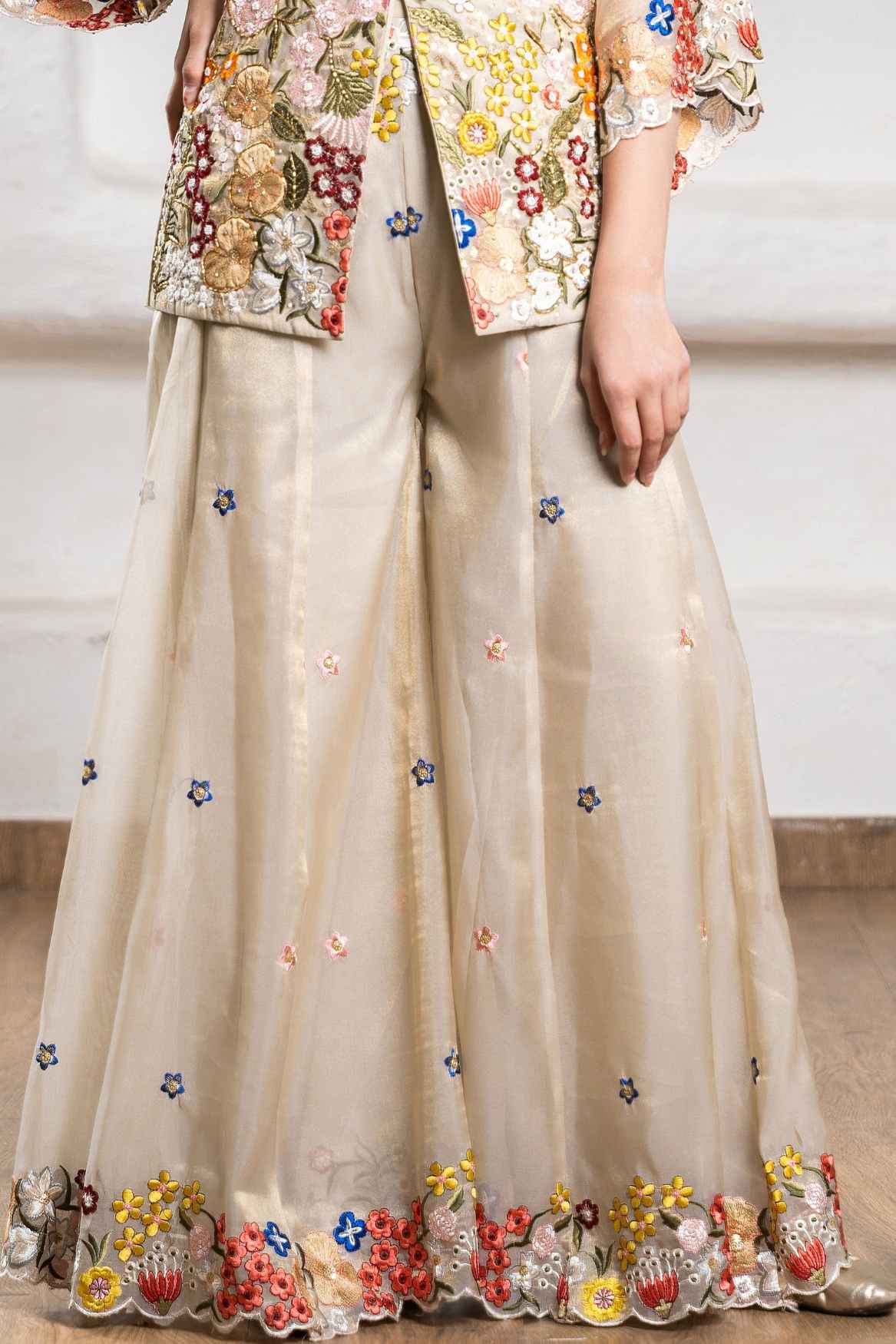 Elegant Beige Floral Embroidered Palazzo Set for Girls