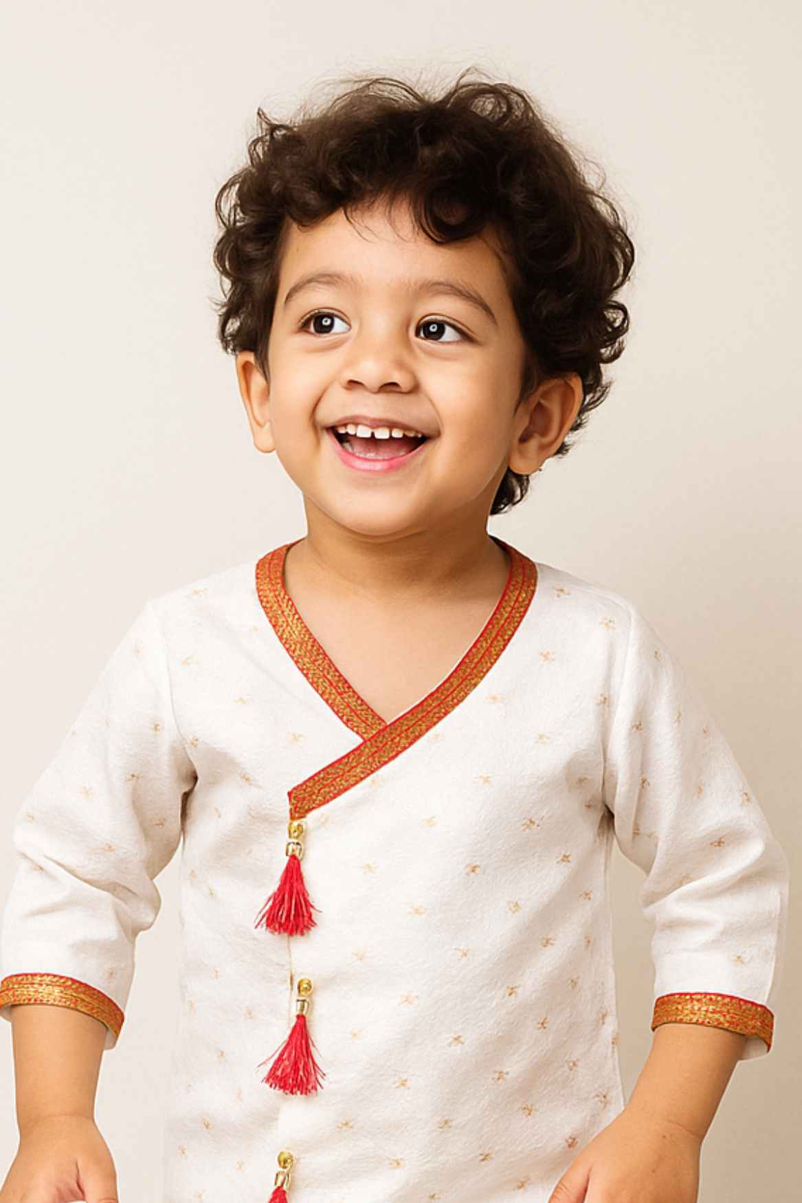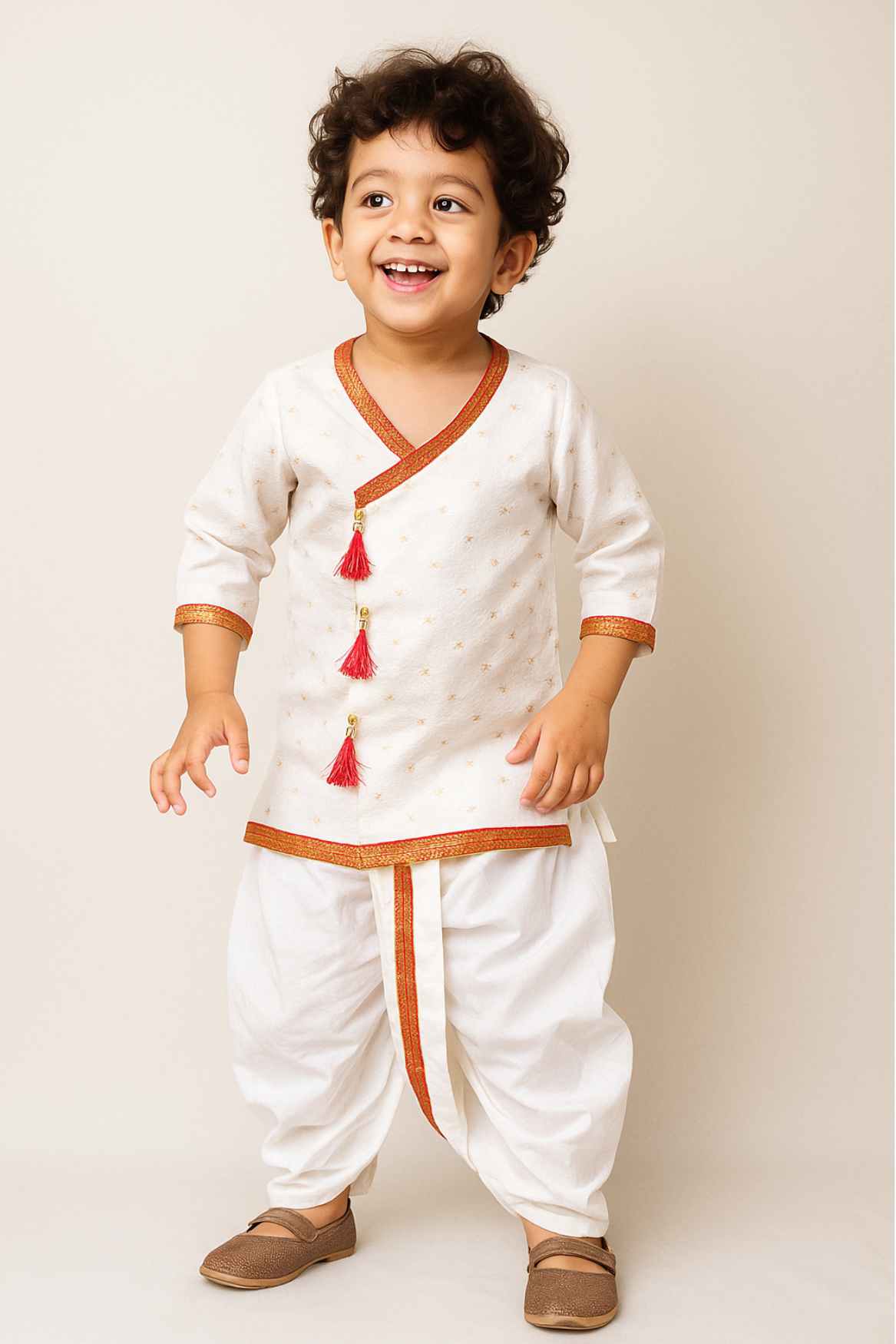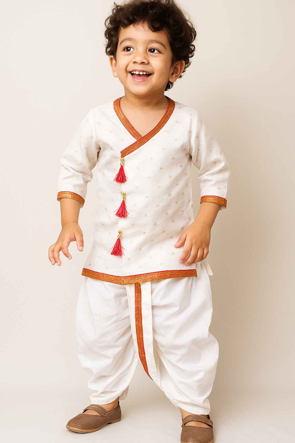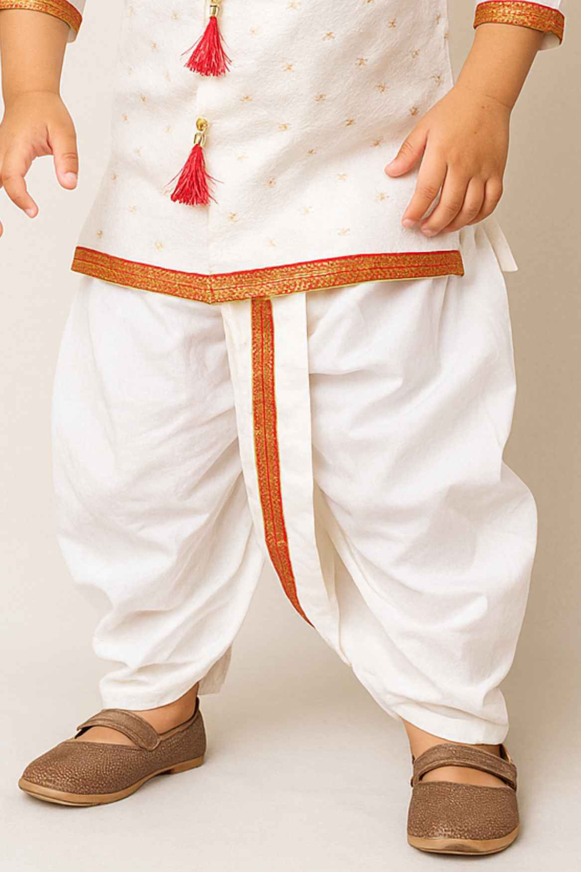 Elegant Cream And White Dhoti Kurta Set With Red Tassel Detailing For Boys