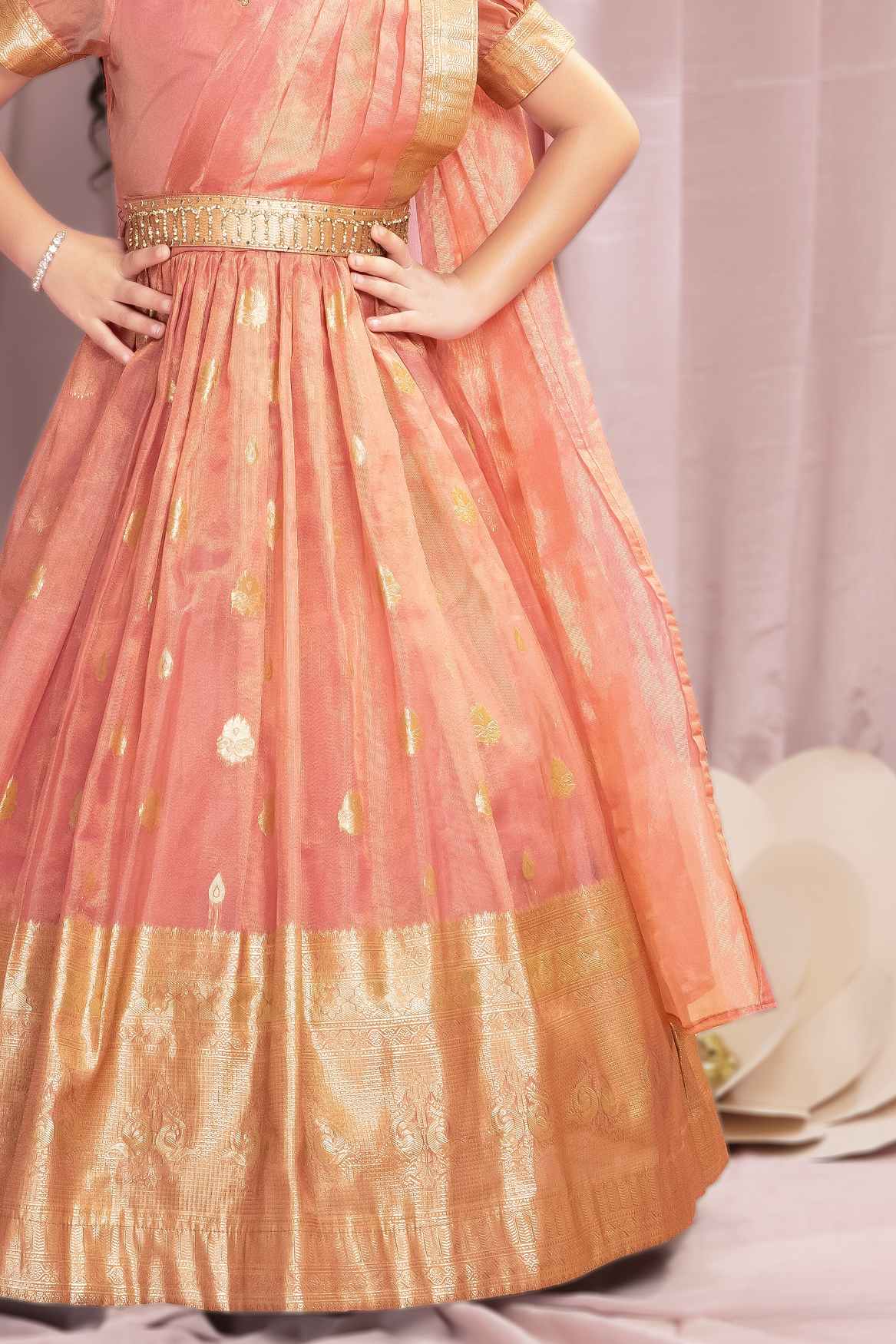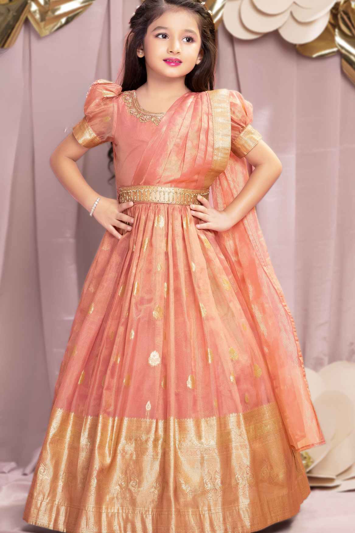Designer Peach Shimmer Printed Party Wear Gown With Pearl Work For Girls