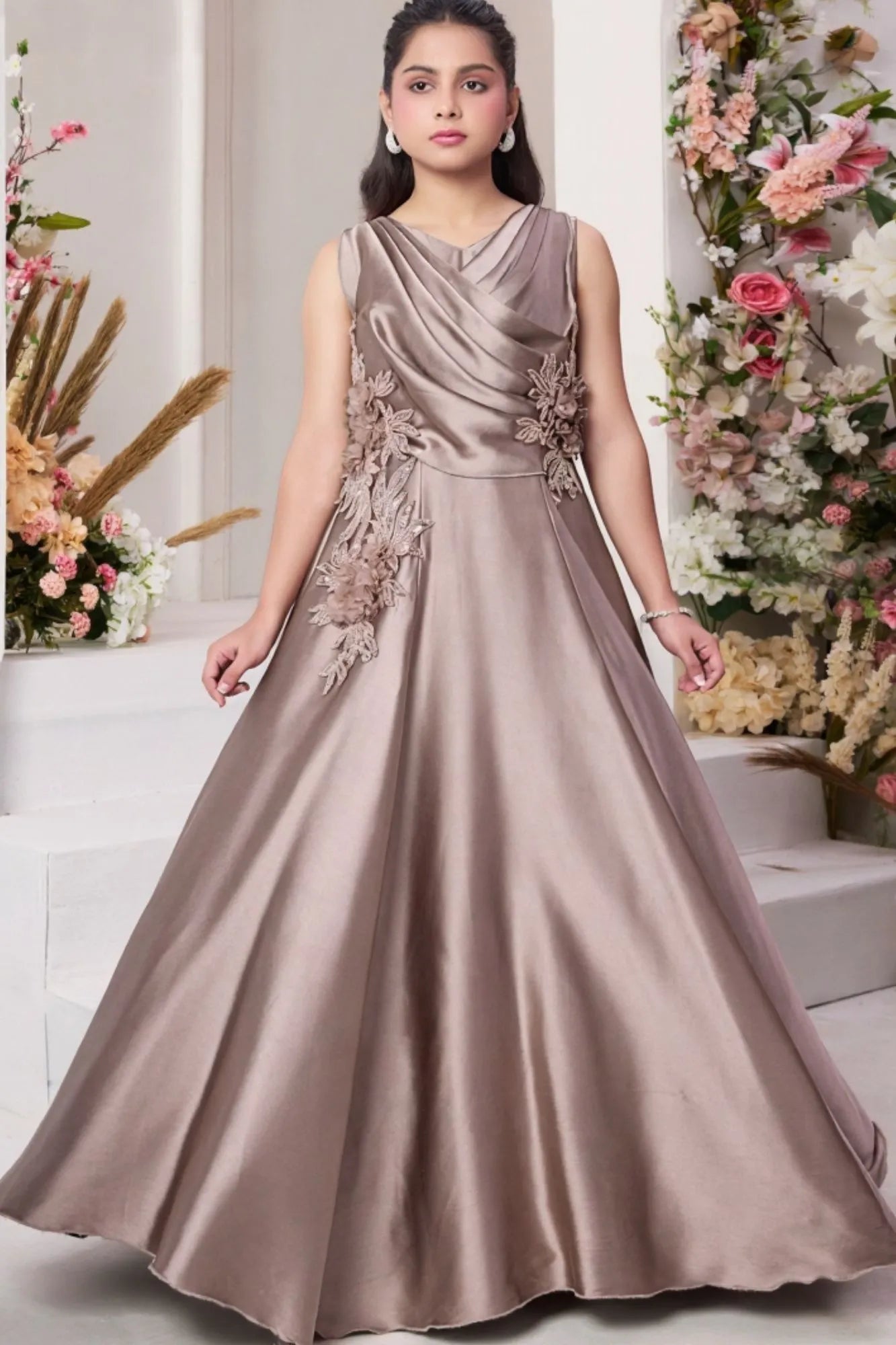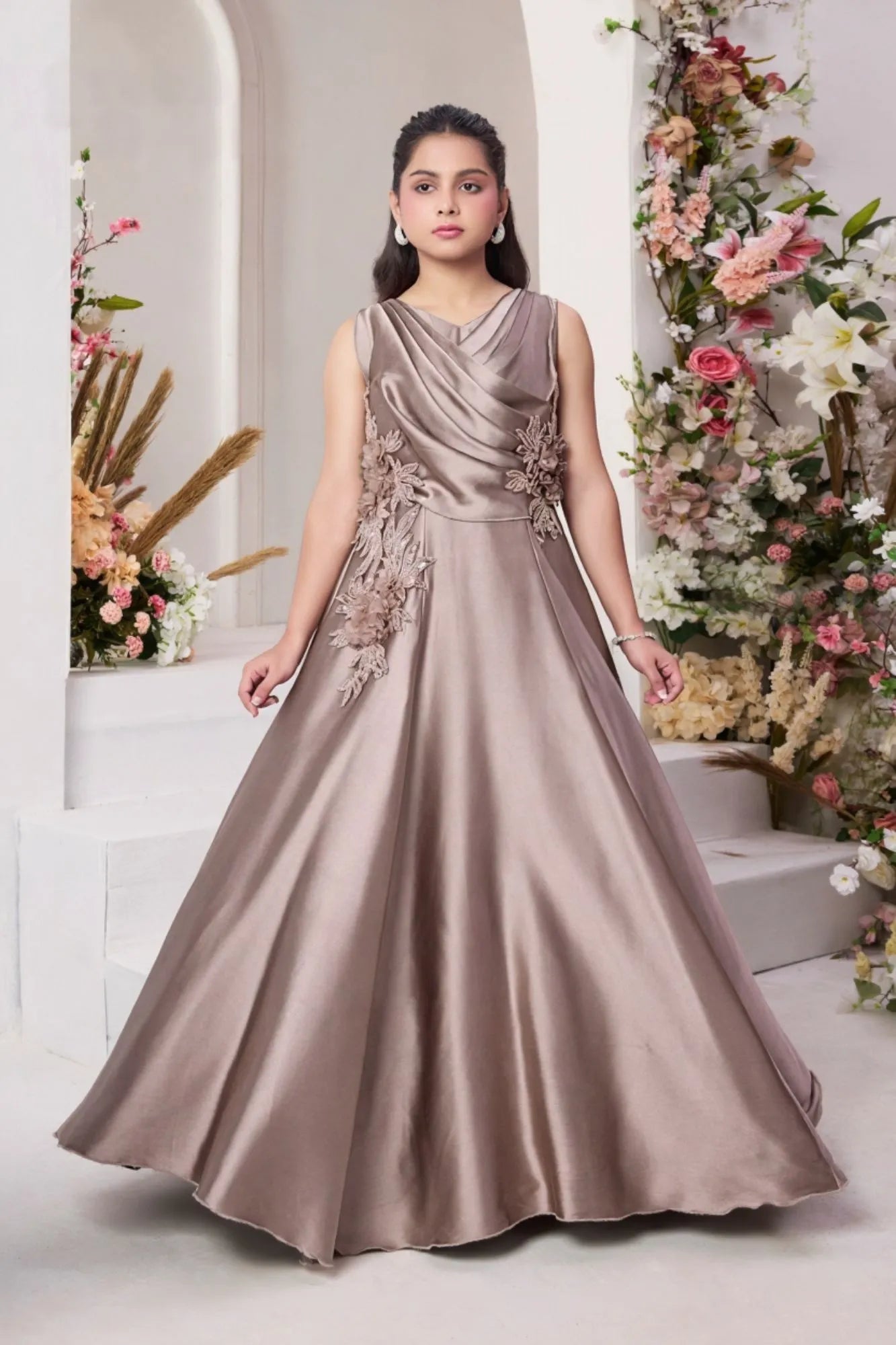 Gold Gown with Draped Bodice and 3D Floral Appliqué Embroidery For Girls