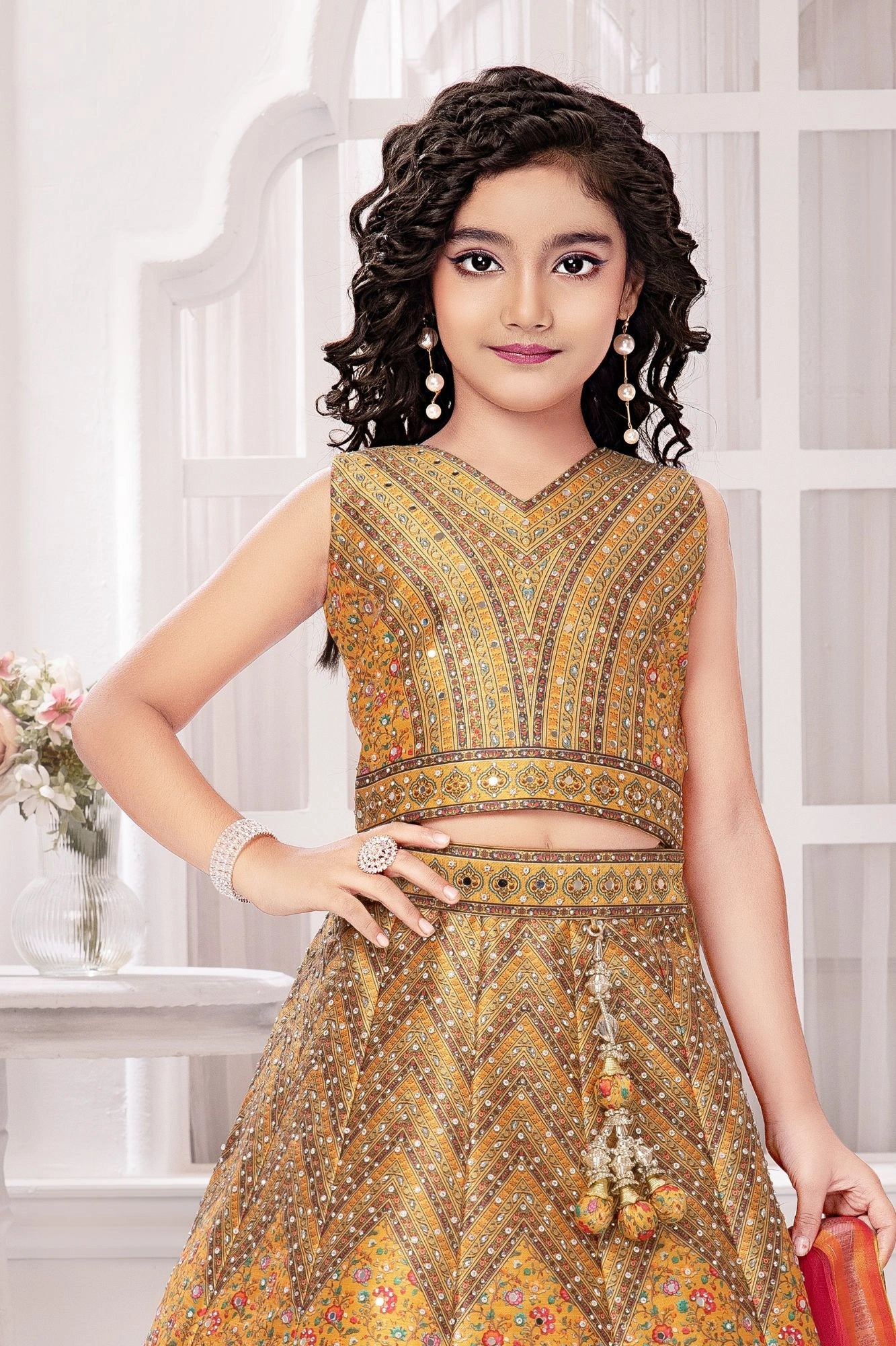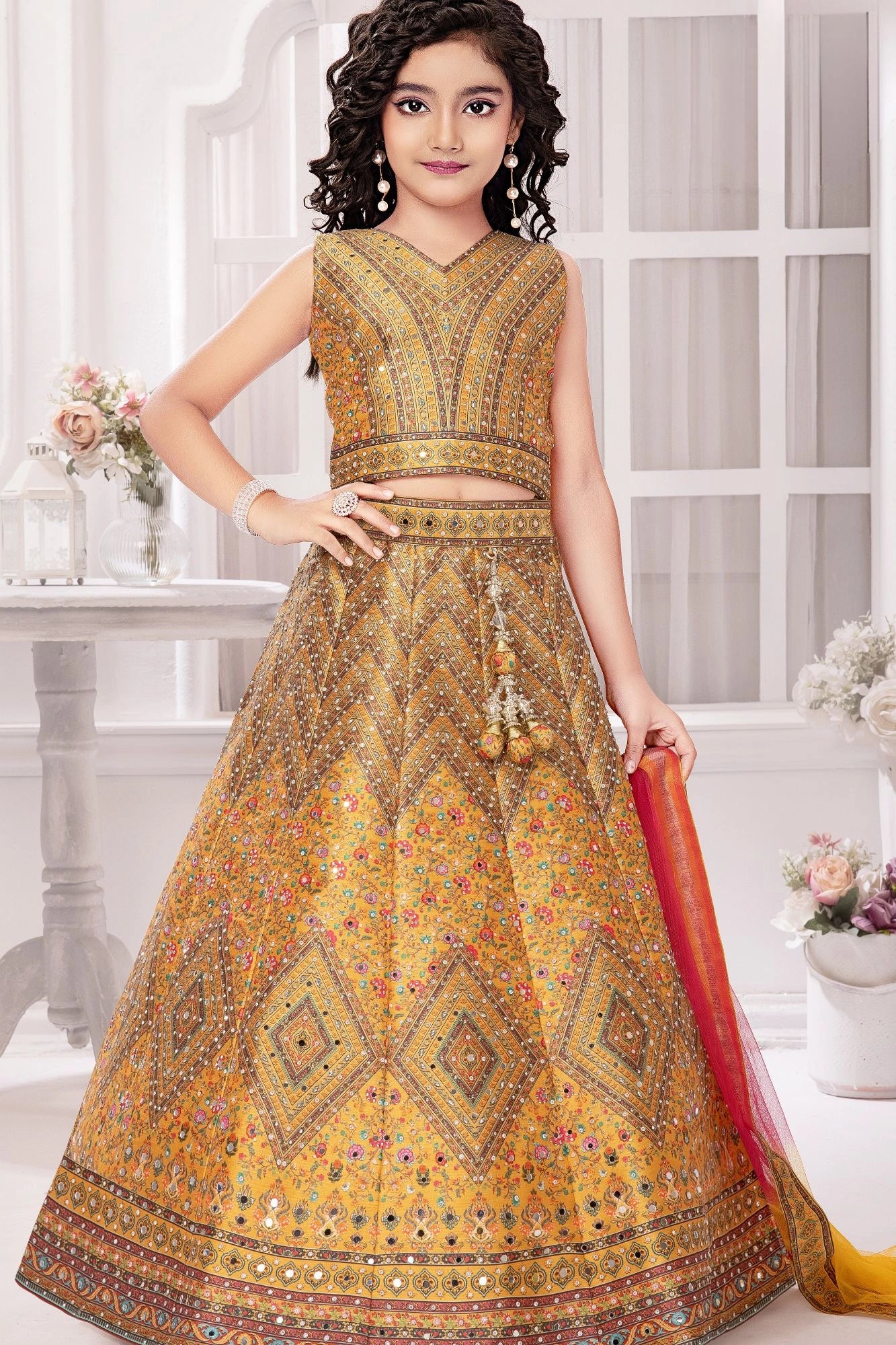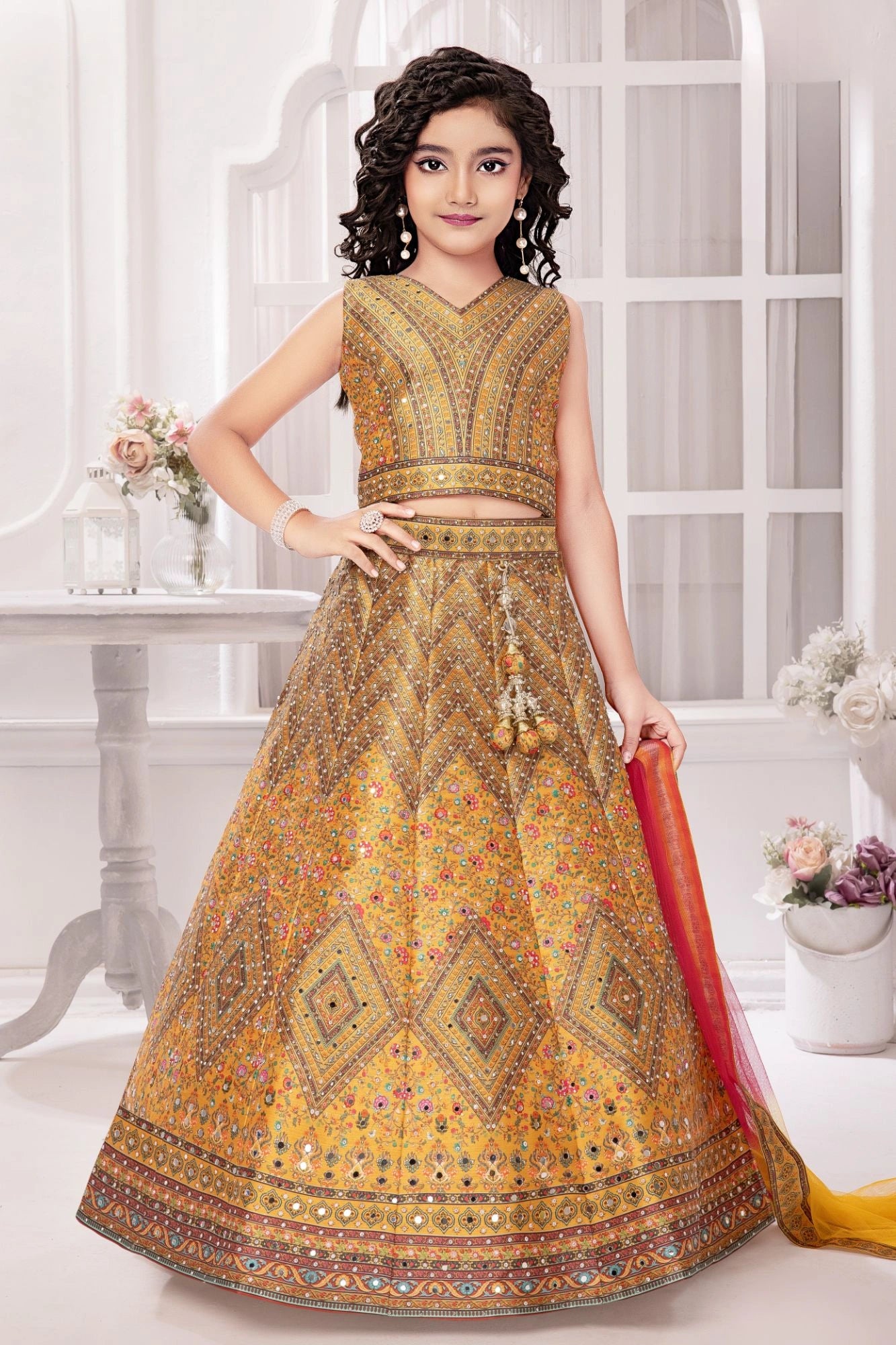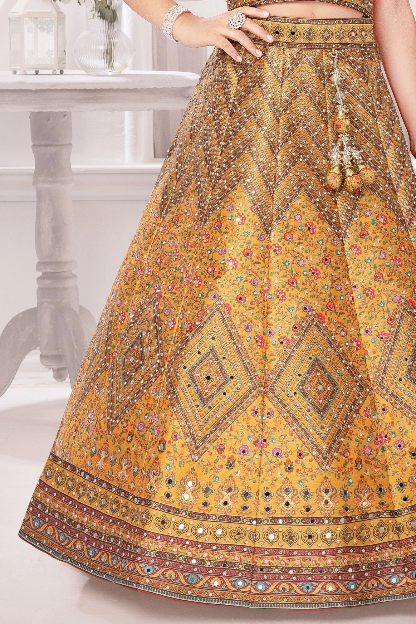 Golden Yellow Mirror Work Lehenga Choli with Dupatta For Girls