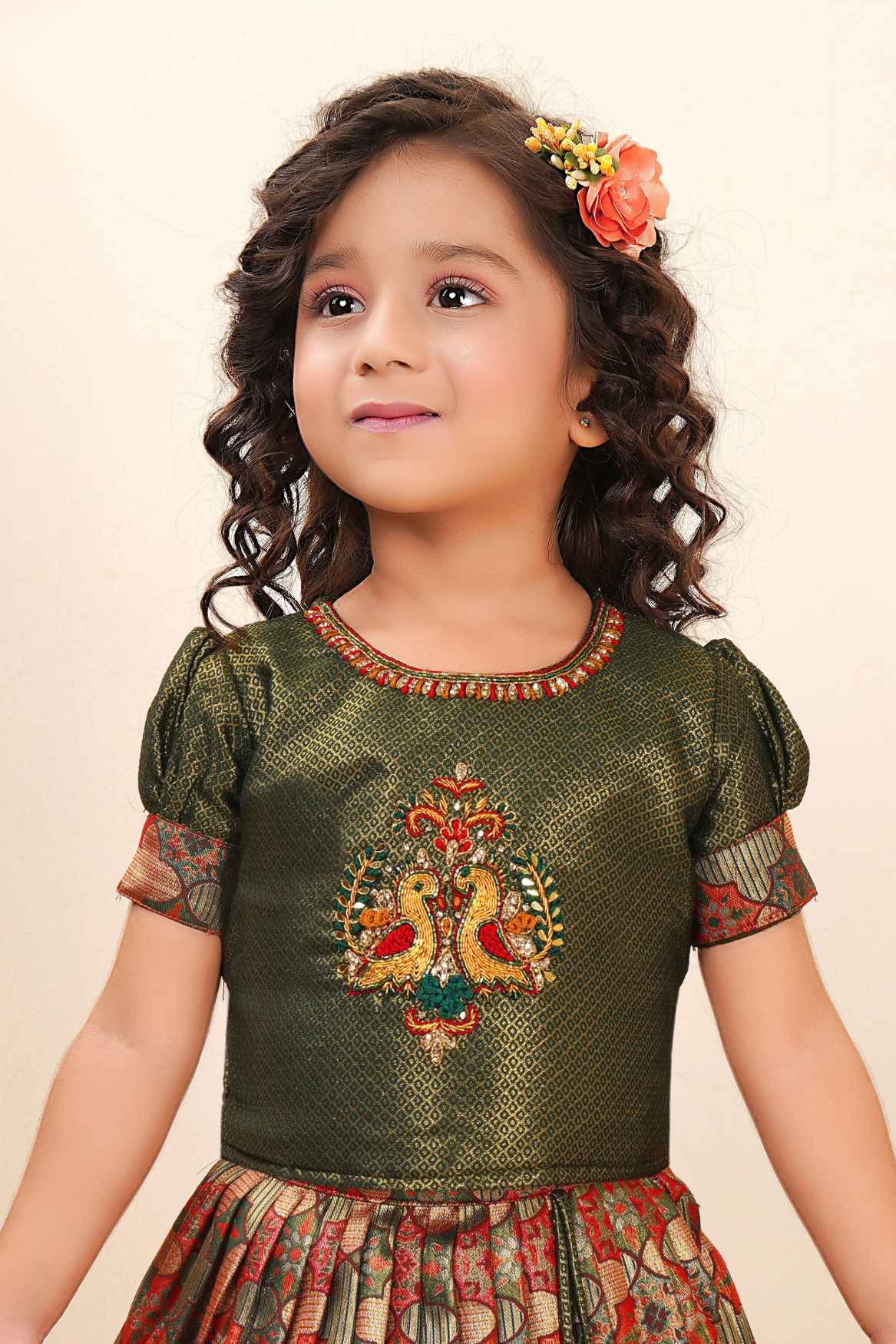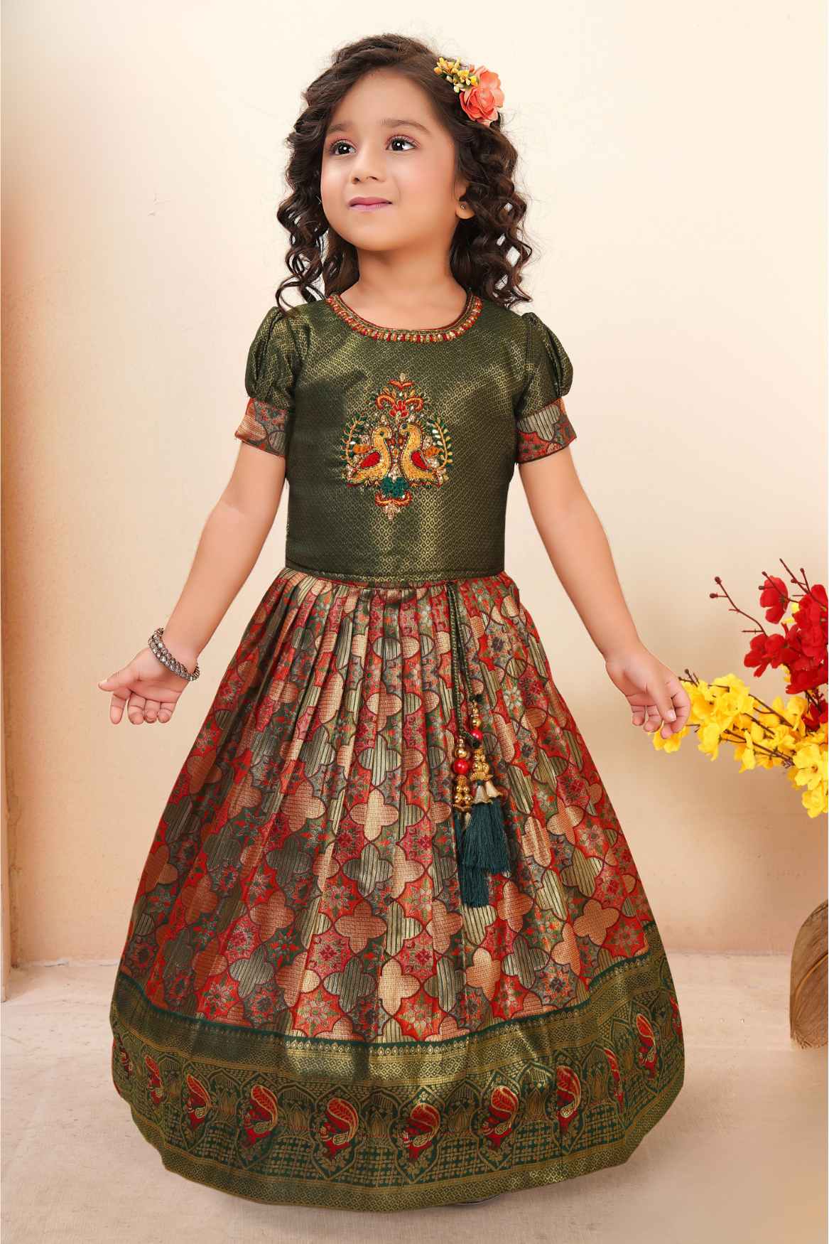 This gorgeous Green & Gold Brocade Pattu Pavadai is a perfect blend of elegance and traditional craftsmanship. Featuring intricate Zardosi embroidery and beadwork, this stunning outfit is ideal for special occasions, making your little one look like a princess at weddings and cultural events.
