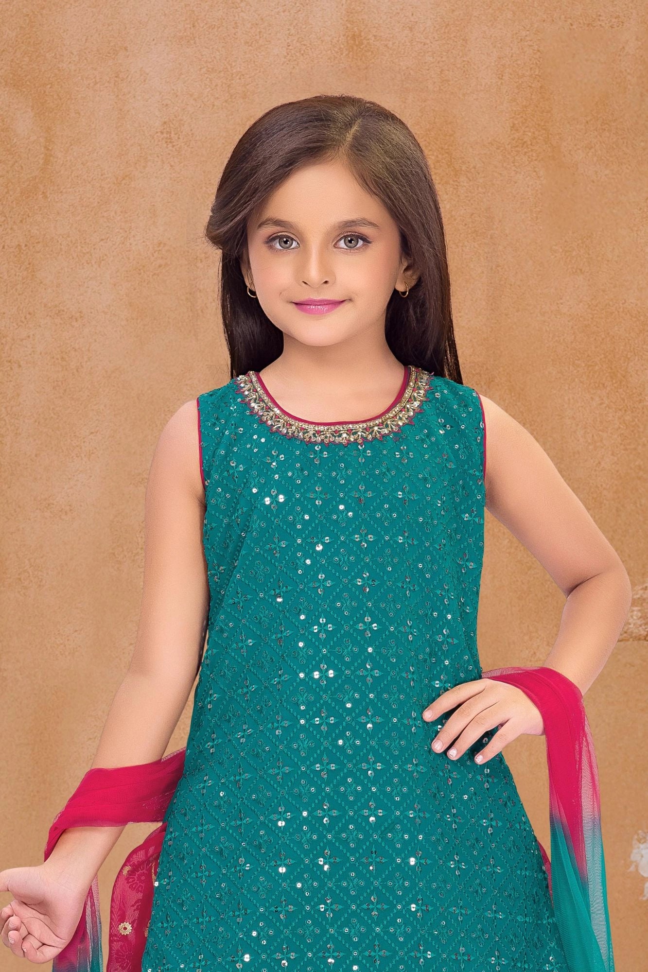 Green & Red Green Seqiuns Embroidered Patiala Set with Dupatta For Girls