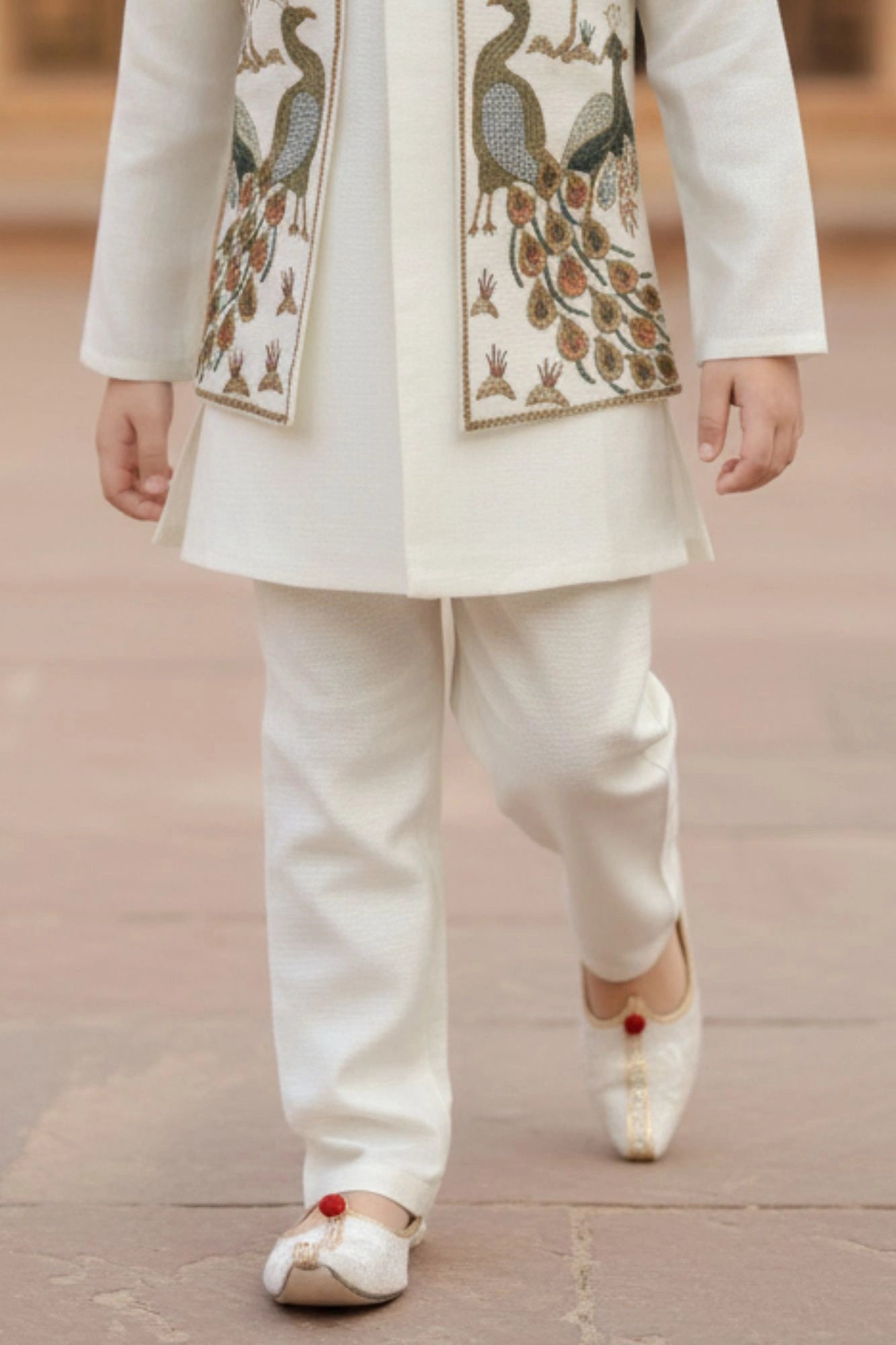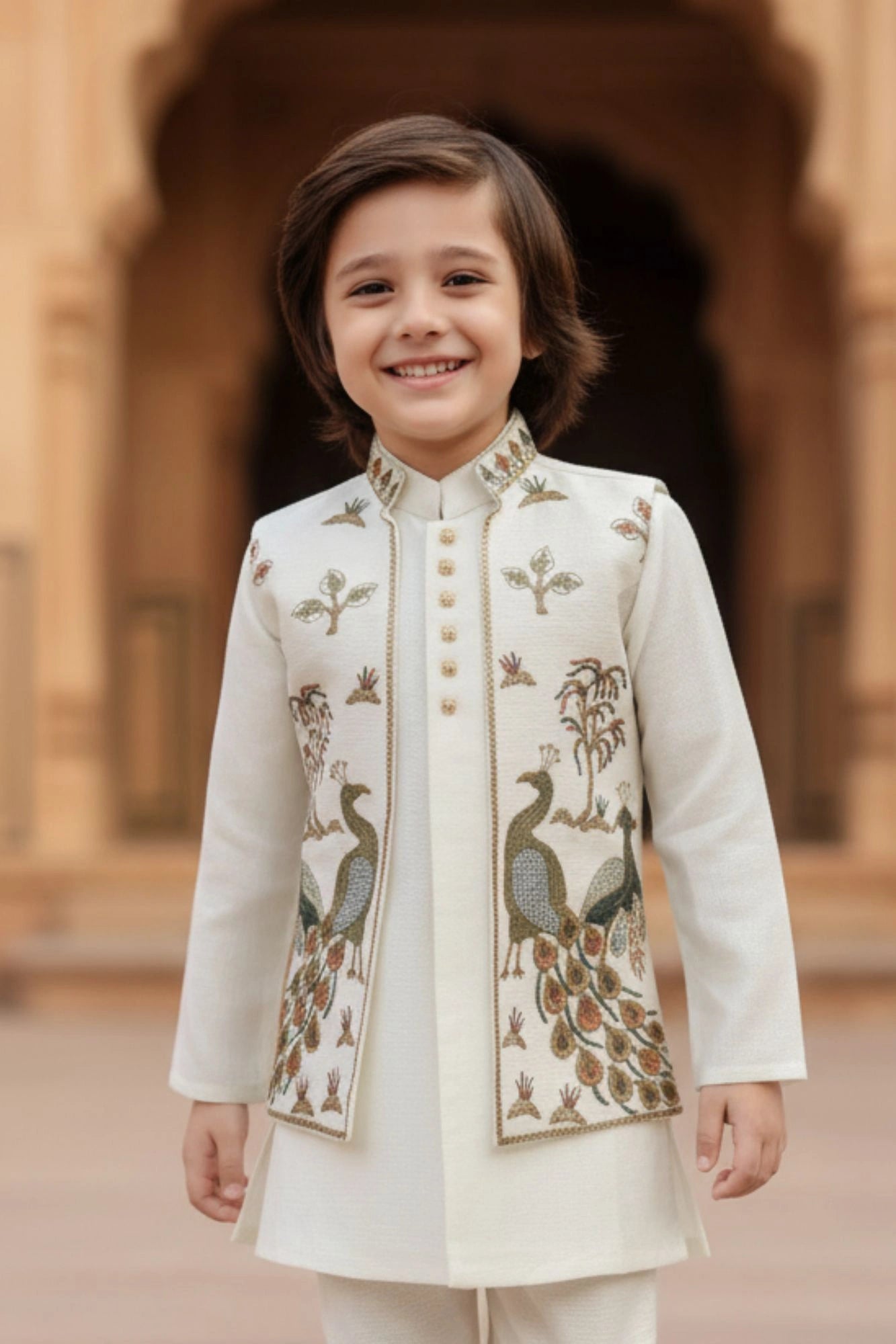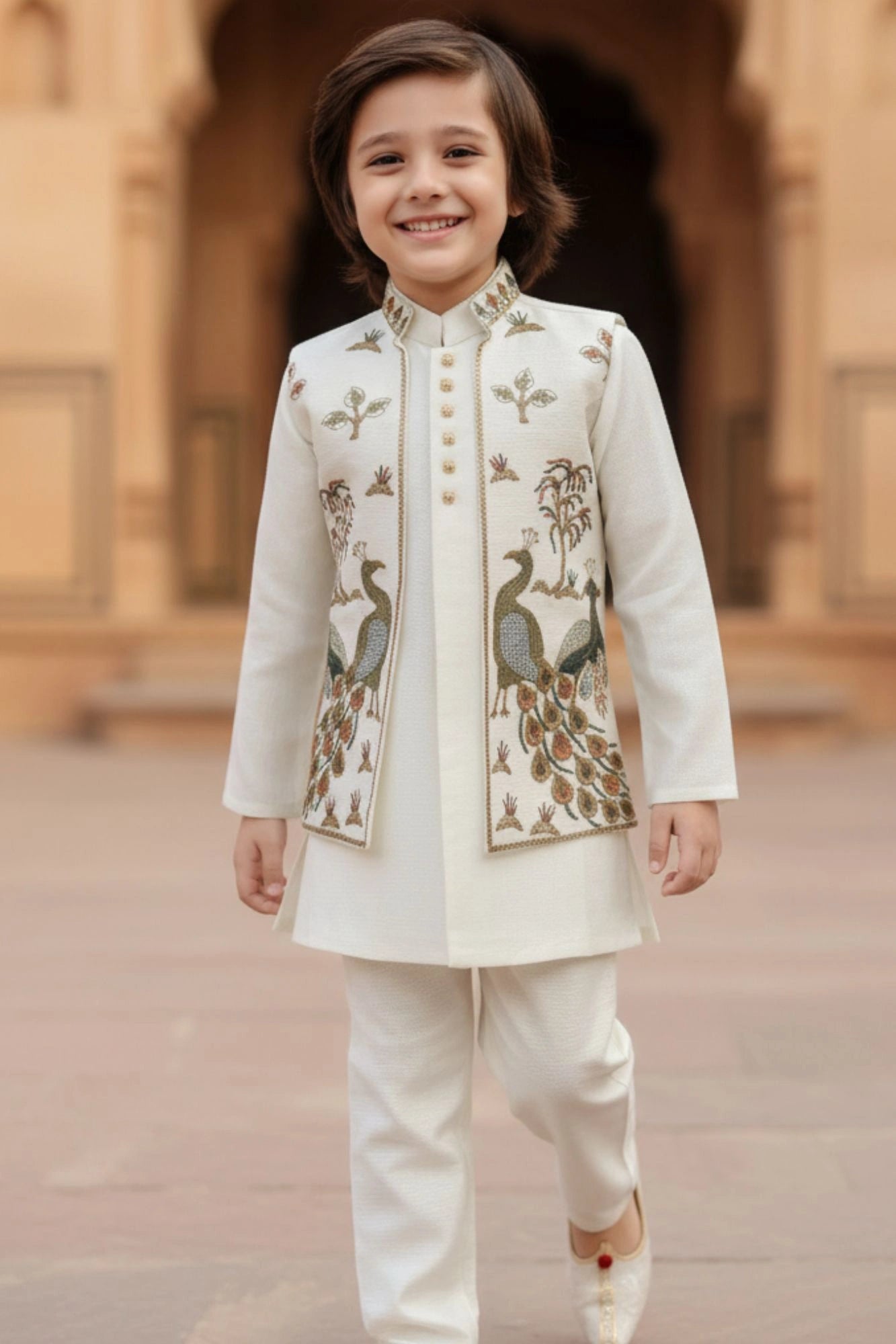 Ivory Embroidered Kurta Jacket Set with Peacock Motif For Boys