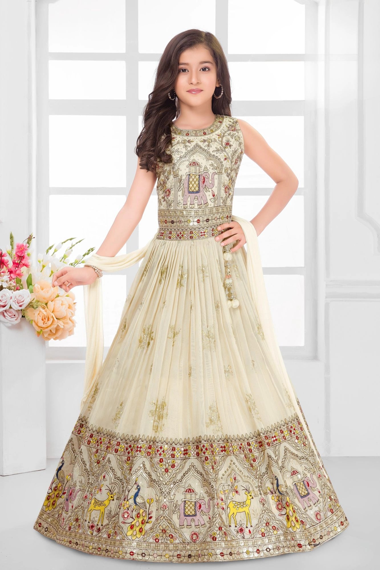 Ivory Ethnic Embroidered Lehenga Choli Set with Sequins and Thread Work For Girls