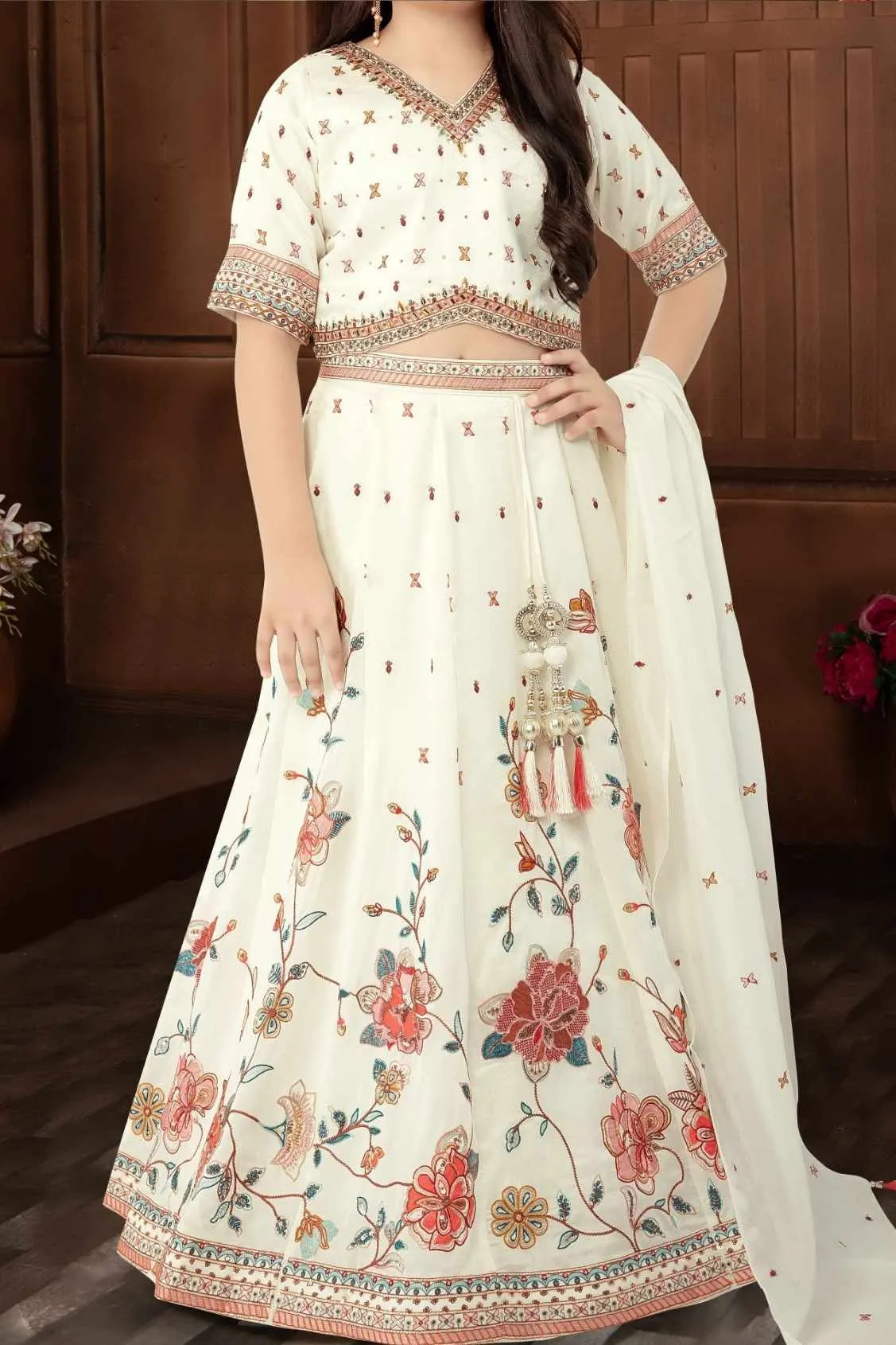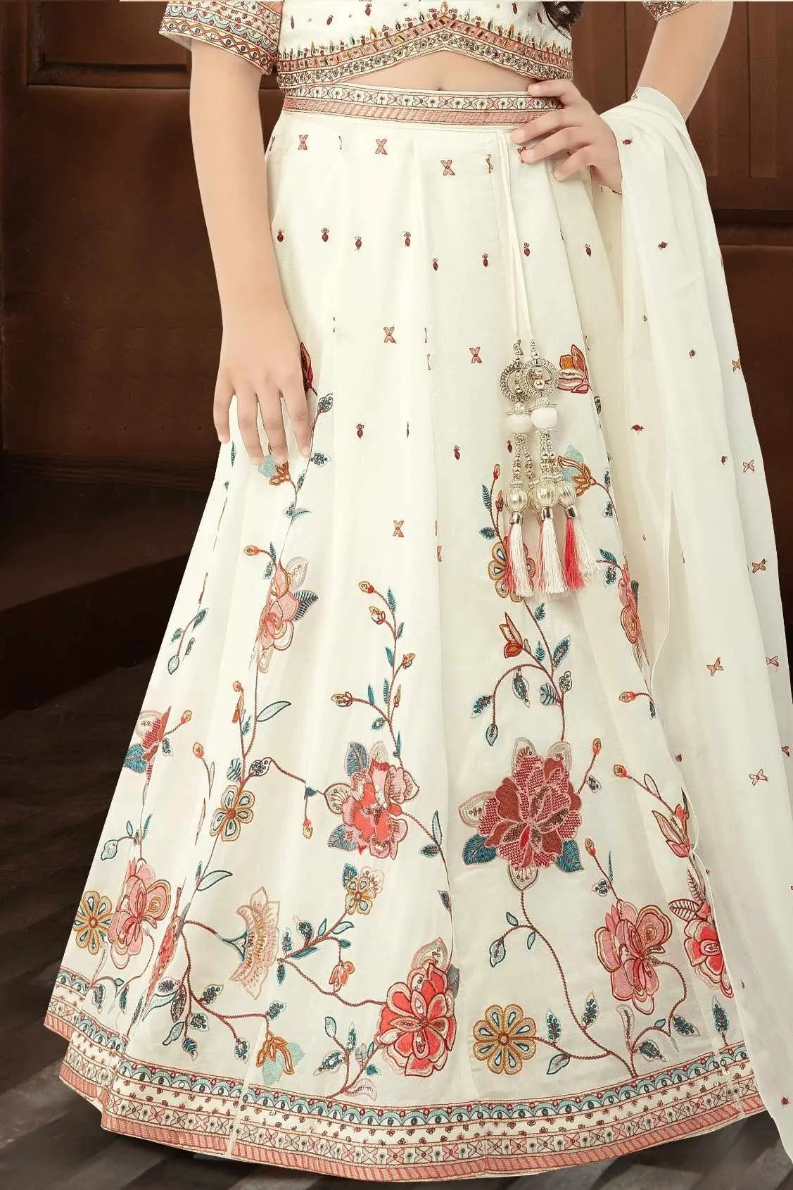 Ivory Floral Embroidered Lehenga Choli Set with Dupatta for Girls