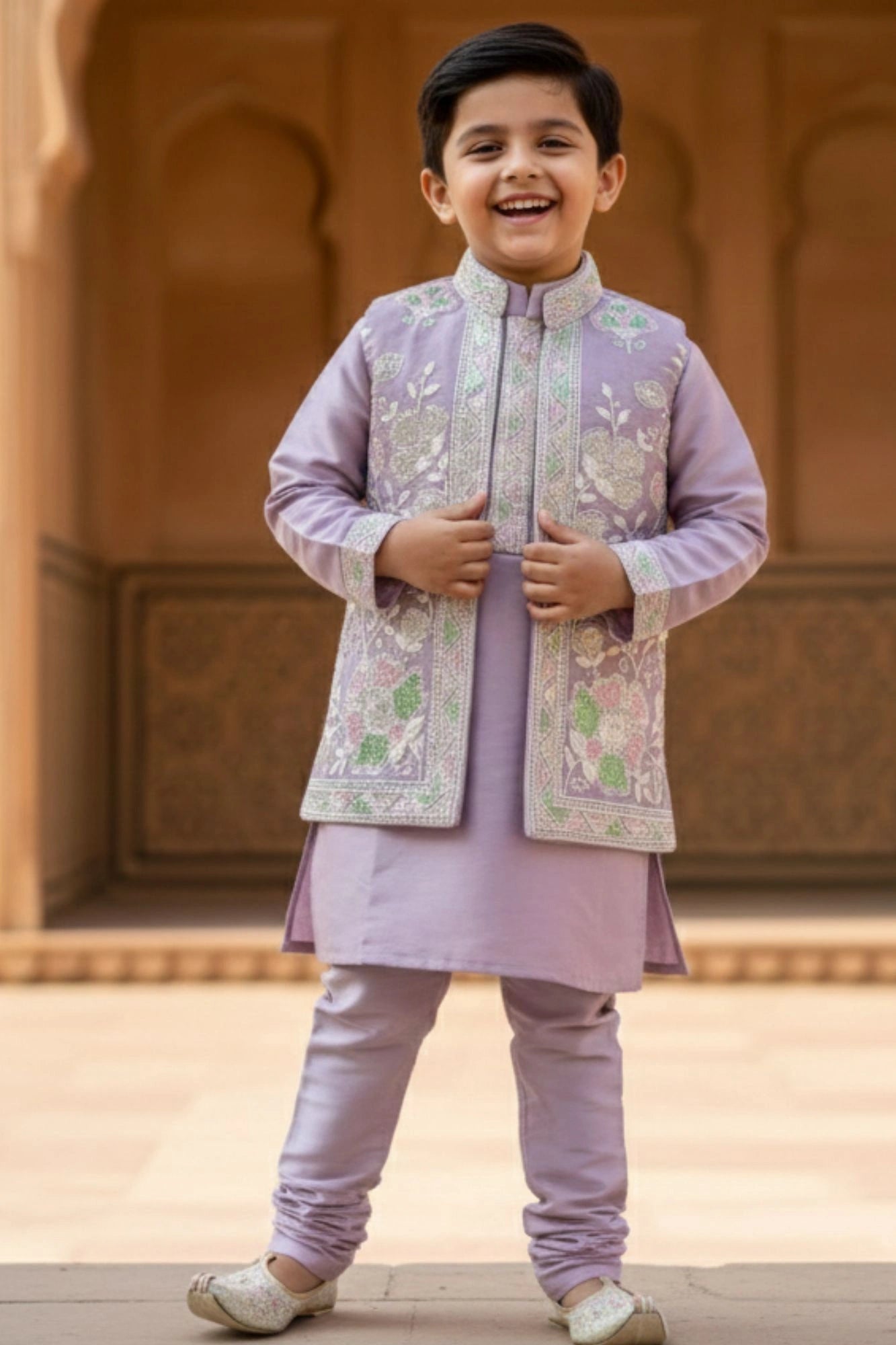 Lavender Embroidered Festive Kurta Pyjama Set with Jacket For Boys