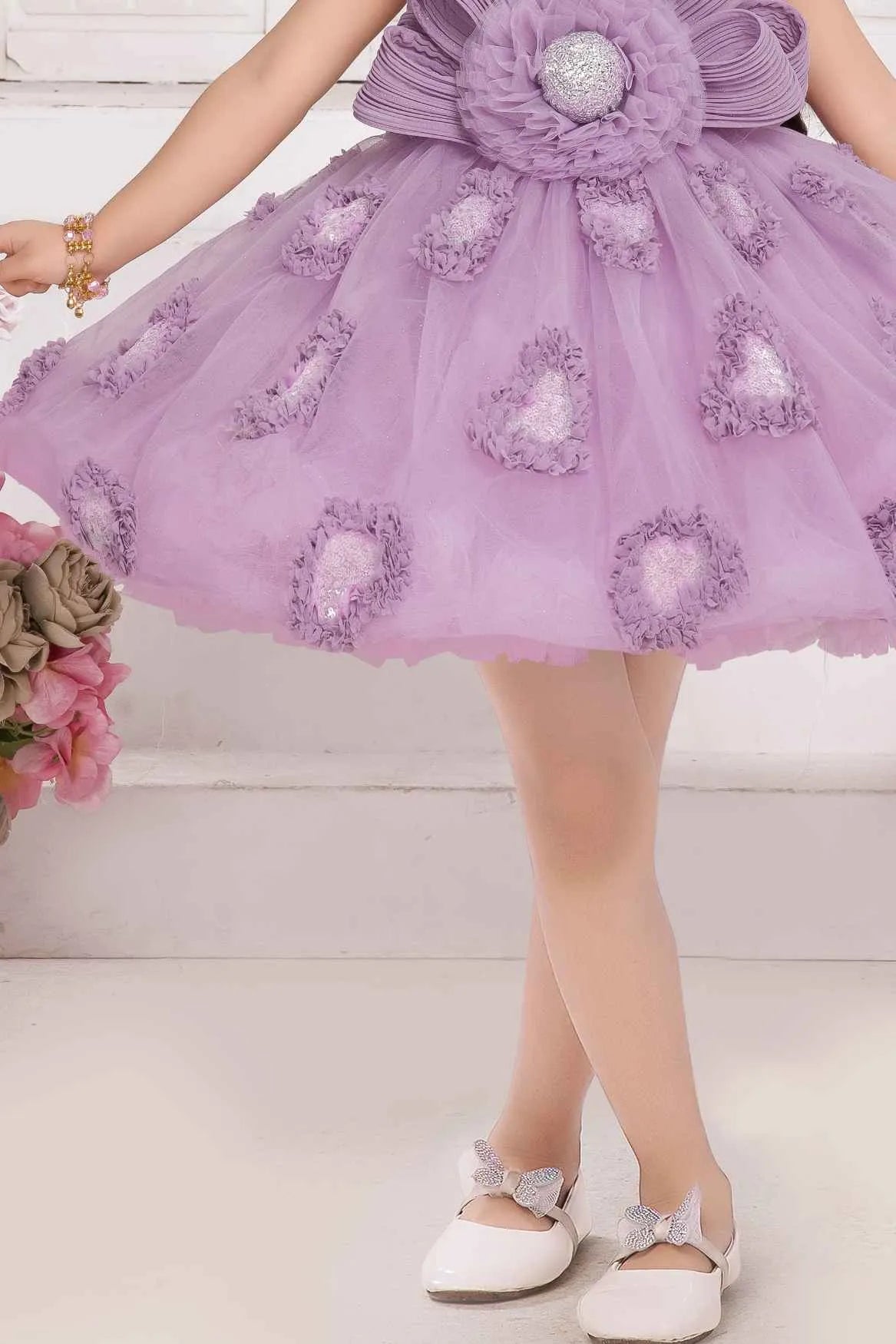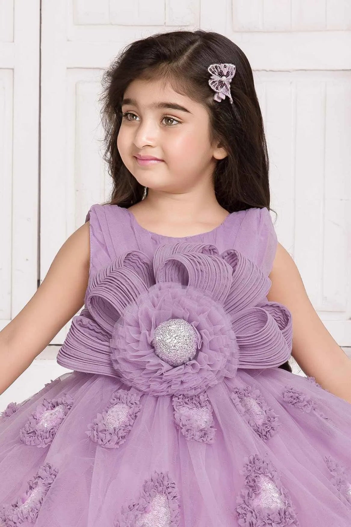 Lavender Floral Embellished Party Wear Frock With Sequin Detailing For Girls