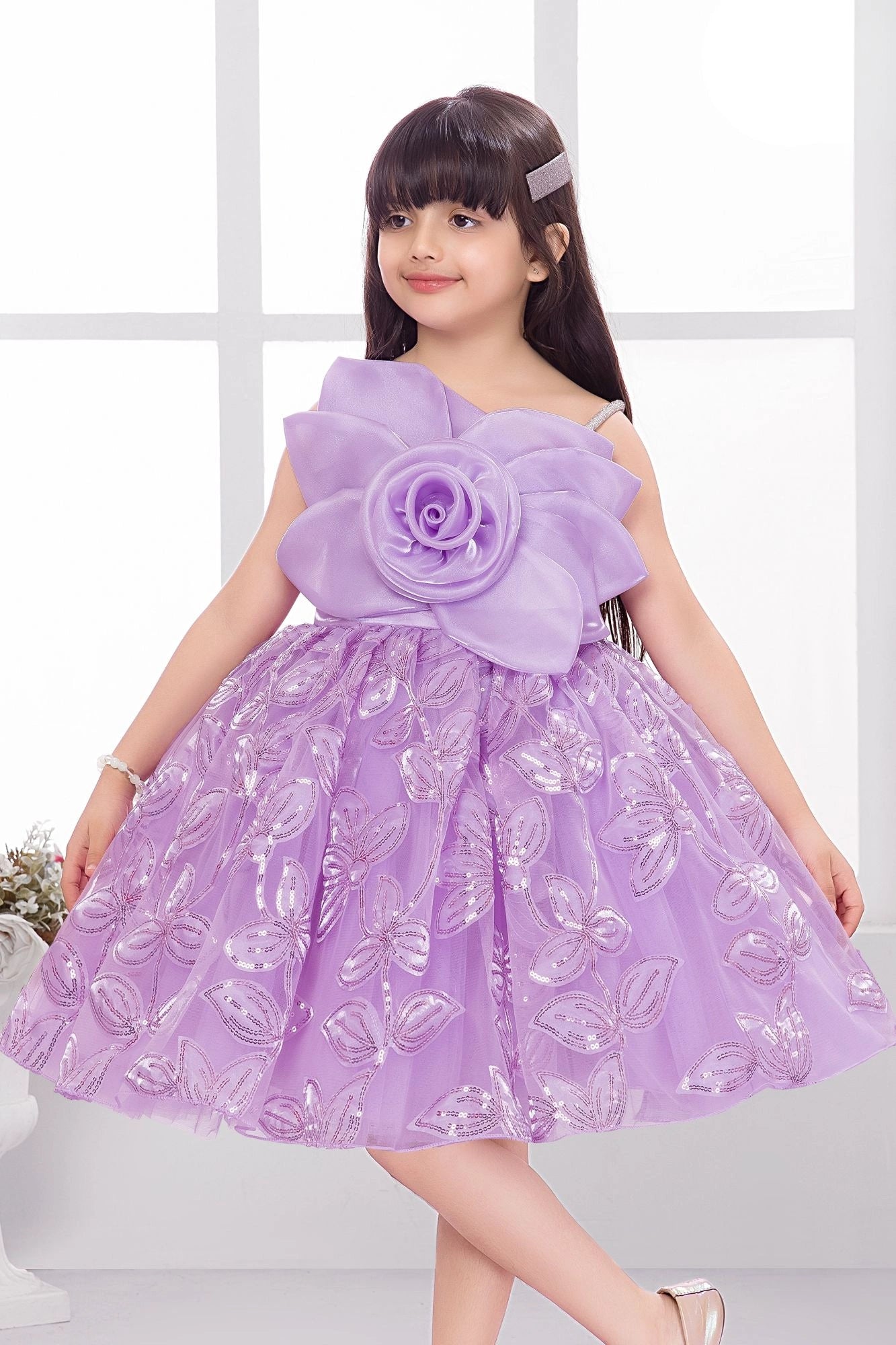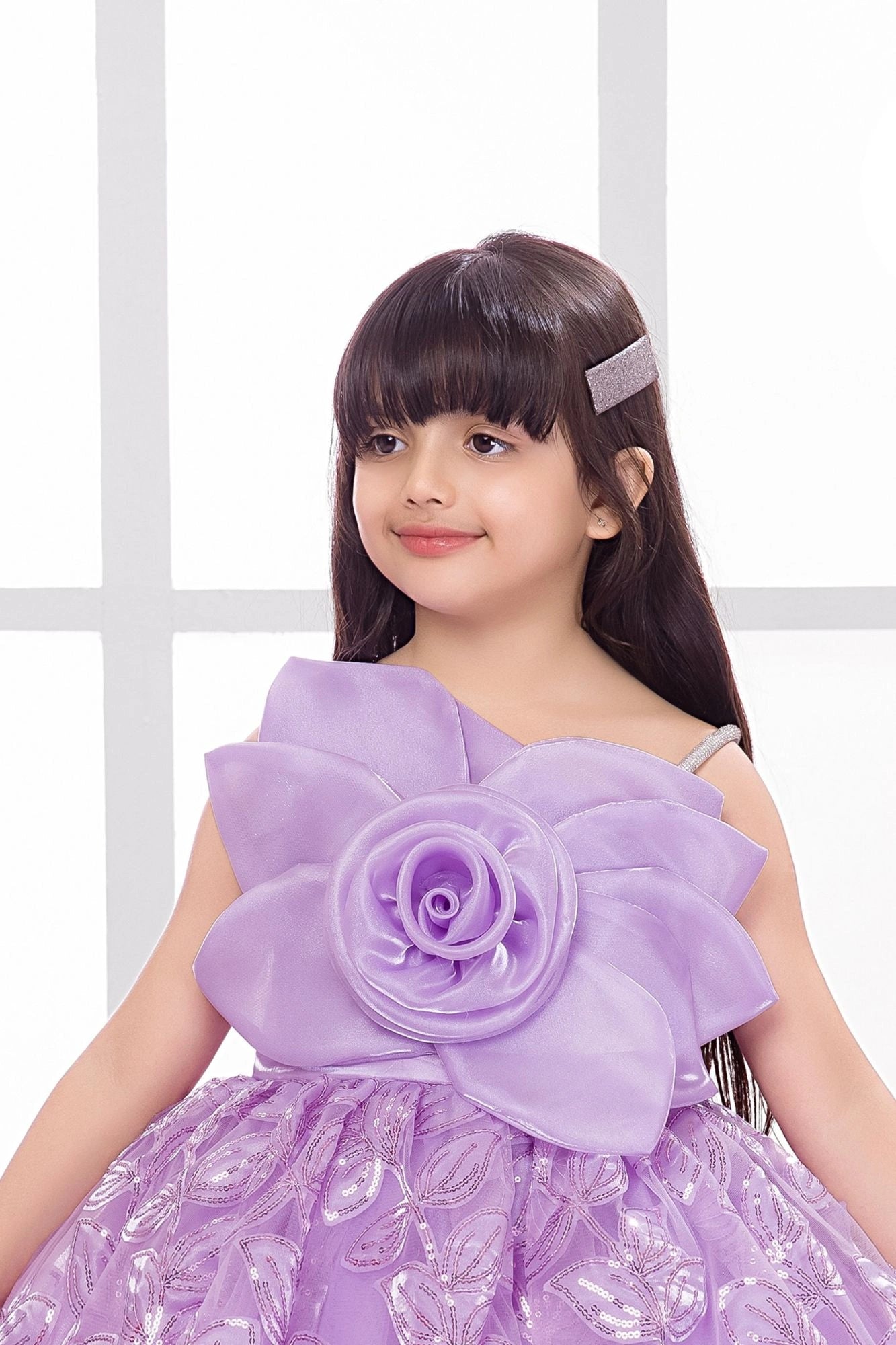 Lavender One-Shoulder Floral Appliqué Party Frock for Girls