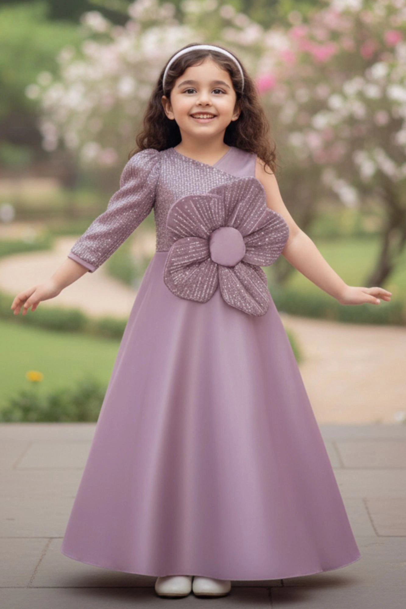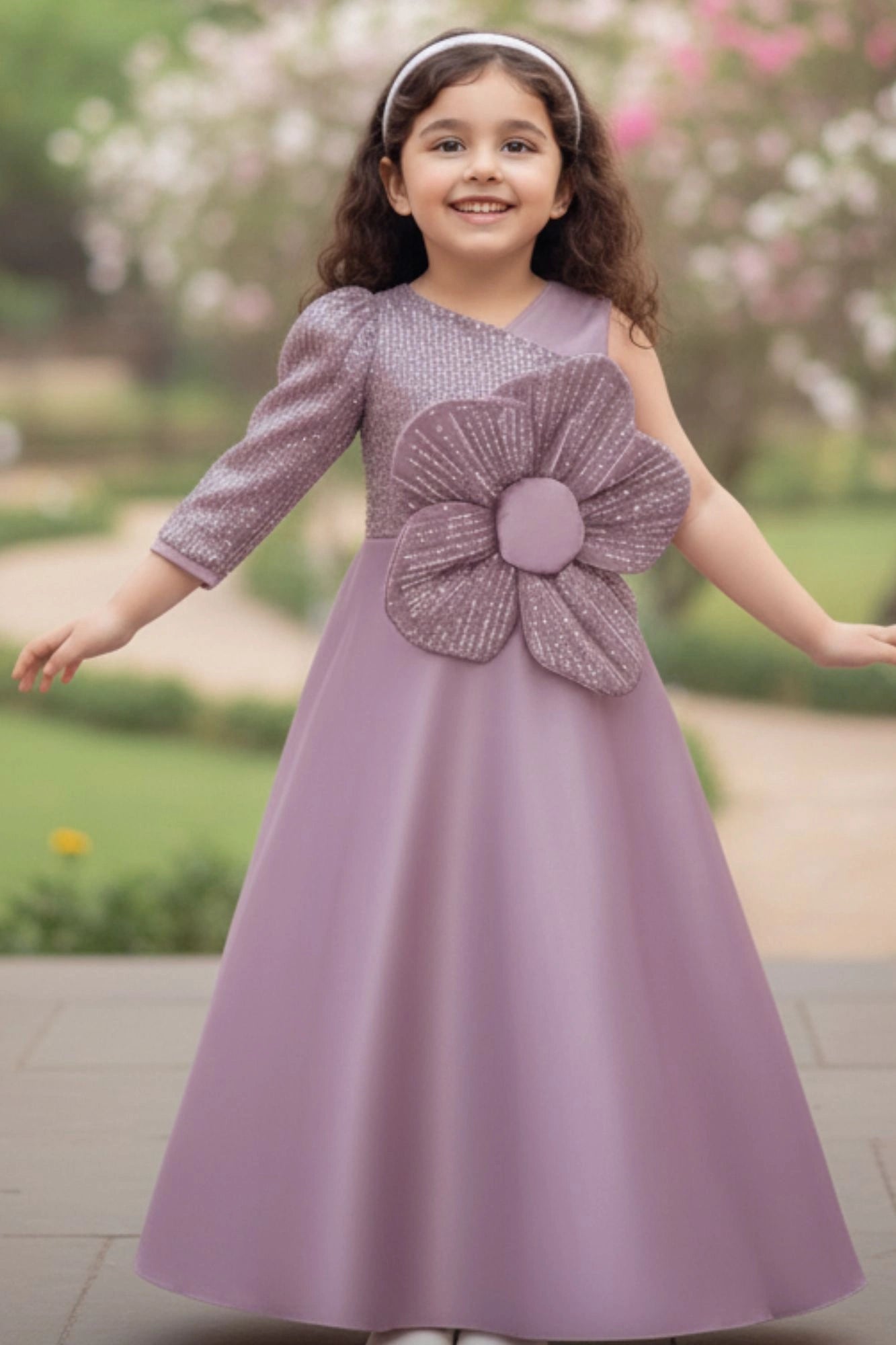 Designer Multilayer Ruffled Maroon Gown With Floral Embellishments For Girls
