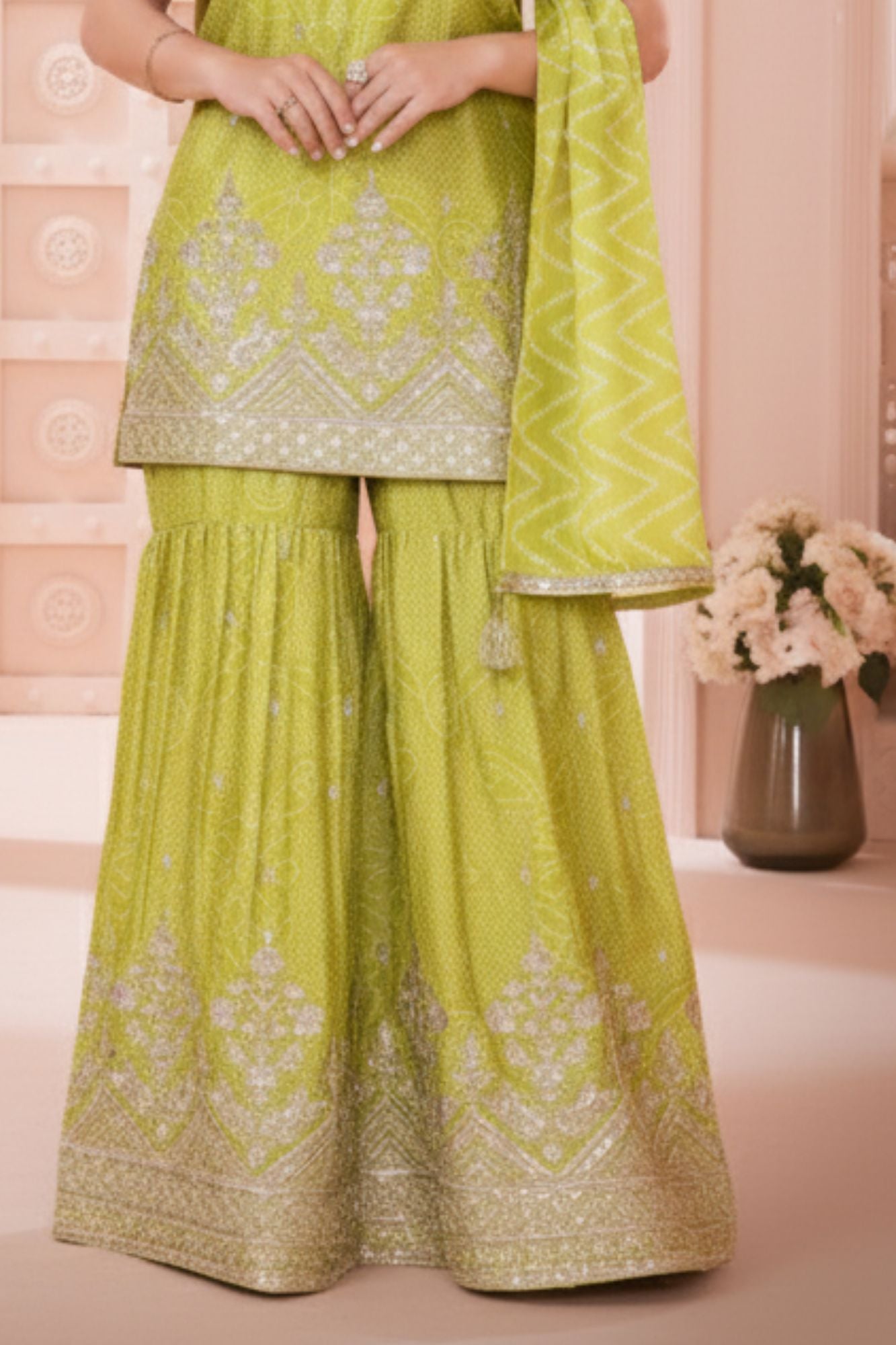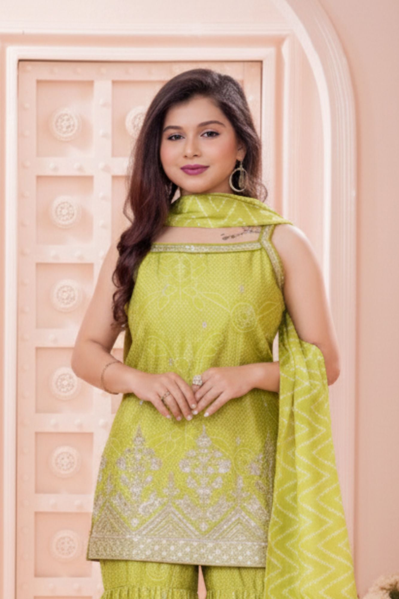 Light Green Bandhani Sharara Set with Dupatta & Golden Embroidery For Girls