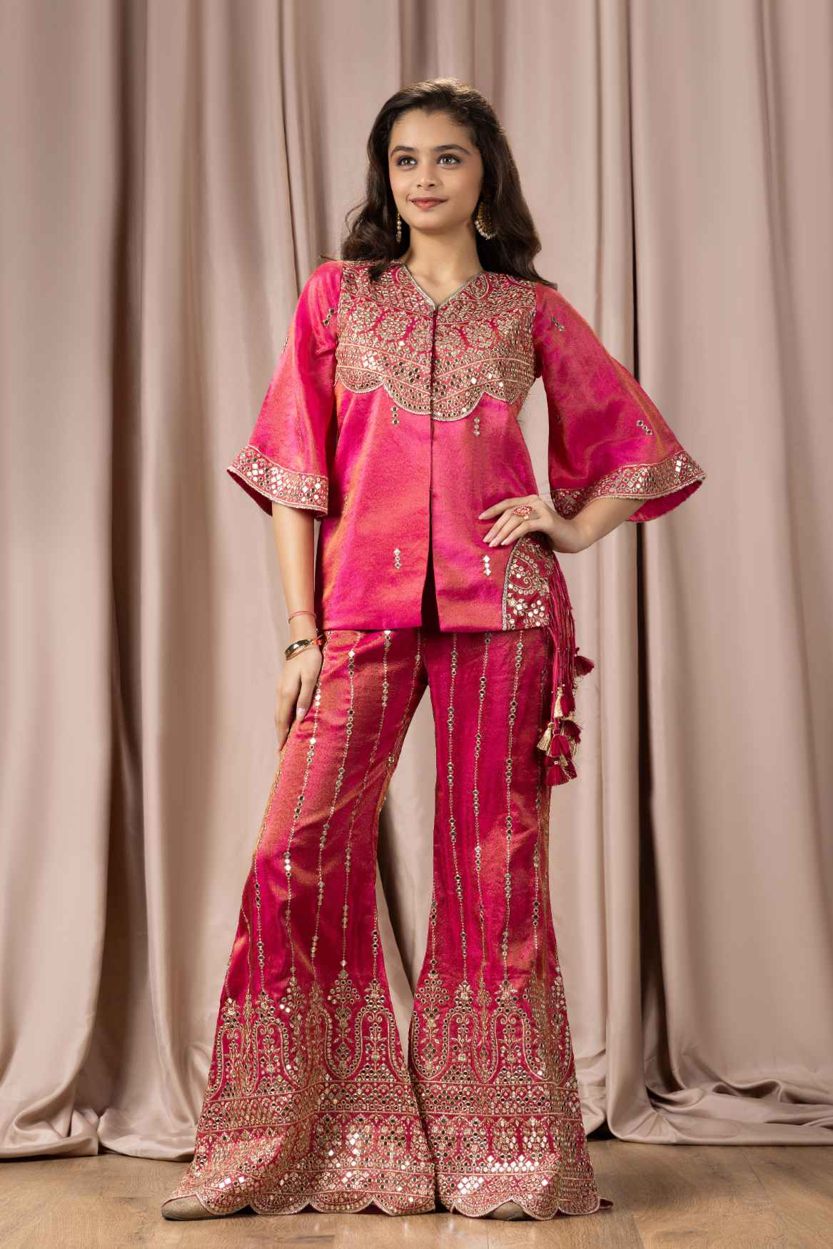 Luxe Pink Mirror Work And Zari Embroidered Palazzo Set For Girls