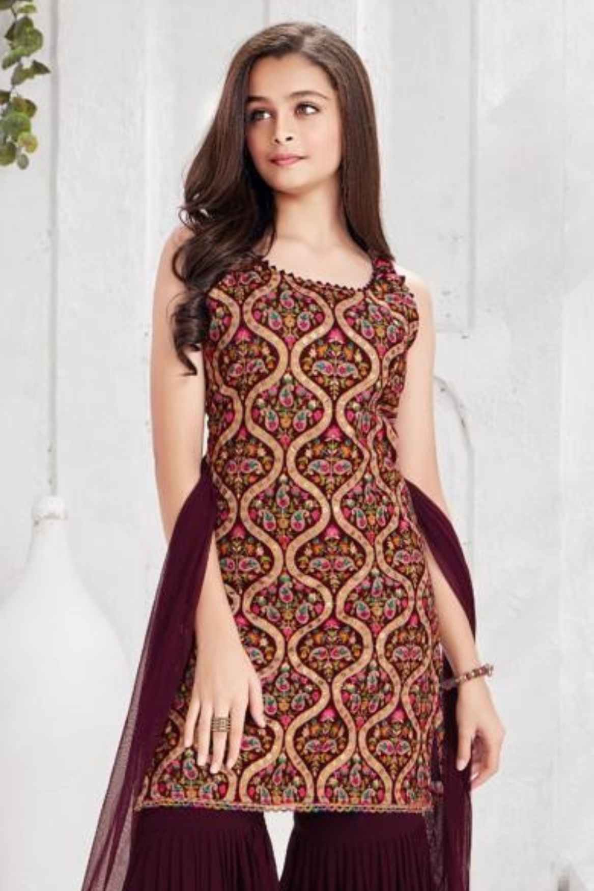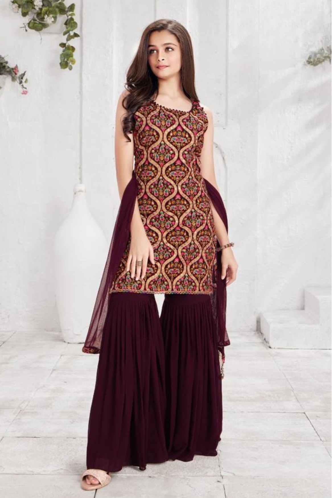 Maroon Embroidered Sharara Set With Sleeveless Kurti For Girls