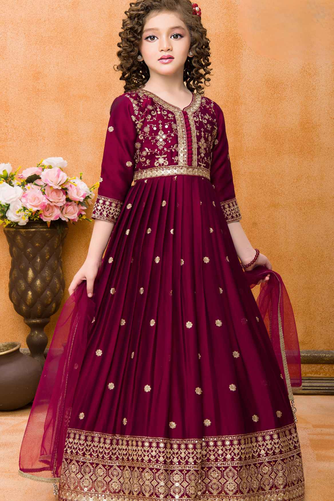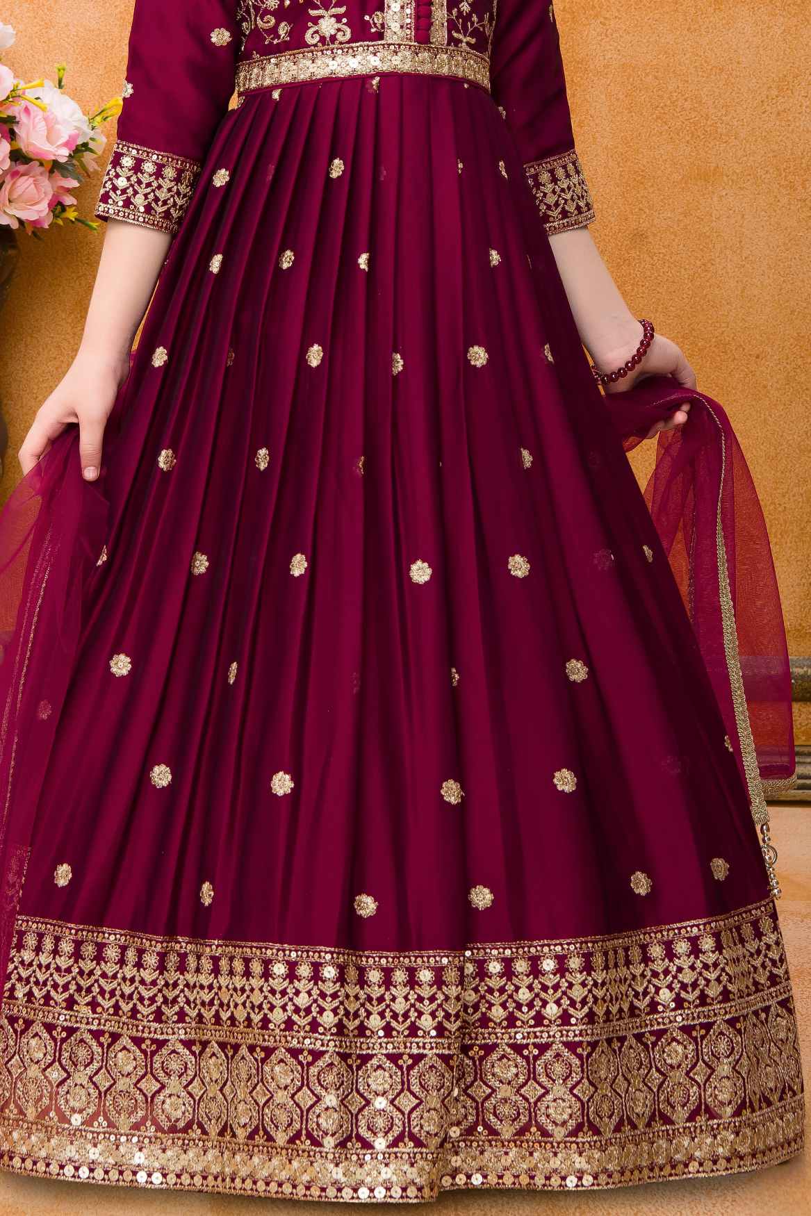 Elevate your little one's ethnic wardrobe with this stunning Maroon Sequins Work And Zari Embroidered Ethnic Gown. The intricate sequin work and zari embroidery add a touch of glamour to the traditional design. Perfect for special occasions, this gown will make your little girl feel like a princess.