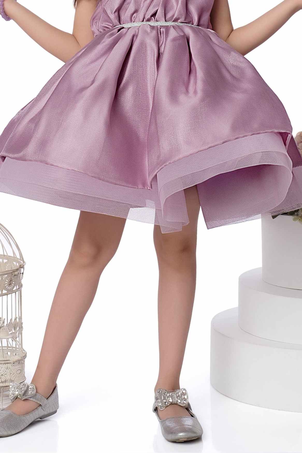 Make your little girl shine at any party with this mauve frock embellished with a beautiful bow and intricate stone work. Perfect for a princess, this party wear frock is both stylish and comfortable. Elevate her style and confidence.