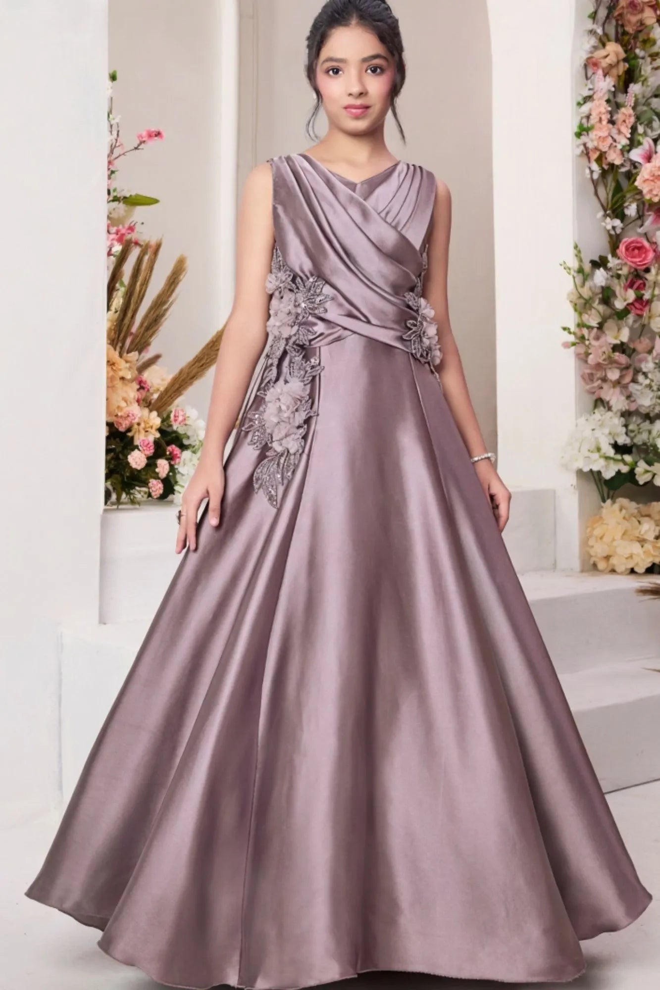 Lavender Embroidered Long Ethnic Gown with Dupatta For Girls