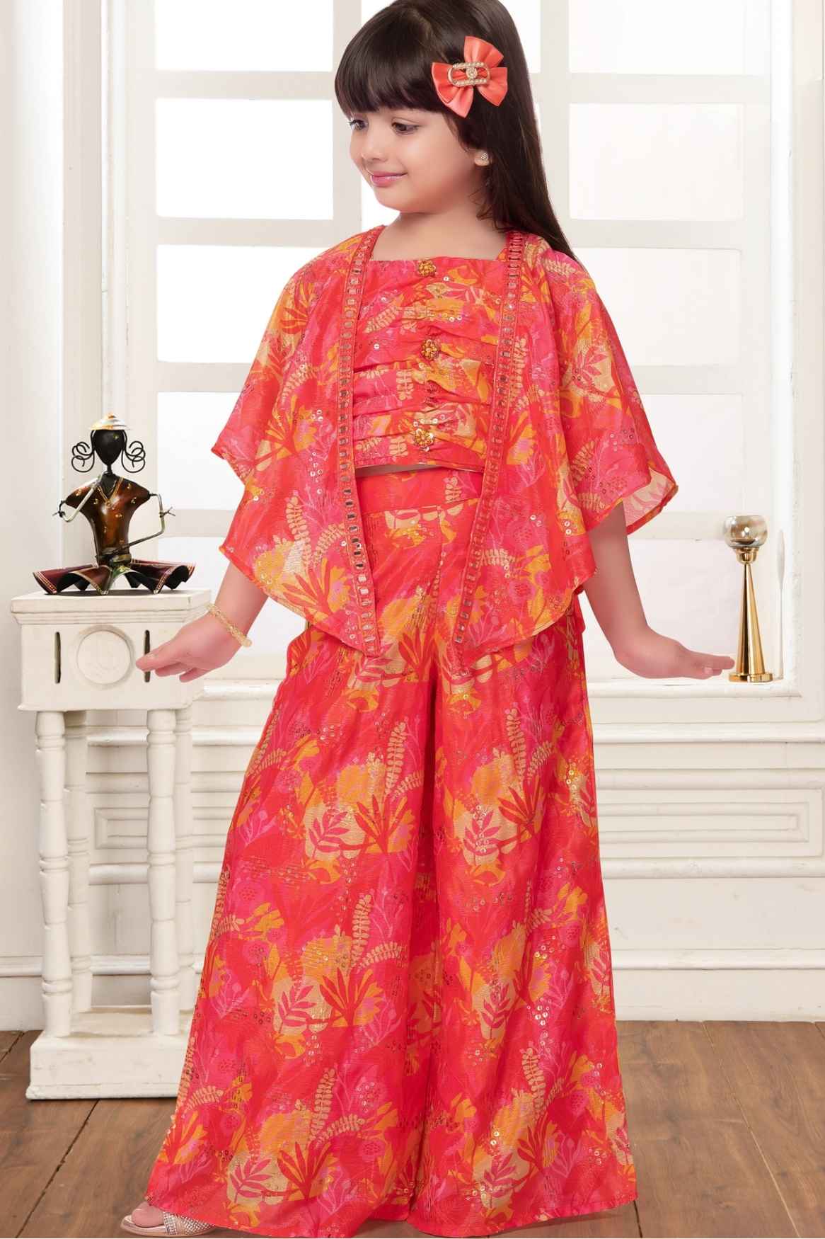 Multicolor Sequined Top And Palazzo Set With Overcoat For Girls