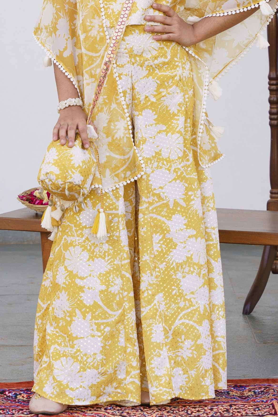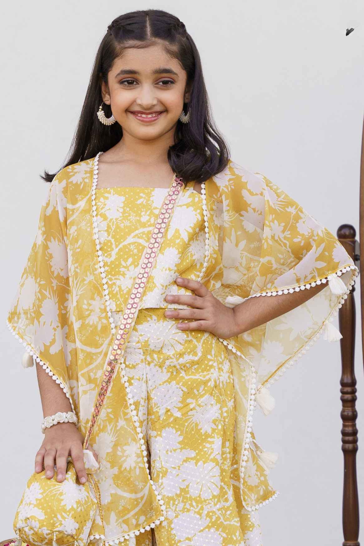 Mustard Printed Co Ord Set With Crop Top With Potli Bag For Girls