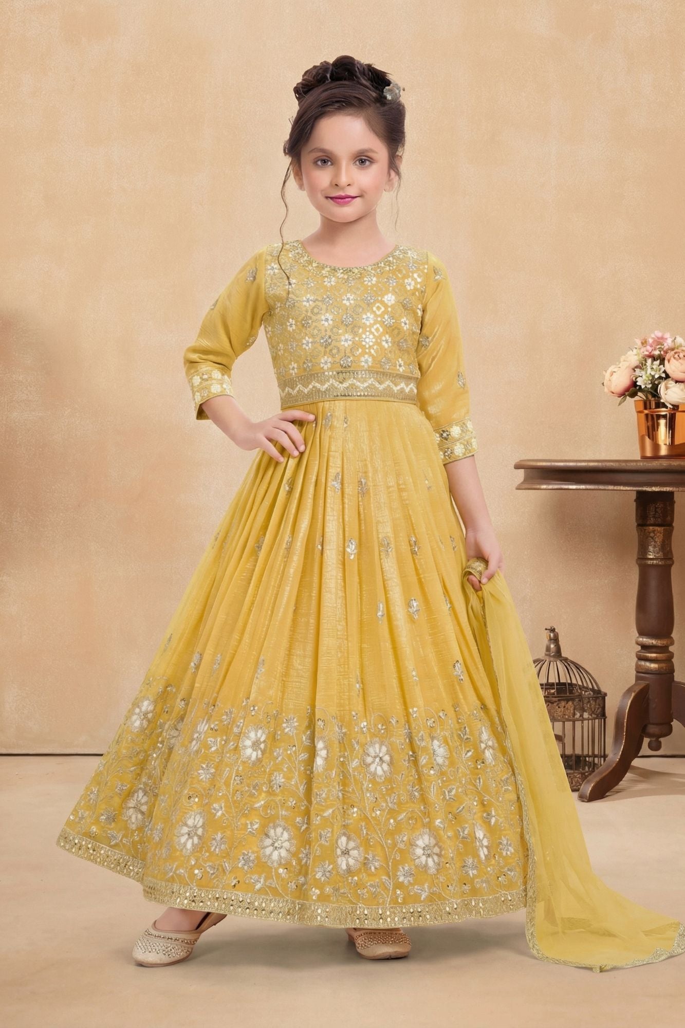 Mustard Yellow Embroidered Ethnic Gown with Dupatta For Girls