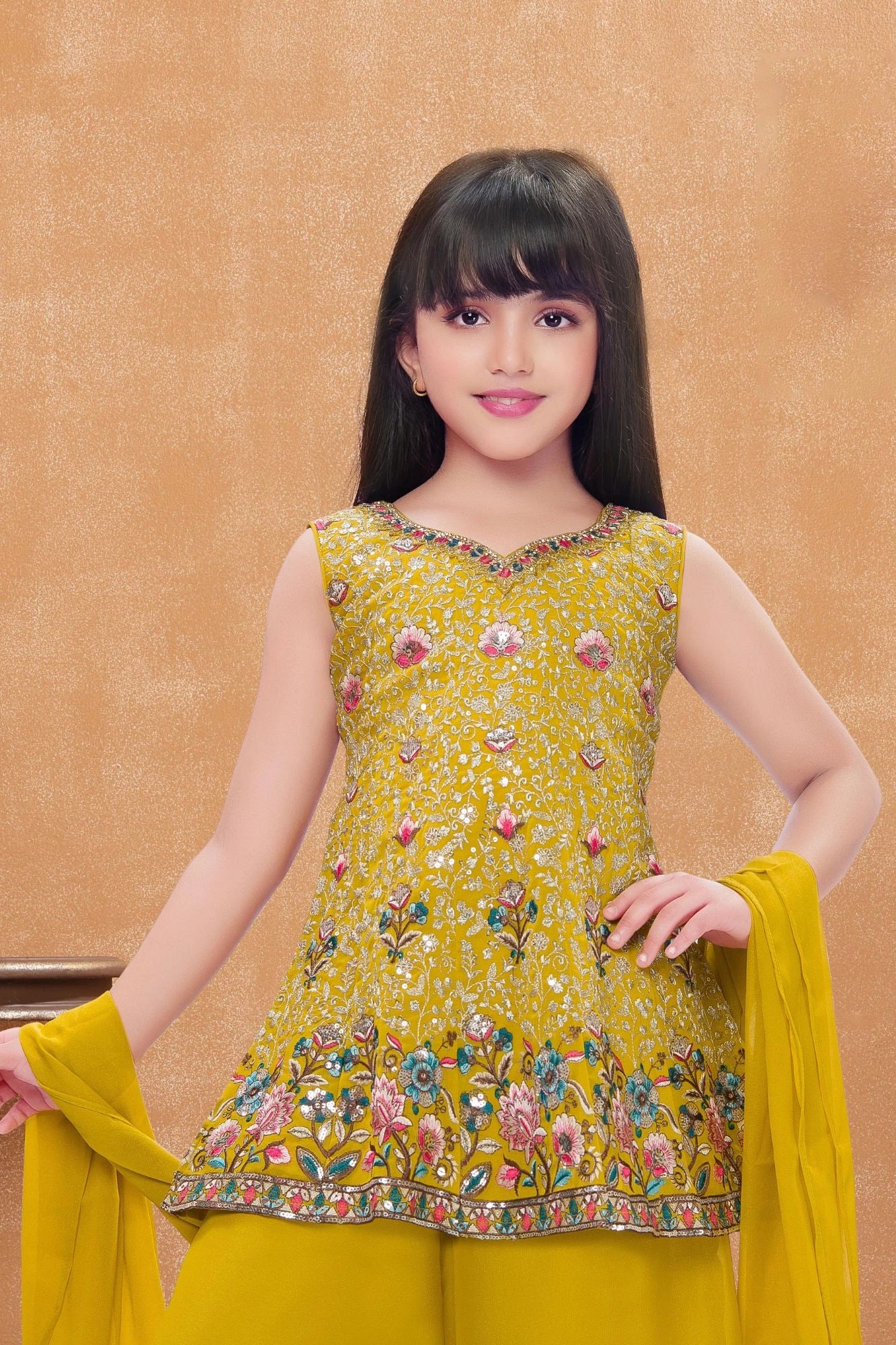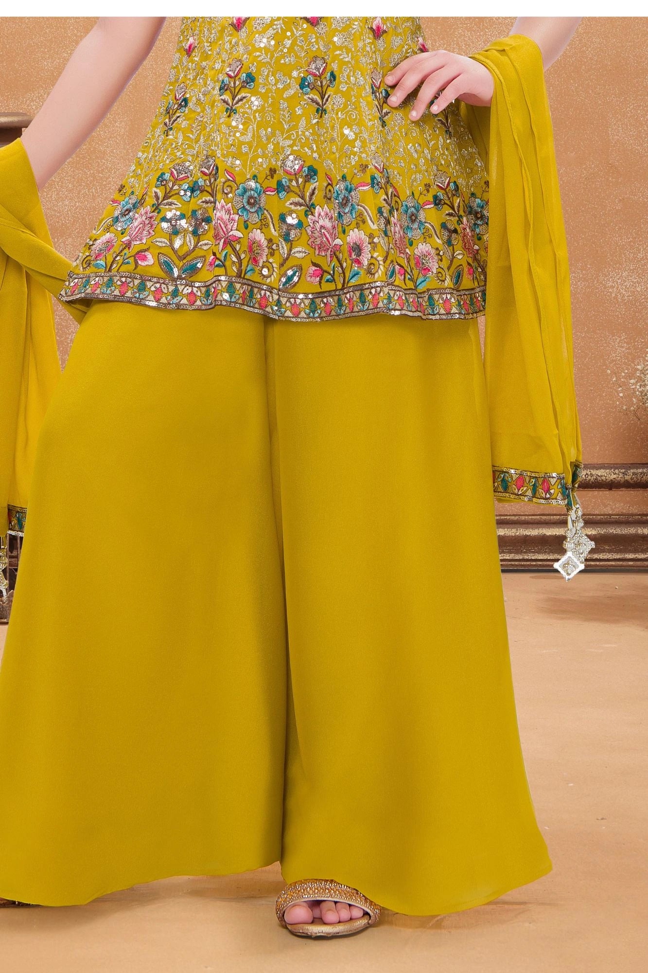 Mustard Yellow Embroidered Palazzo Set with Dupatta For Girls