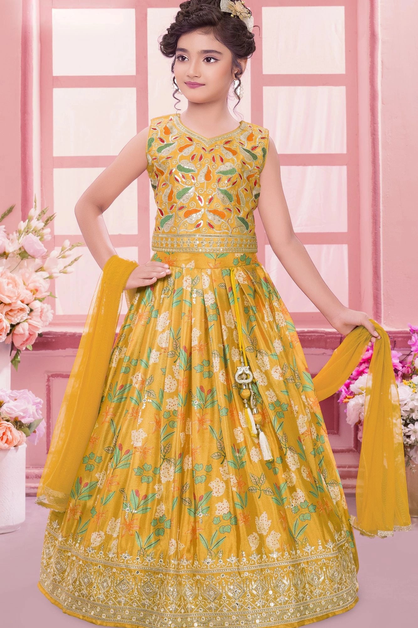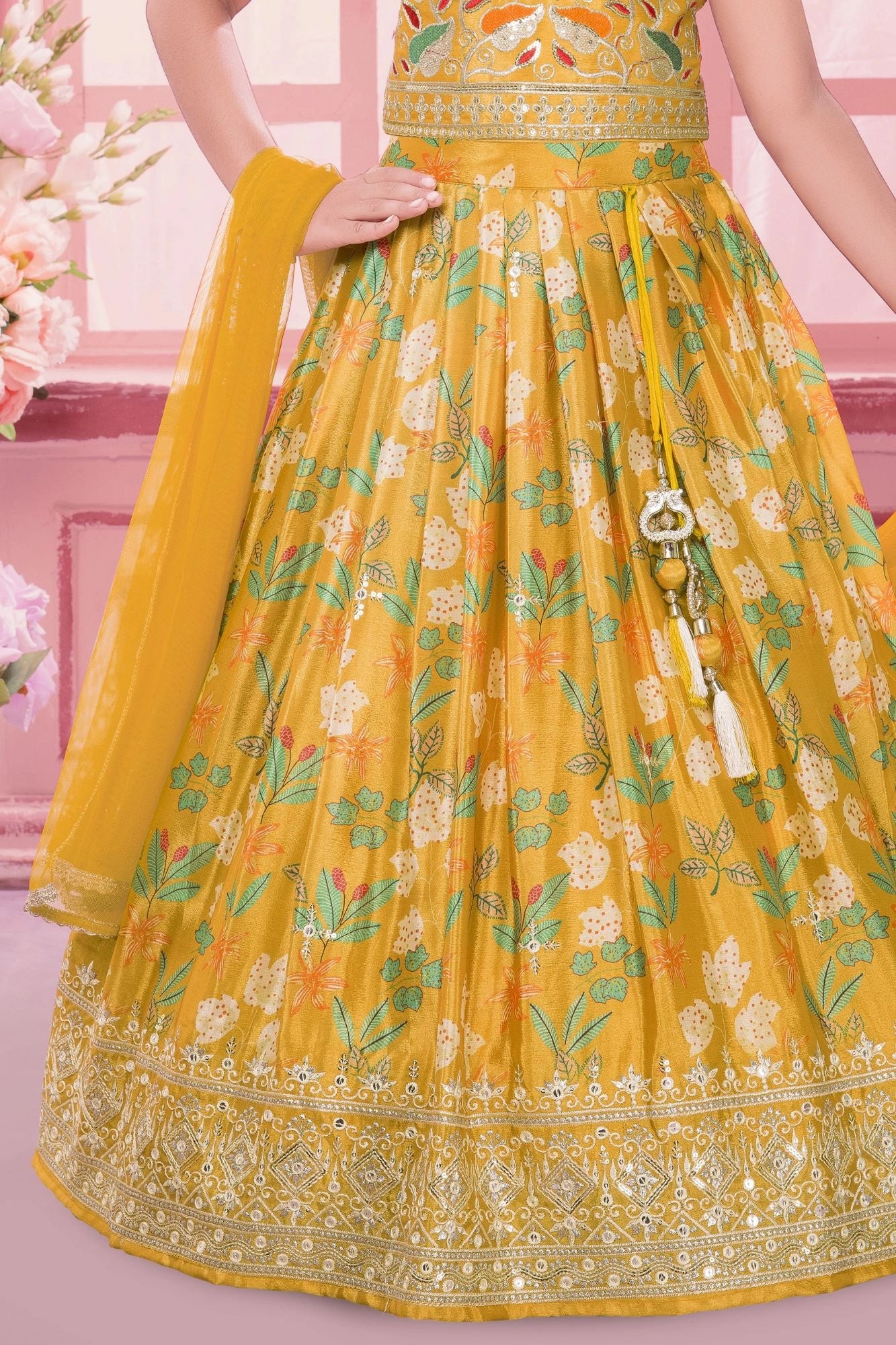 Mustard Yellow Embroidered Silk Lehenga Choli with Dupatta For Girls
