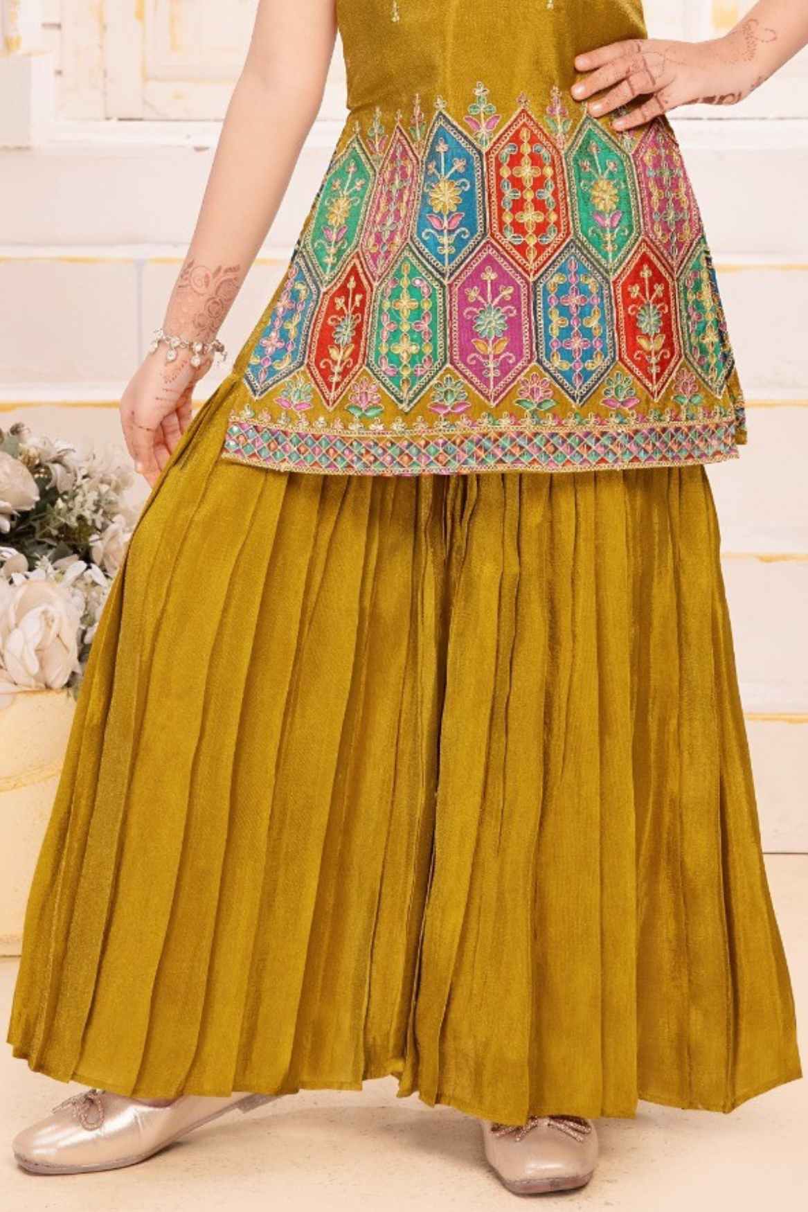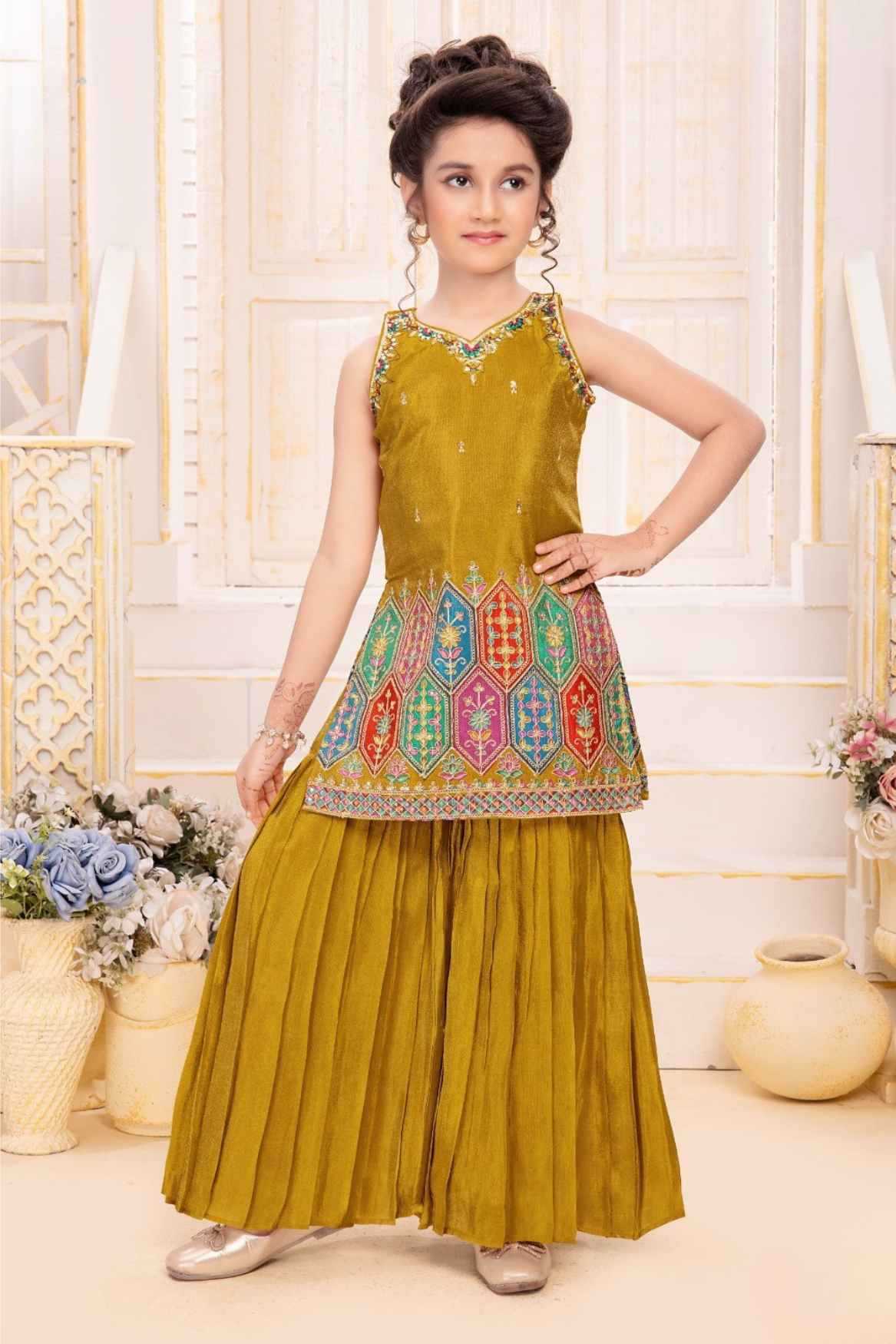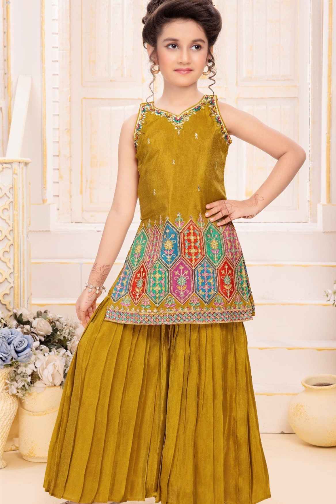 Mustard Zari Embroidered And Sequins Palazzo Set For Girls