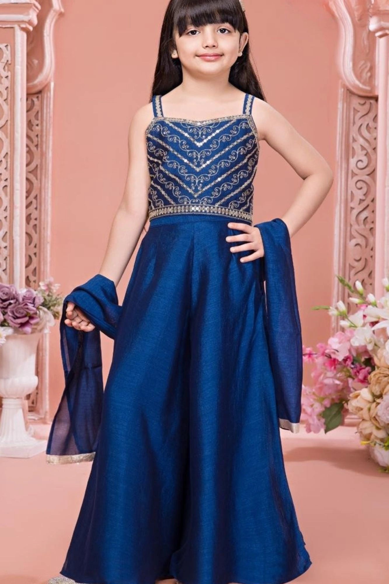 Navy Blue Embroidered  Palazzo Set With Dupatta For Girls