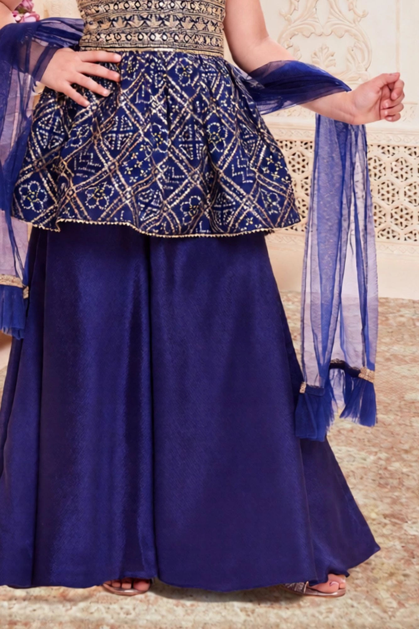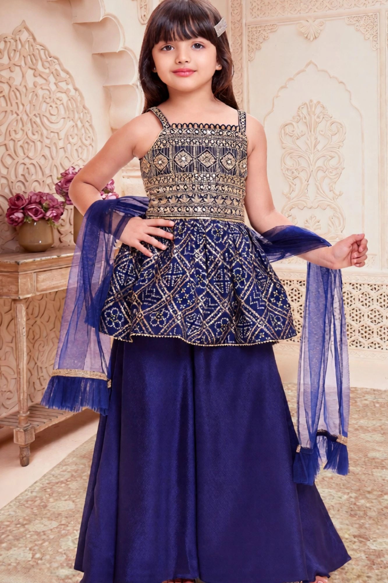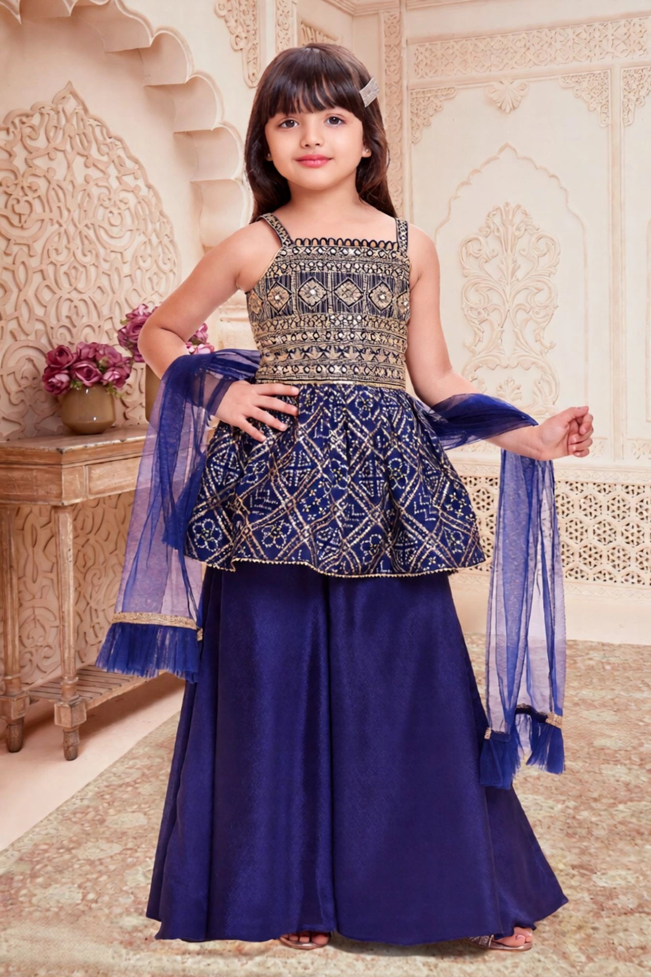 Navy Blue Embroidered Peplum Top Palazzo Set for Girls